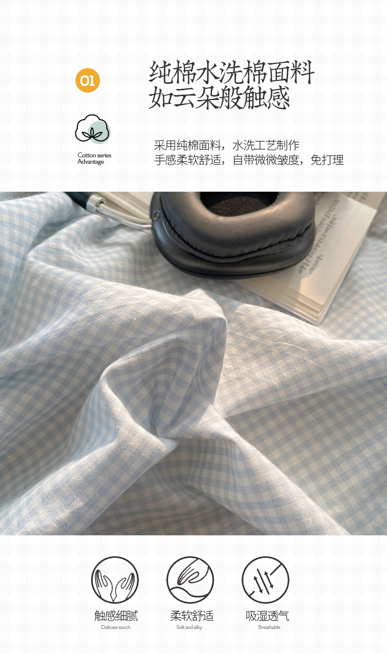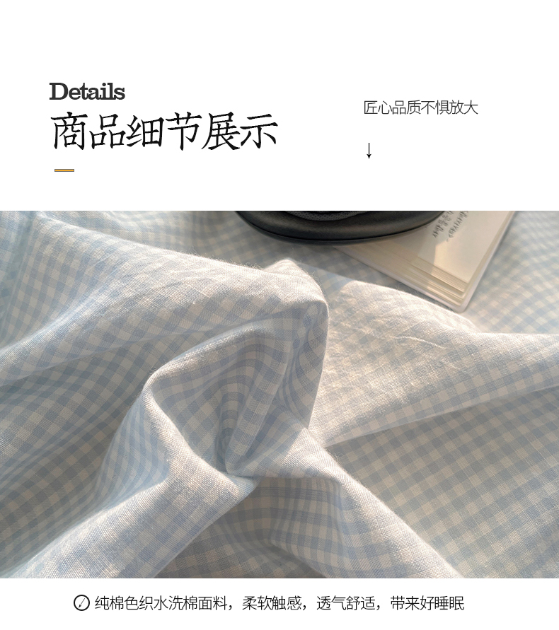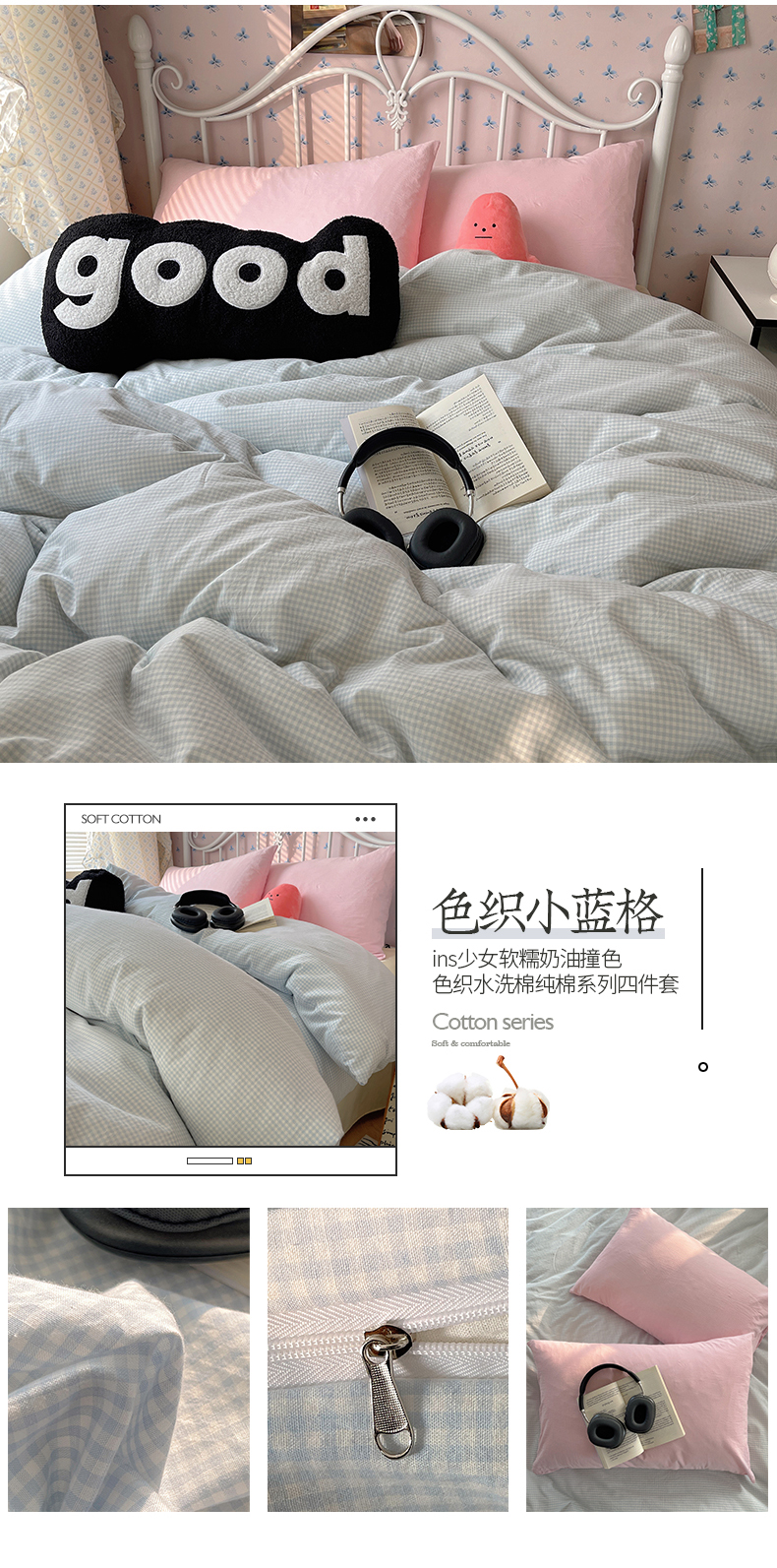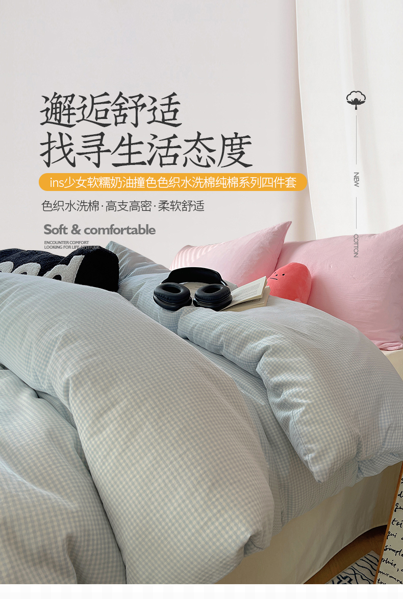 商品名称:桃子家居 2024新款ins少女软糯奶油撞色色织水洗棉纯棉系列四件套 水洗棉-色织小蓝格