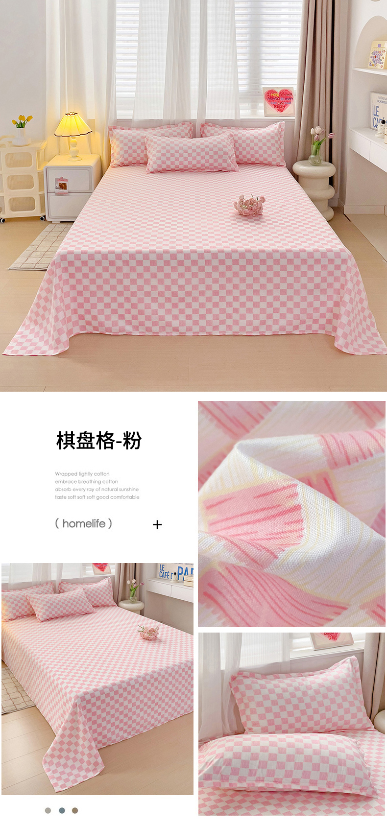 楠沐家纺 2025年新款亲肤水洗棉芦荟棉印花床单系列 棋盘格-粉
