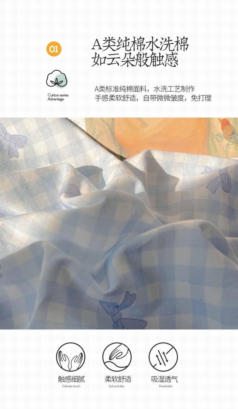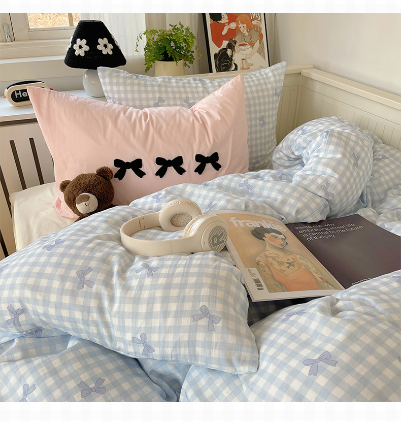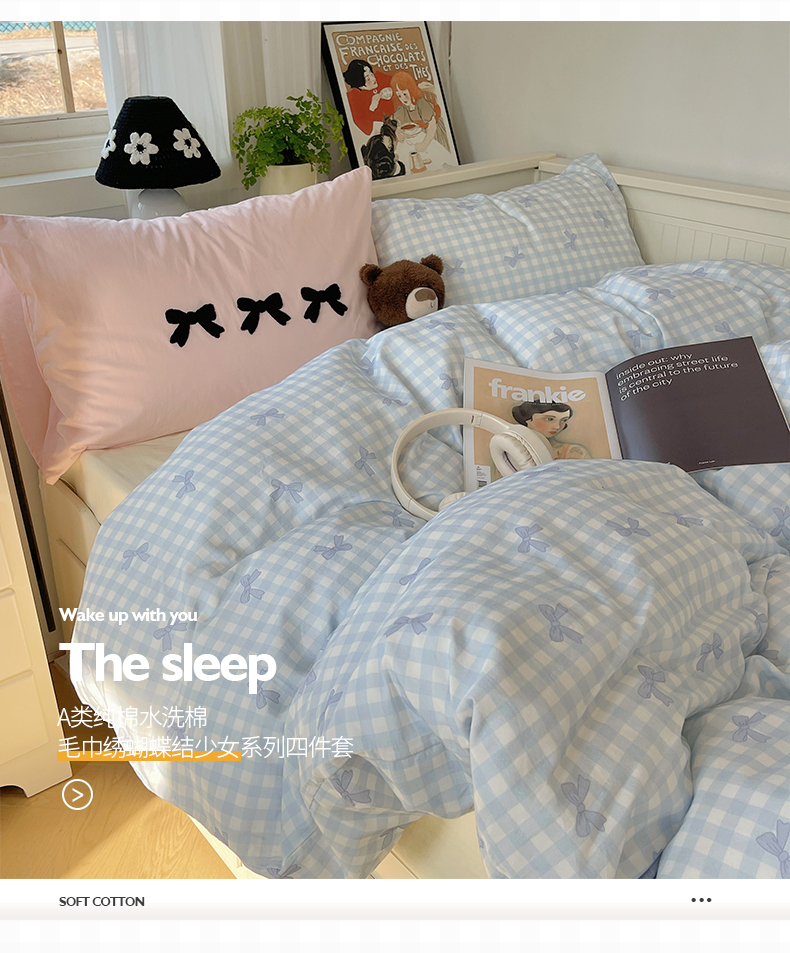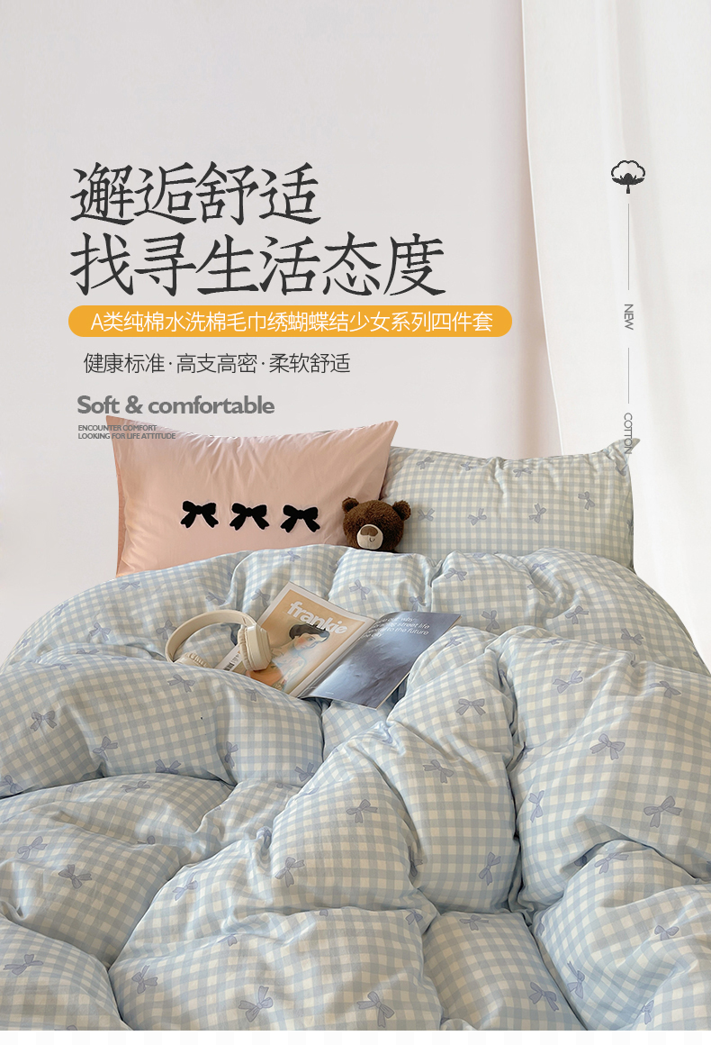 当前位置: 91家纺网 > 商品网购 > 床品套件 > 四件套 > 全棉普通四件套 > 桃子家居 2024新款A类纯棉水洗棉毛巾绣蝴蝶结少女系列四件套 水洗棉-蝴蝶结蓝蓝+黄粉