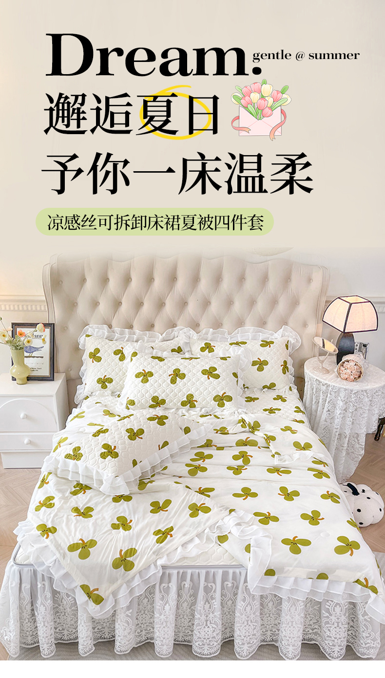 (总)虹星家纺 2024新款凉感丝印花可拆床裙套件-夏被凉席四件套,初禾绿,仙女粉,三叶星草,叶语浪漫,天空蓝,悠情假日,月光灰,柔丝曼舞,梦境幻影,欧式雅韵,繁花集序,罗马之恋,花花梦境,花语自然,迷幻时空,静悠香阁