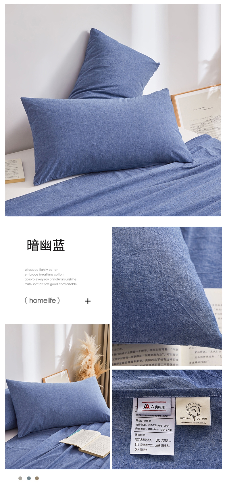 商品名称:雅萱家纺 2024新款A类色织全棉水洗棉单枕套 暗幽蓝