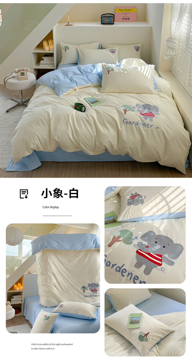 眠屿家纺 2024新款40支全棉水洗棉平绣绣花四件套 小象-白