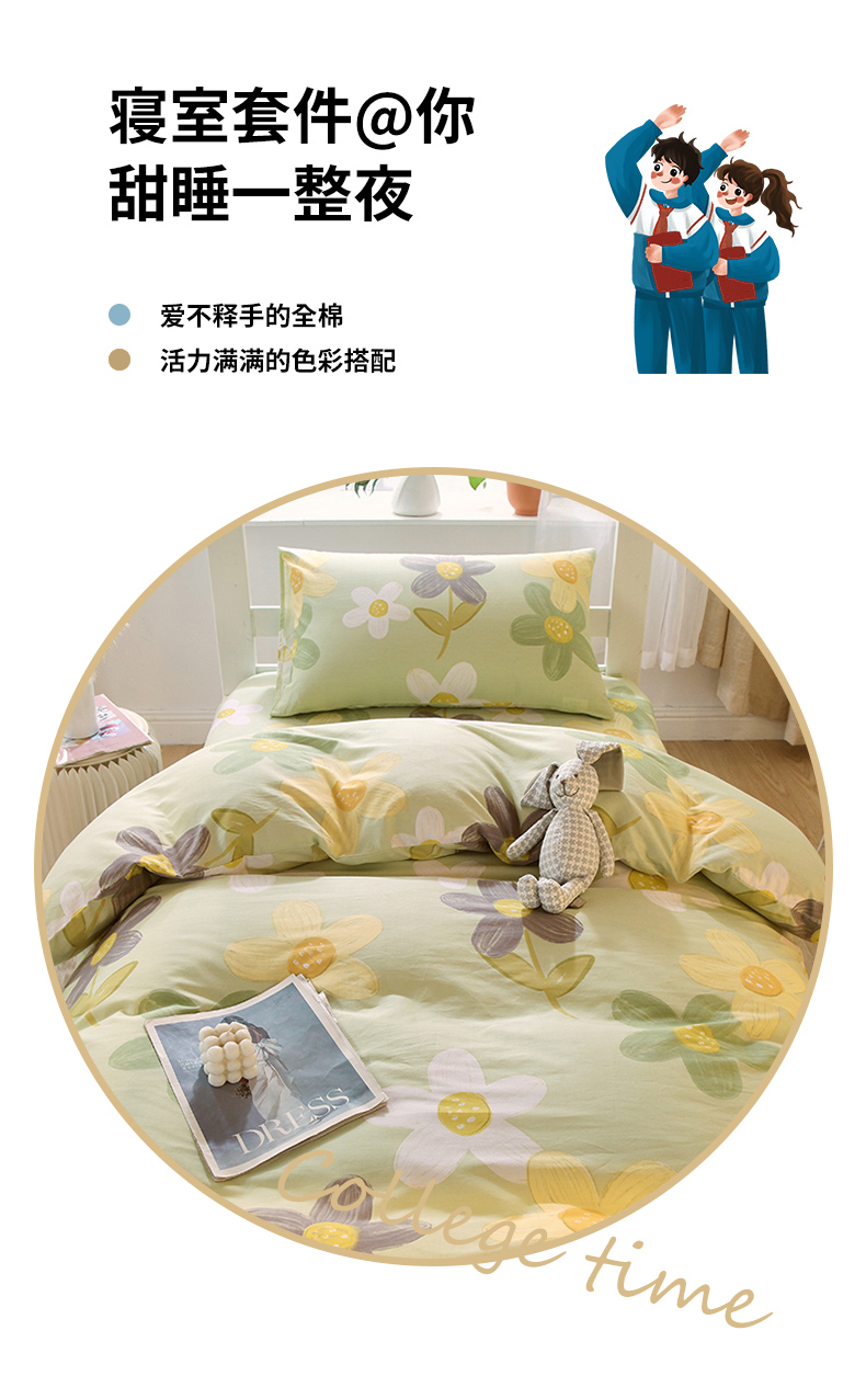 当前位置: 91家纺网 > 商品网购 > 床品套件 > 三件套 > 金鑫汇家纺 2024新款全棉宿舍印花三件套第一批 五彩缤纷
