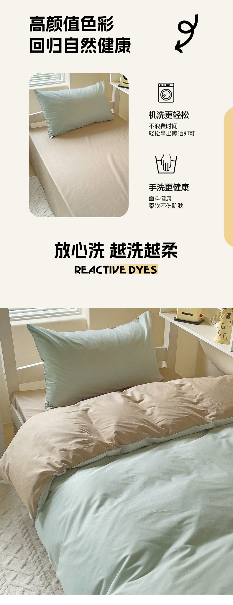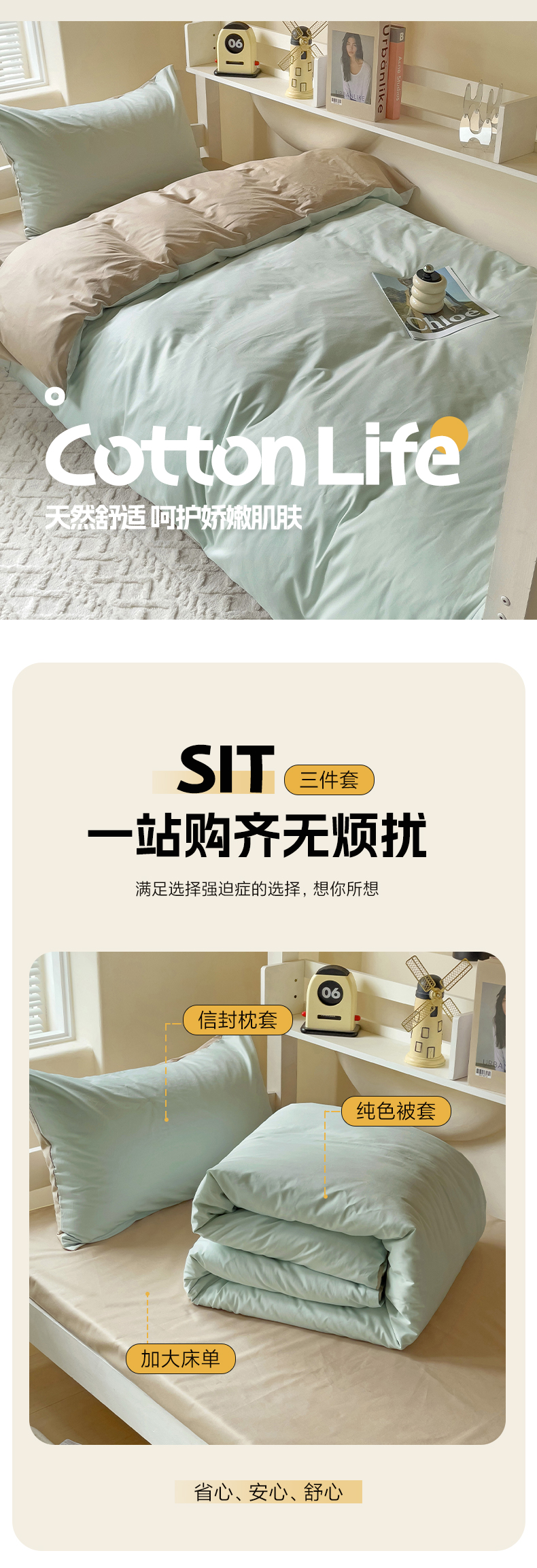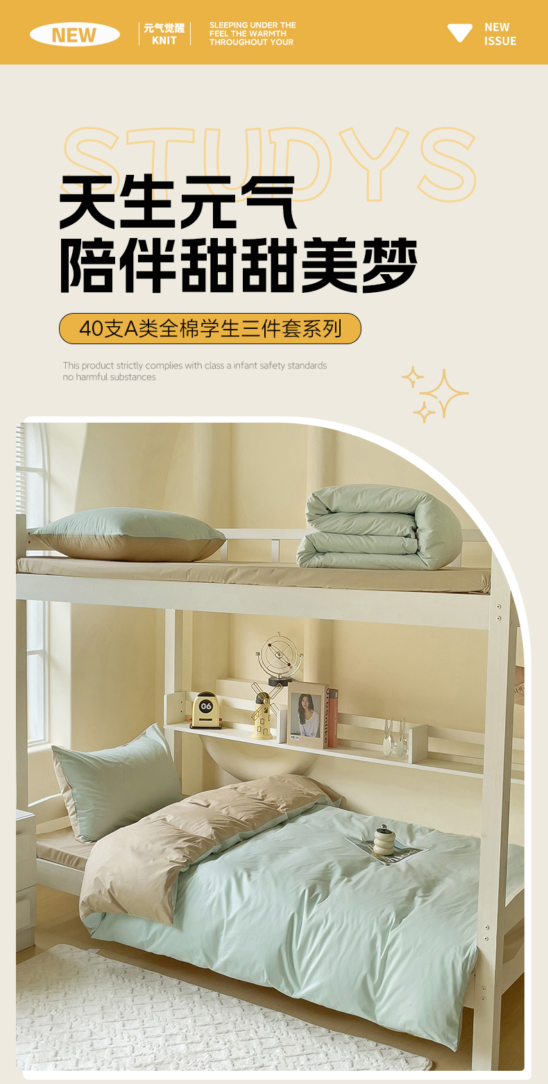 当前位置: 91家纺网 > 商品网购 > 床品套件 > 三件套 > 泽西家纺 2024新款A类加密全棉40支13376简约风大学生宿舍双拼纯色纯棉三件套 浅绿+卡其