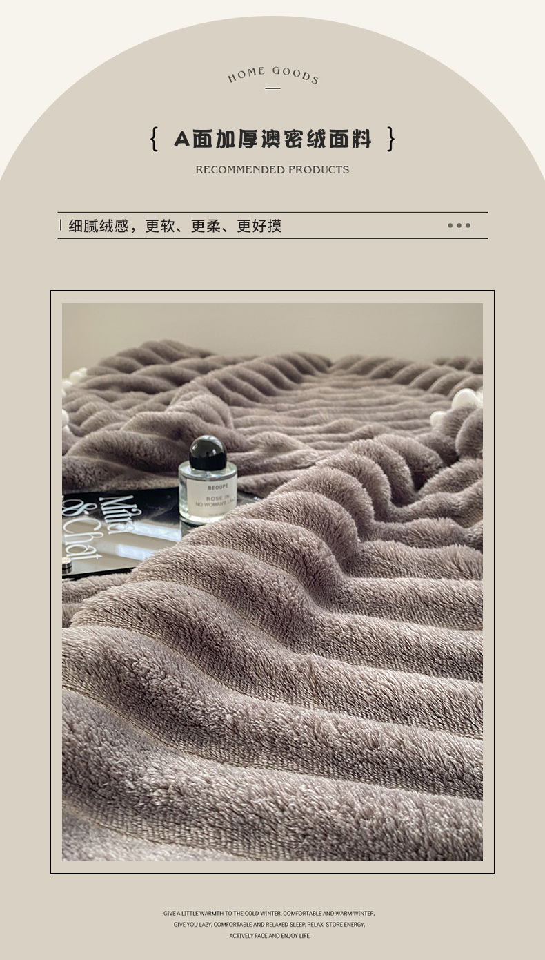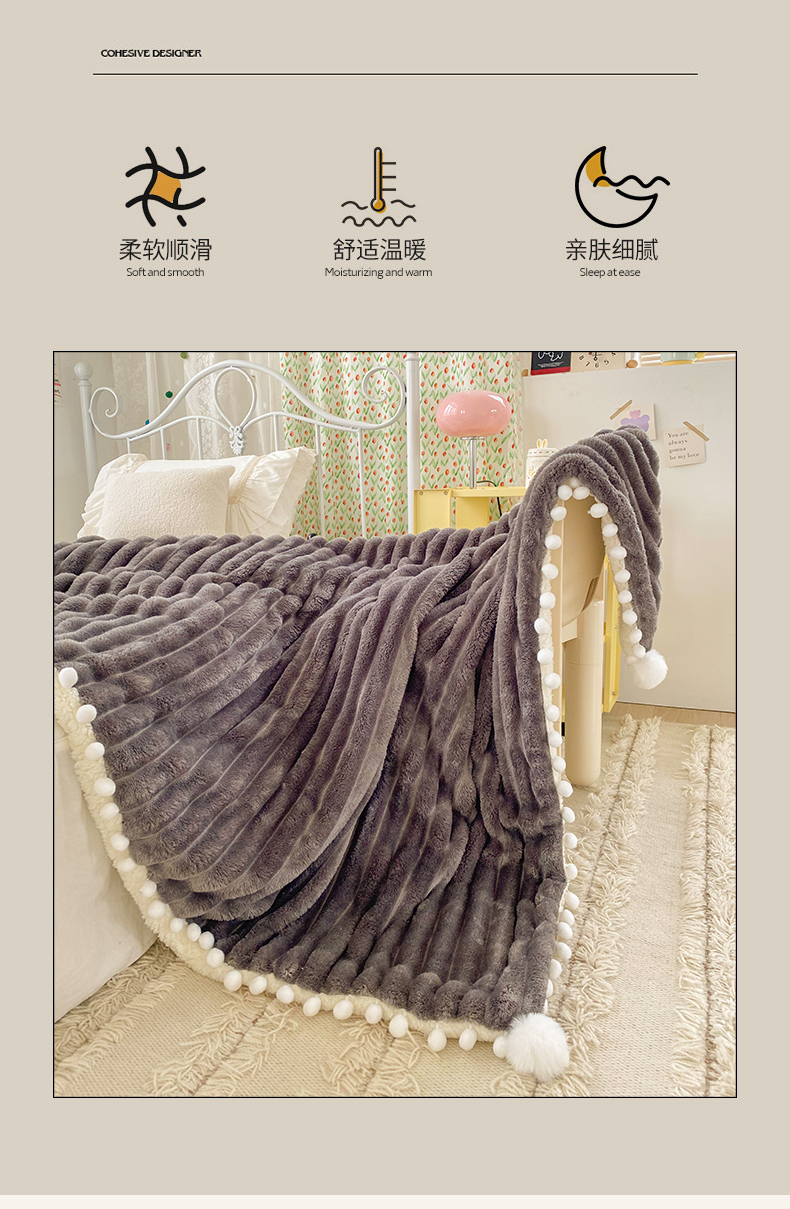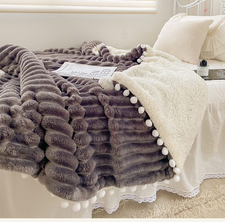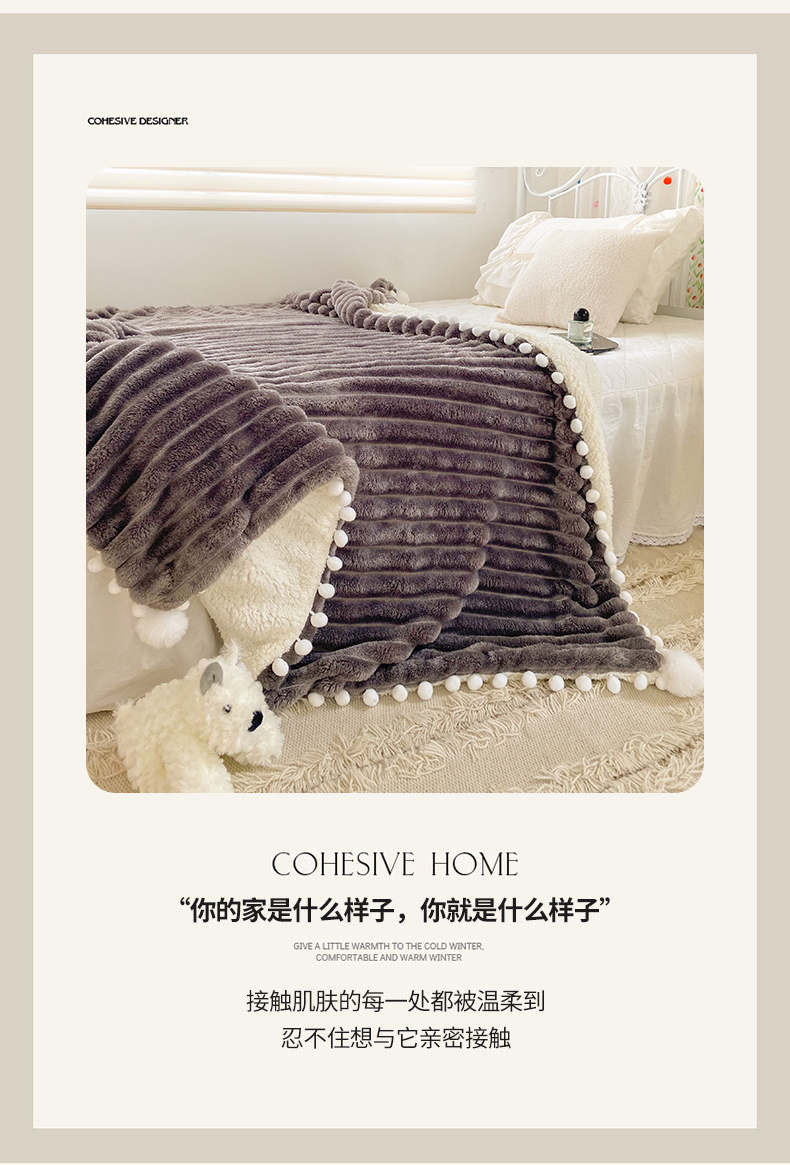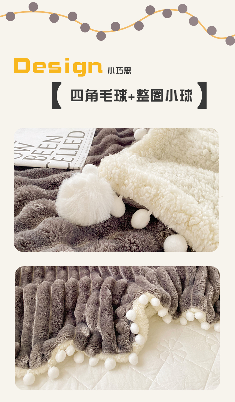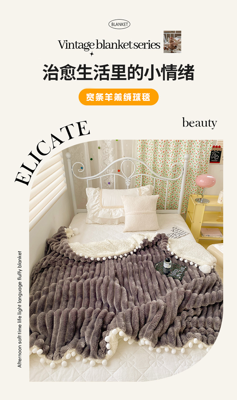 商品名称:潮邦创意家居 2025新款340G 4.5公分大抽条配羊羔绒立体工艺绒毯毛毯盖毯可供跨境电商可压缩 宽条球毯高级灰