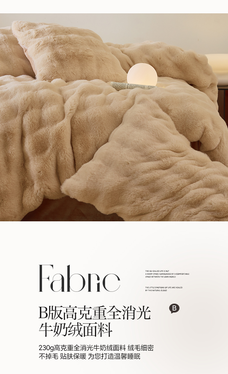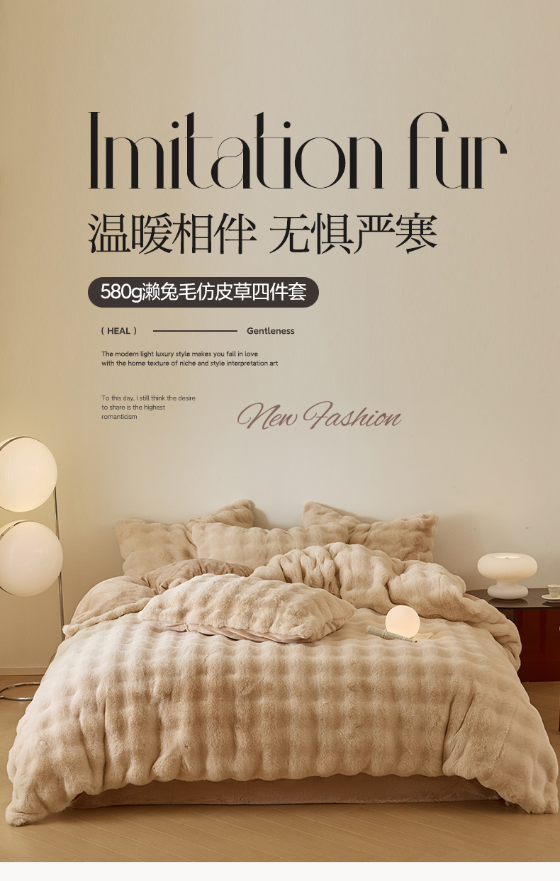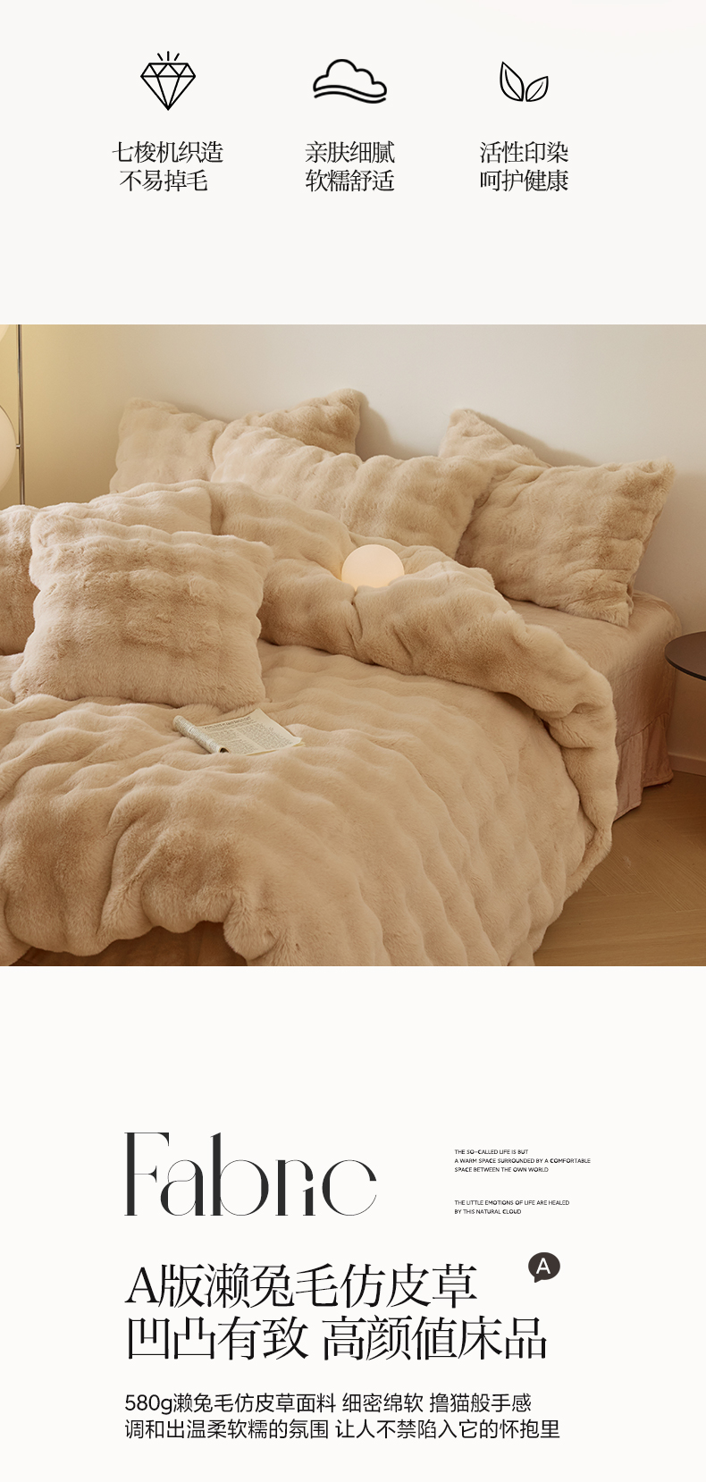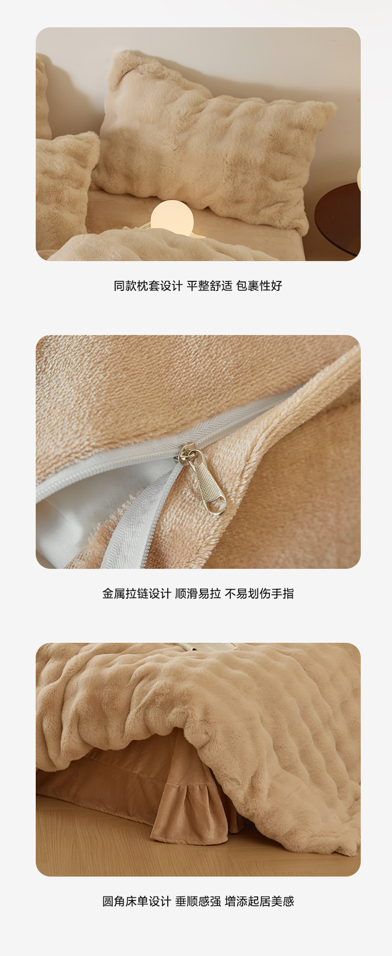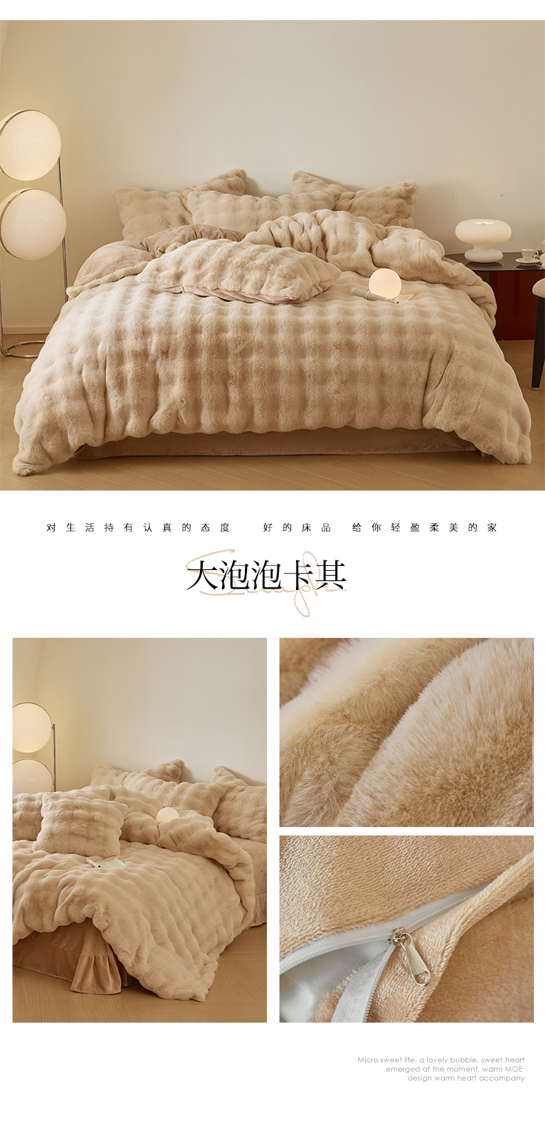 当前位置: 91家纺网 > 商品网购 > 床品套件 > 四件套 > 牛奶绒四件套 > 铠畅家纺 2024新款直播爆款高端A类獭兔毛立体剪花牛奶绒四件套 纯色大泡泡卡其
