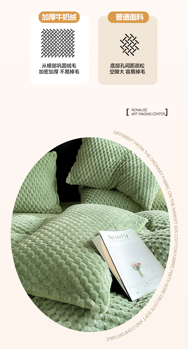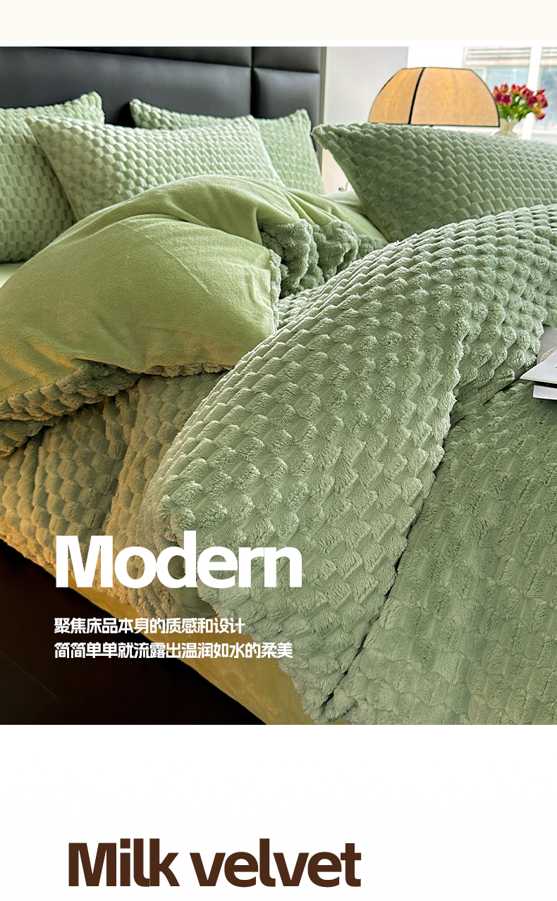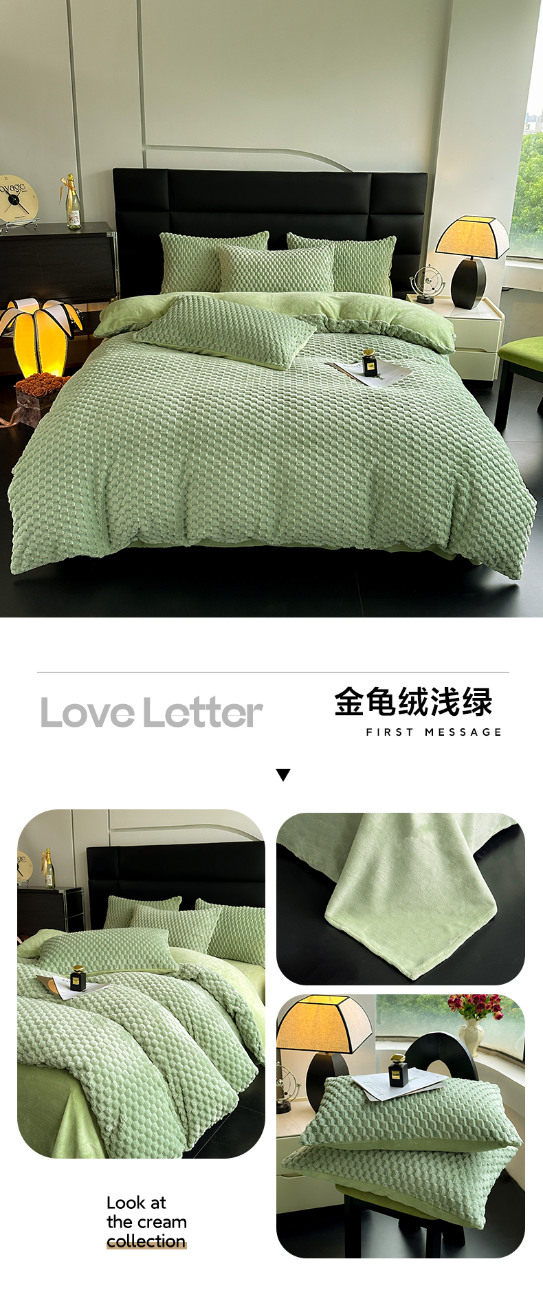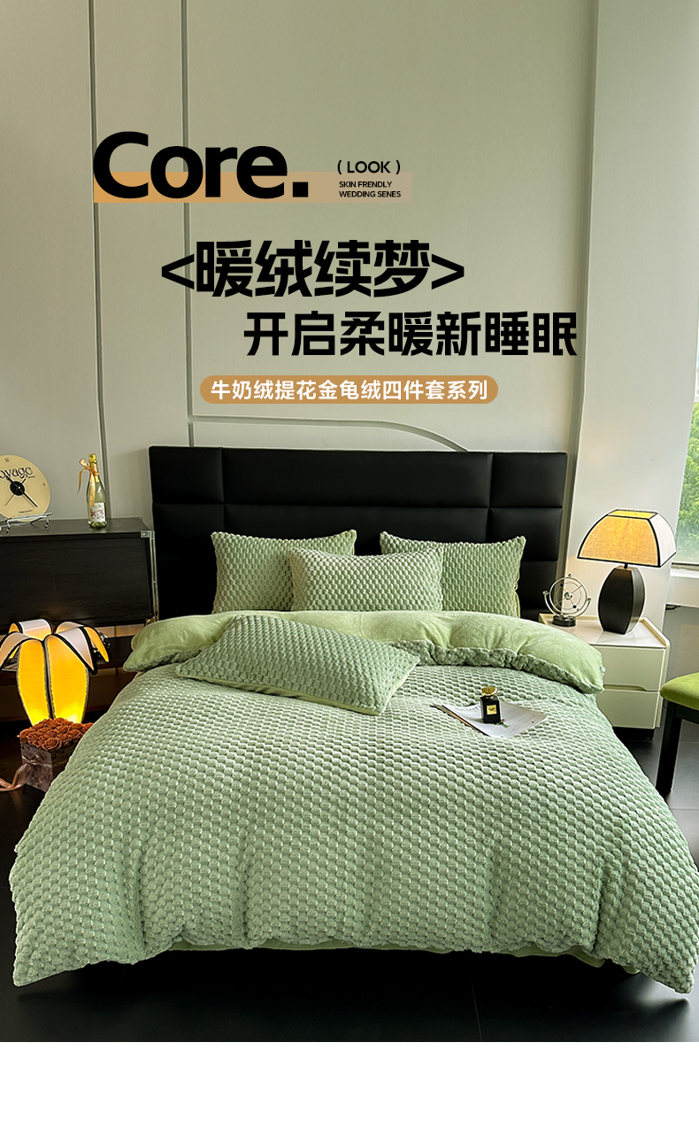 当前位置: 91家纺网 > 商品网购 > 床品套件 > 四件套 > 牛奶绒四件套 > 2024新款牛奶绒提花金龟绒三件套四件套-场景二 金龟绒浅绿