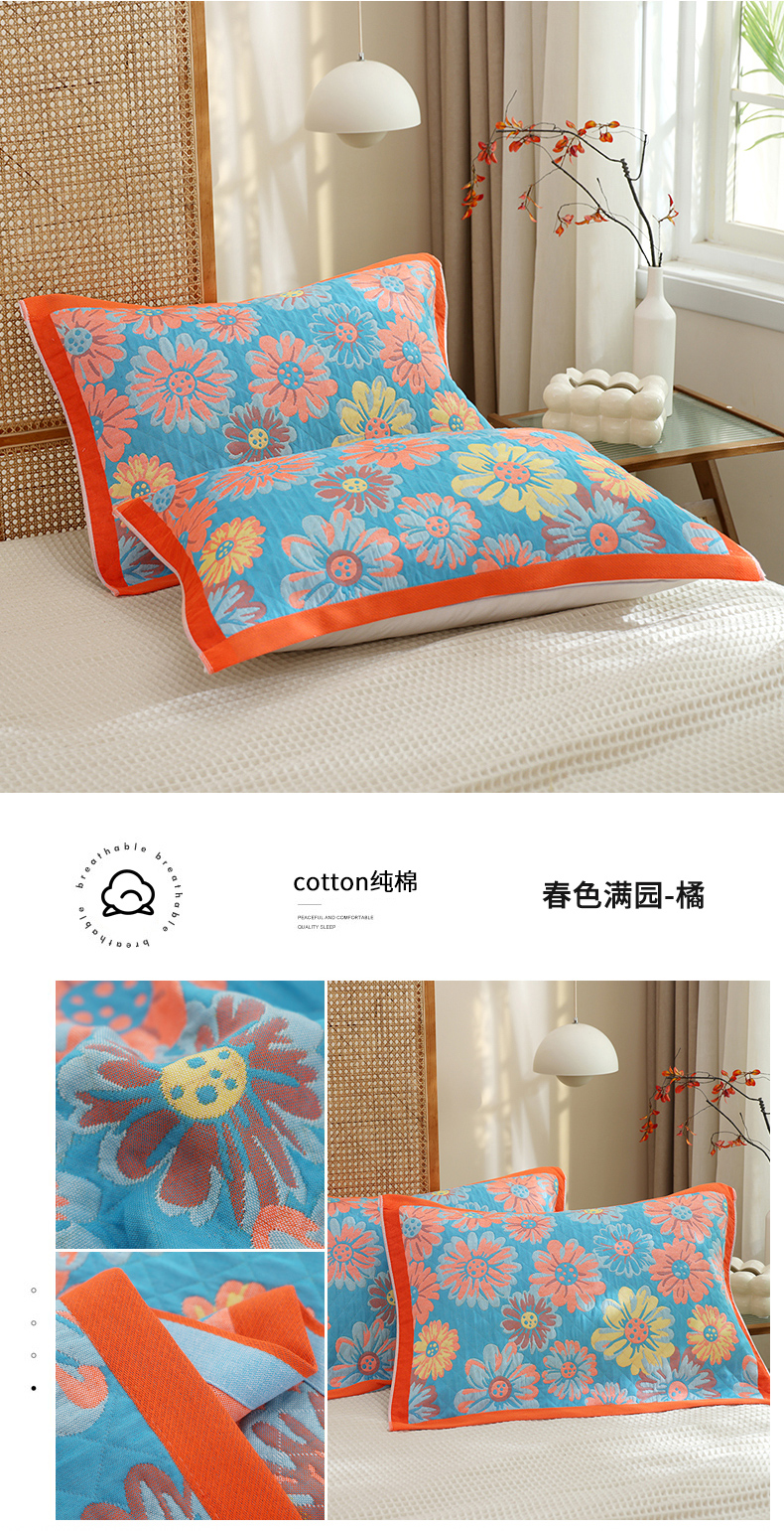 当前位置: 91家纺网 > 商品网购 > 床上用品 > 枕巾 > 朴尔家纺-毛巾被 2024新款全棉色织提花宽边定位四层纱布枕巾 春色满园-橘