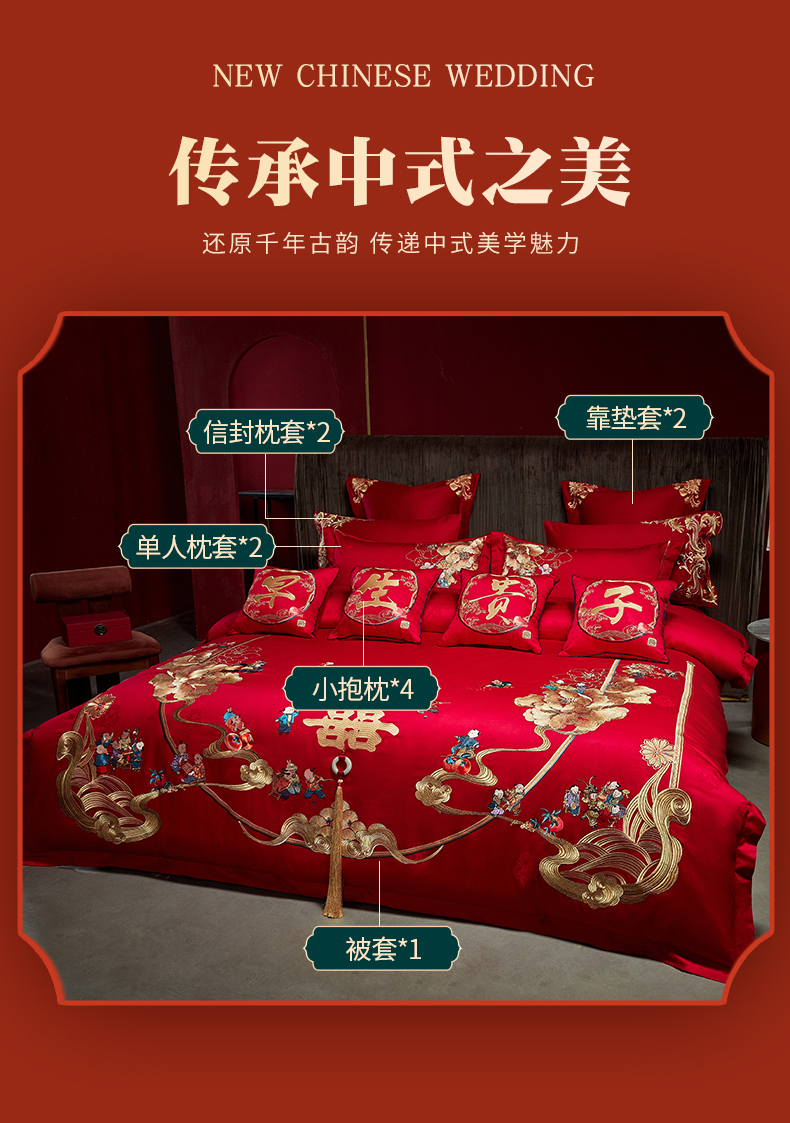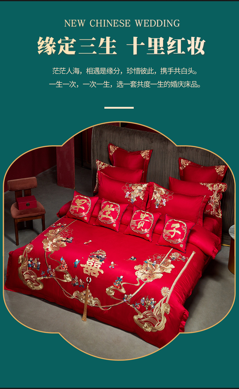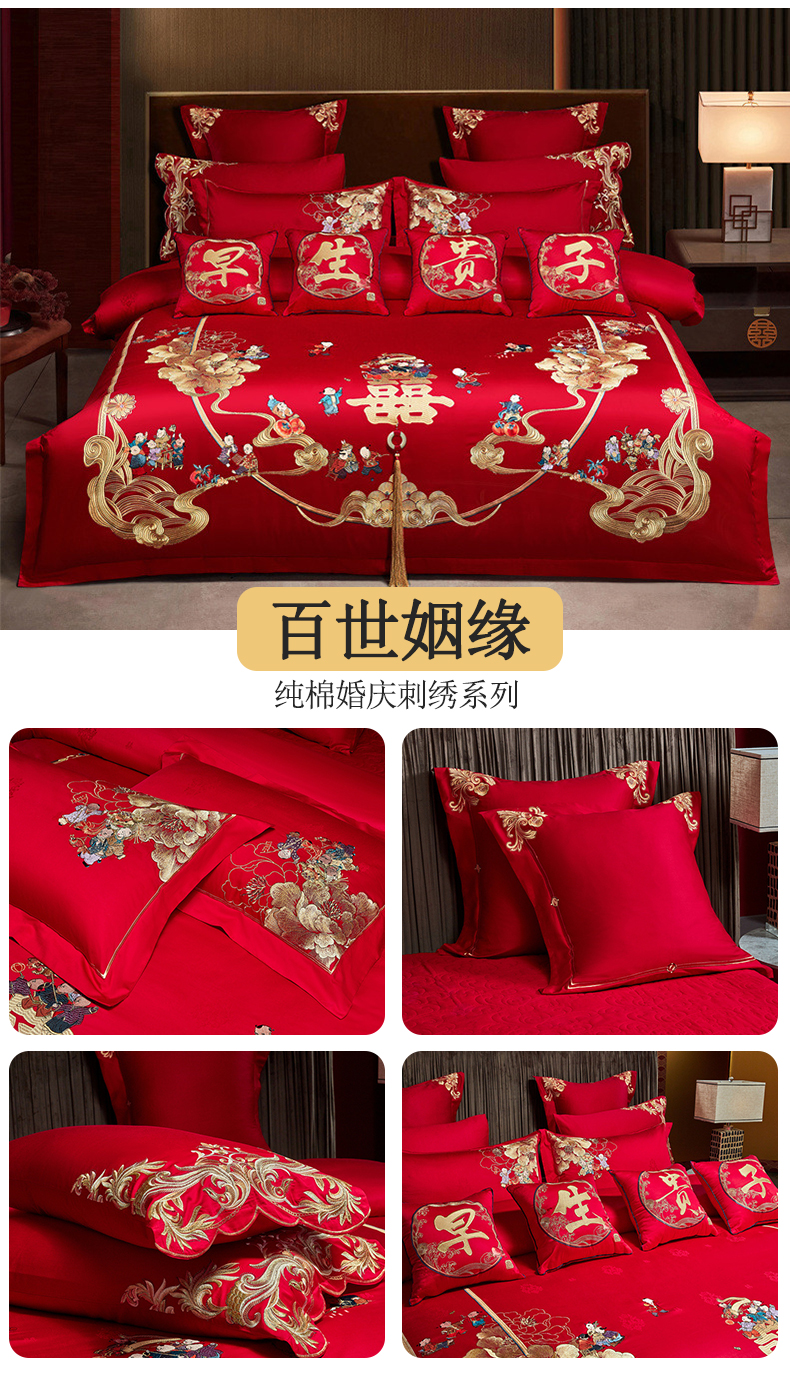 当前位置: 91家纺网 > 商品网购 > 床品套件 > 四件套 > 婚庆四件套 > 宏羽纺家纺 2024新款高支高密纯棉提花婚庆套件系列(控价680)百世姻缘