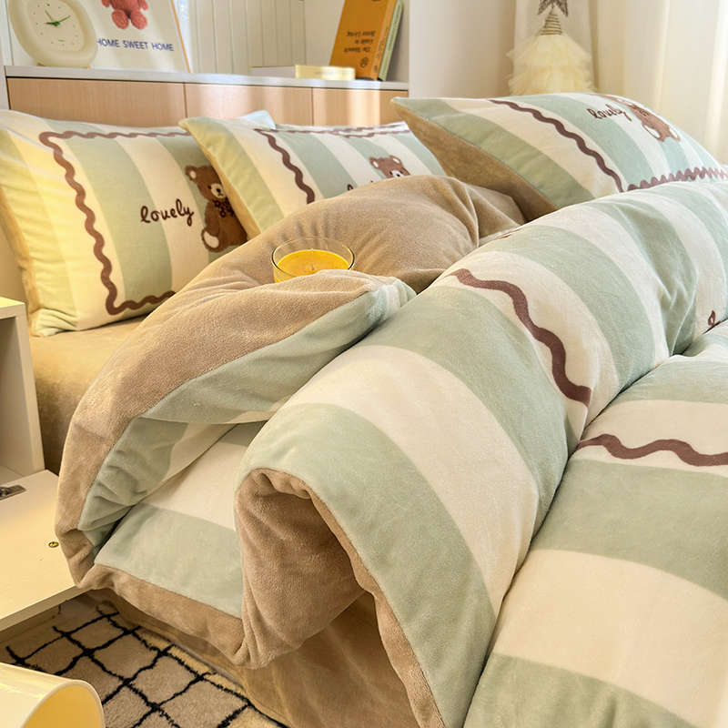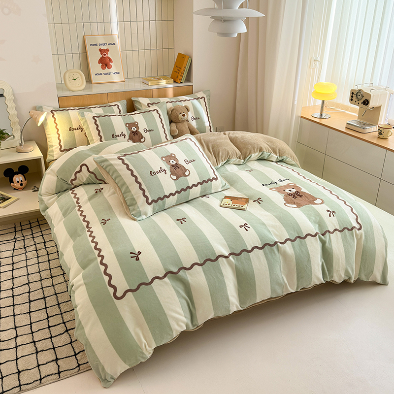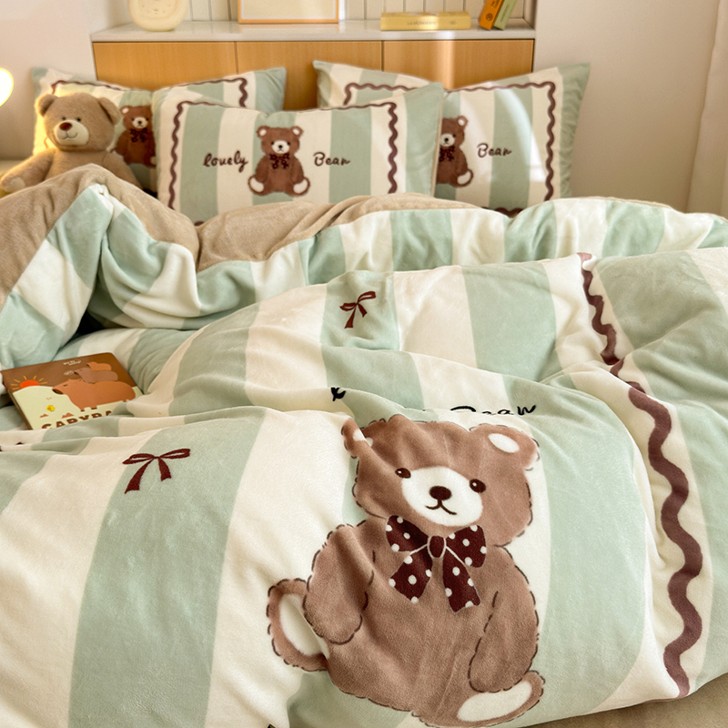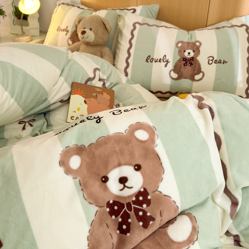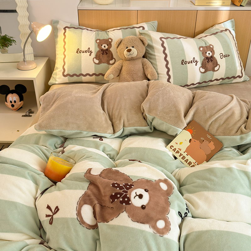 2024新款大版卡通双面高克重牛奶绒床单款四件套 咖啡熊