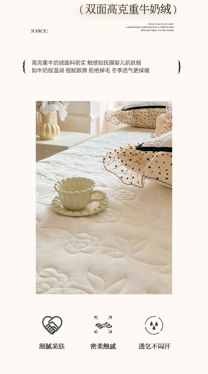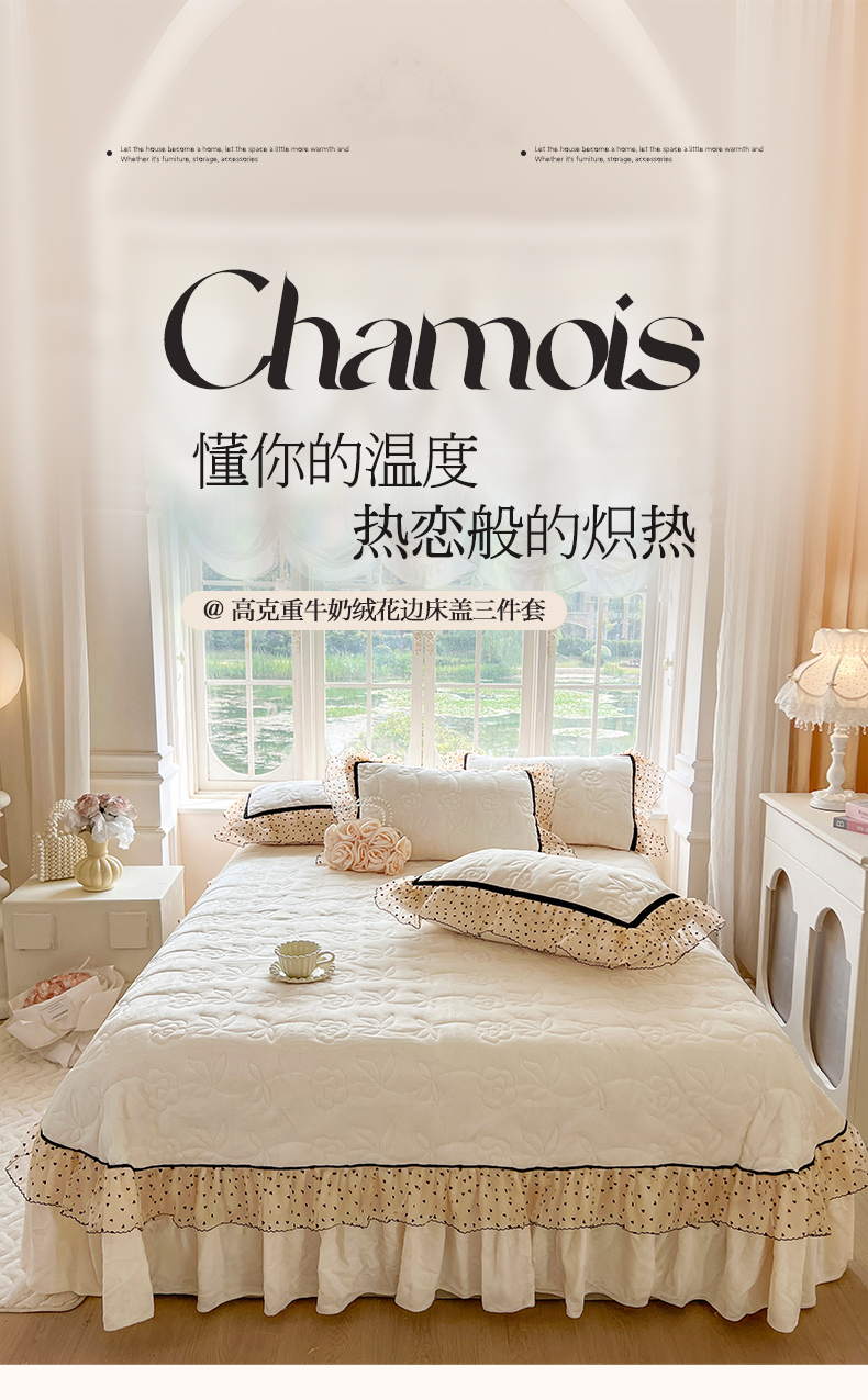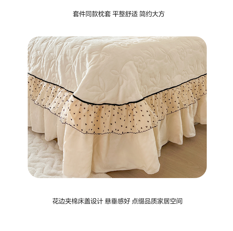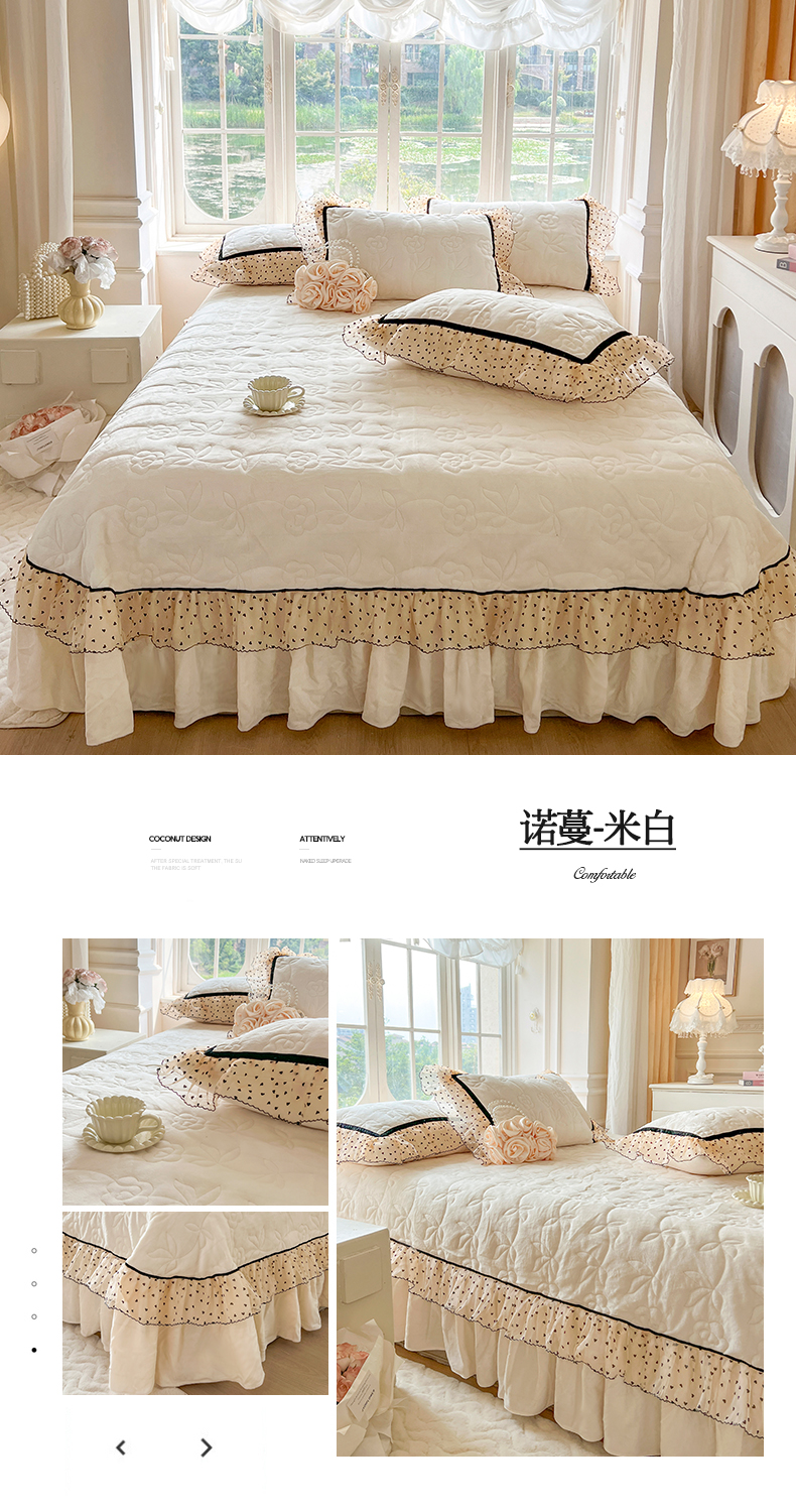 商品名称:网红馆(ck家纺) 2025新款牛奶绒花边床盖三件套-诺蔓 诺蔓-米白