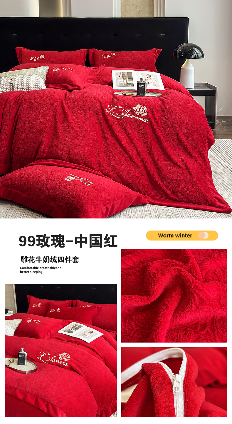 娇逸家居 2024新款A类雕花牛奶绒拼边刺绣款-99玫瑰 99玫瑰-中国红