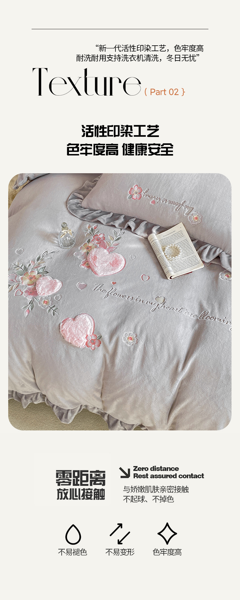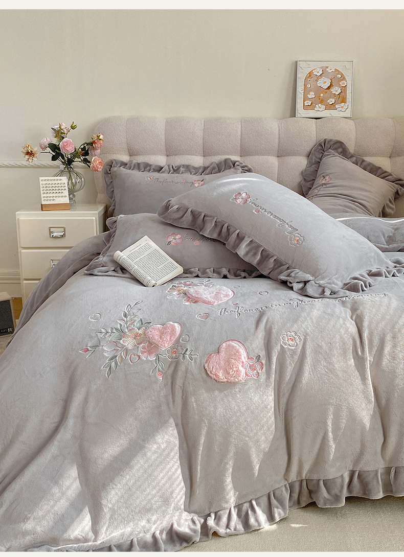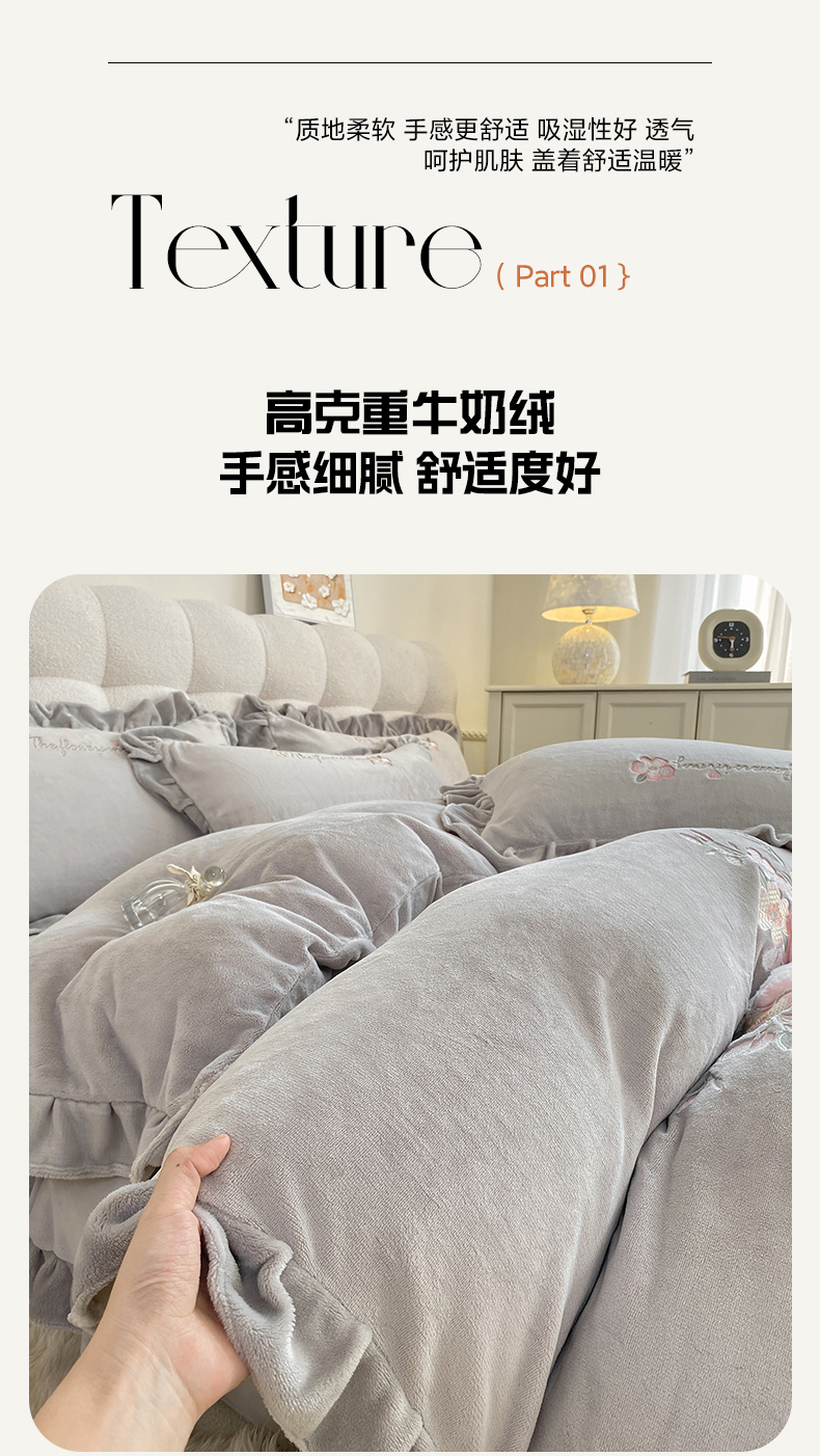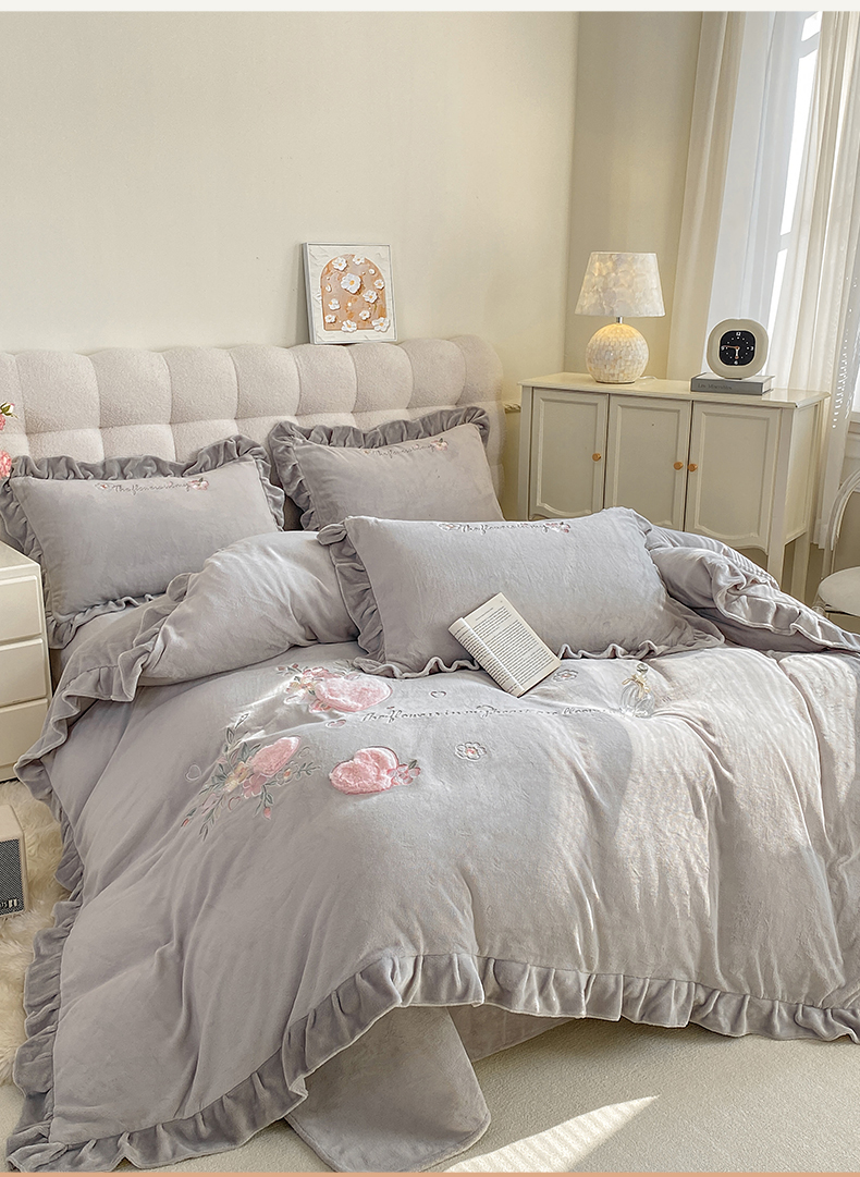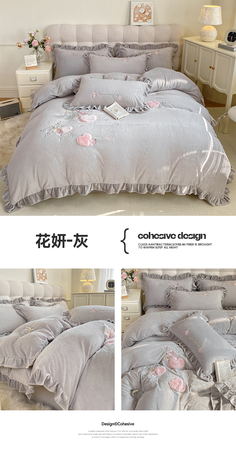 当前位置: 91家纺网 > 商品网购 > 床品套件 > 四件套 > 牛奶绒四件套 > 蜜柚 2024新款全消光高克重韩版小清新贴布绣四件套 花妍-灰