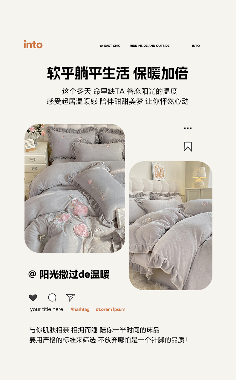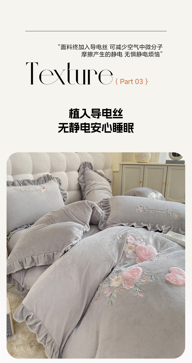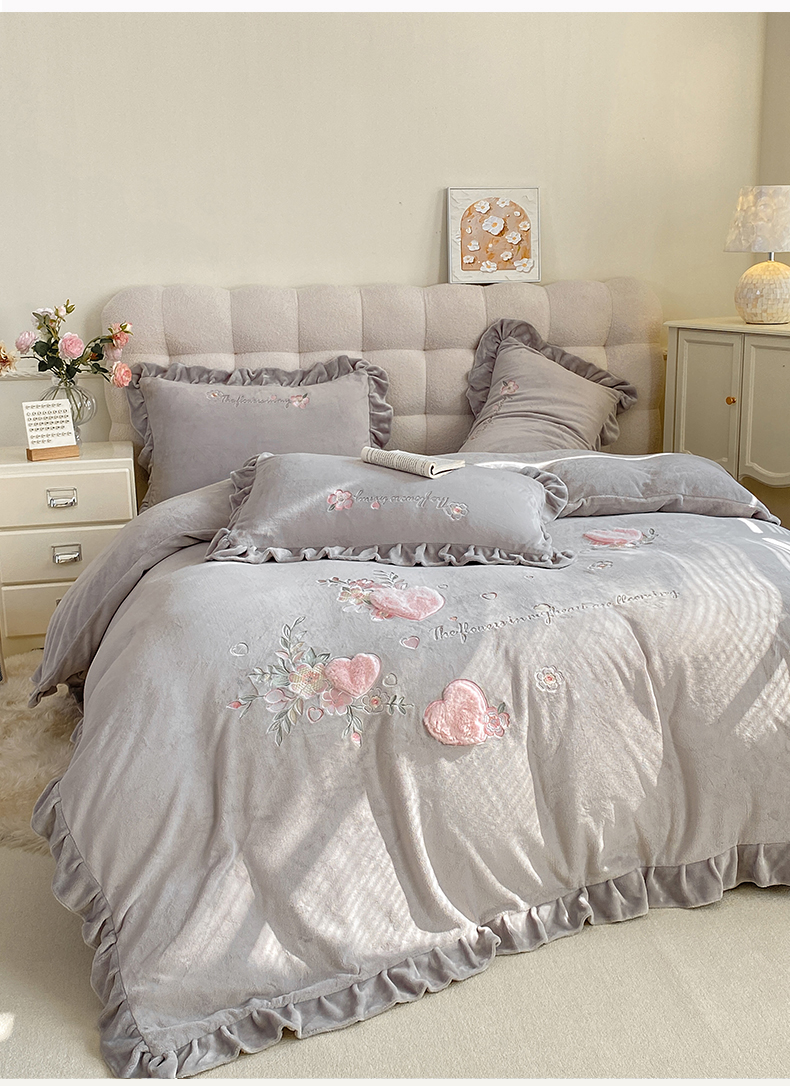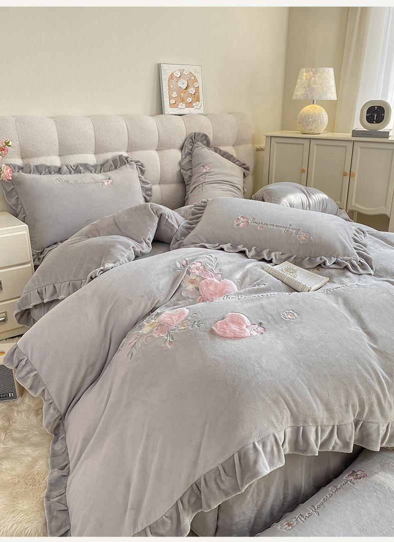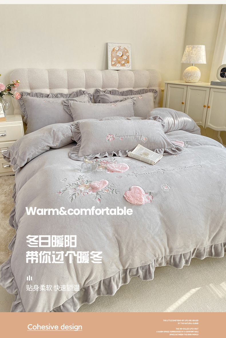 当前位置: 91家纺网 > 商品网购 > 床品套件 > 四件套 > 牛奶绒四件套 > 蜜柚 2024新款全消光高克重韩版小清新贴布绣四件套 花妍-灰