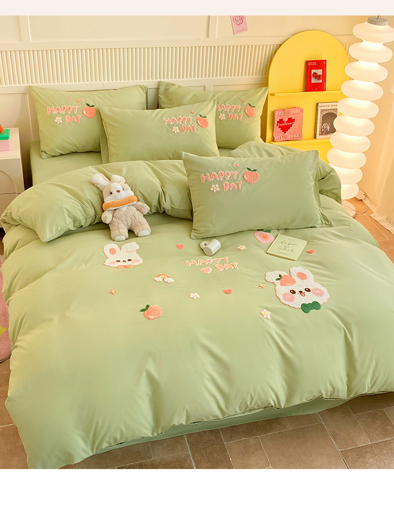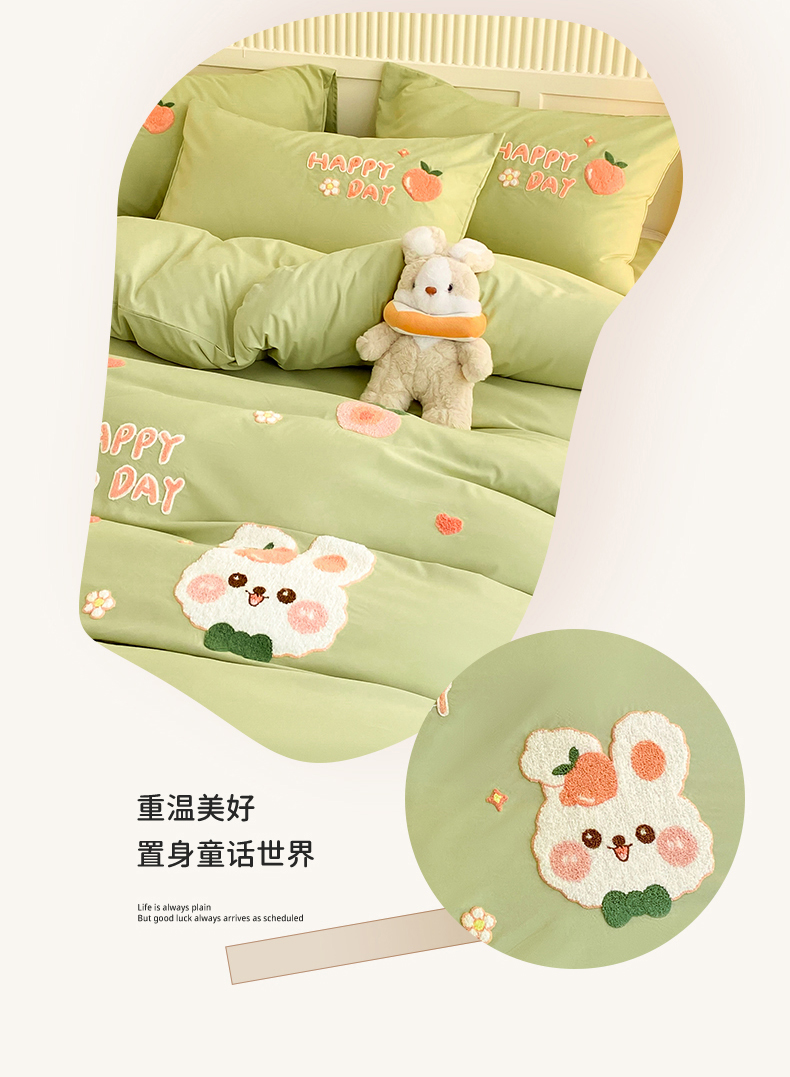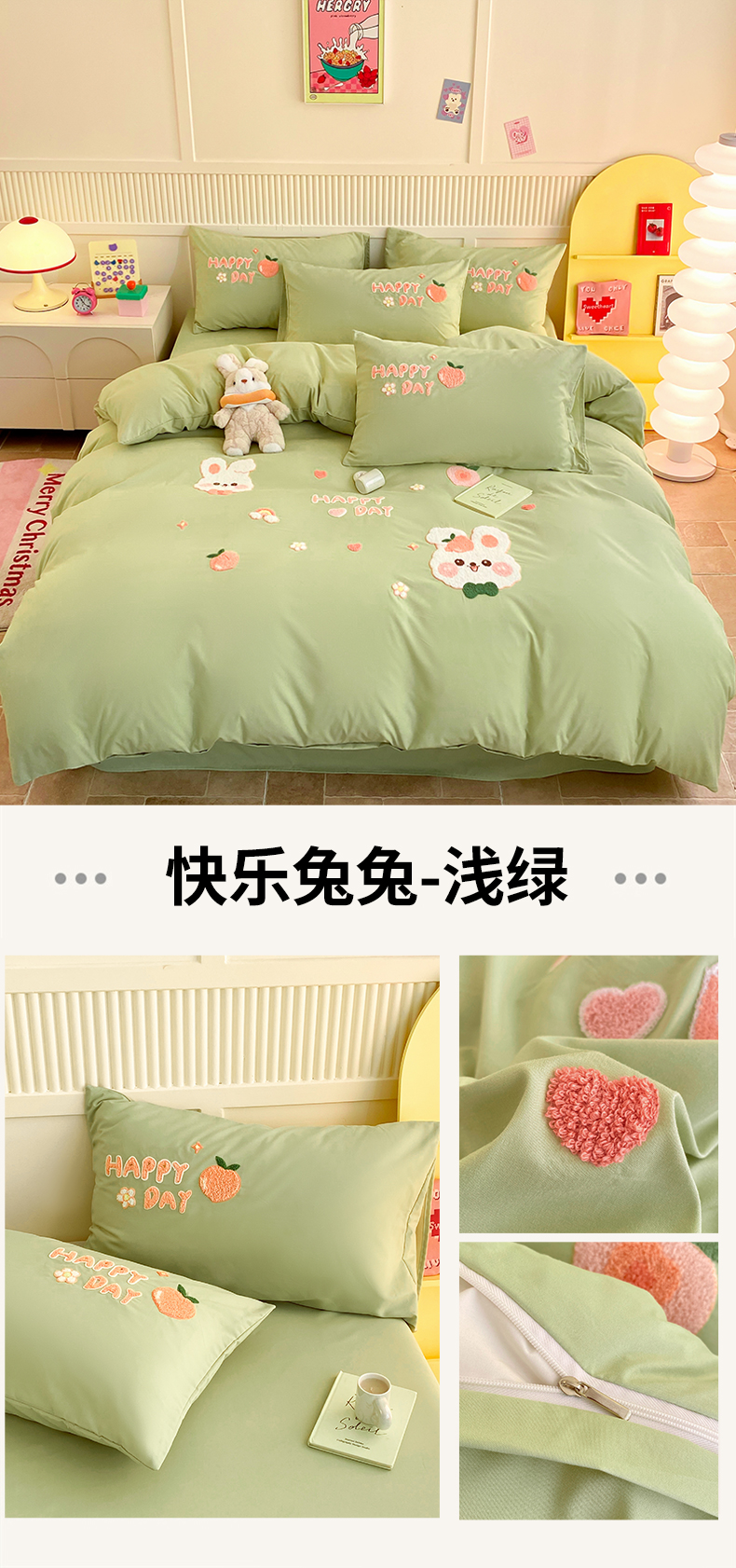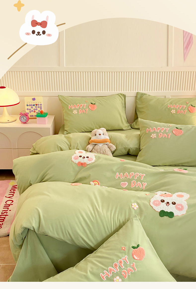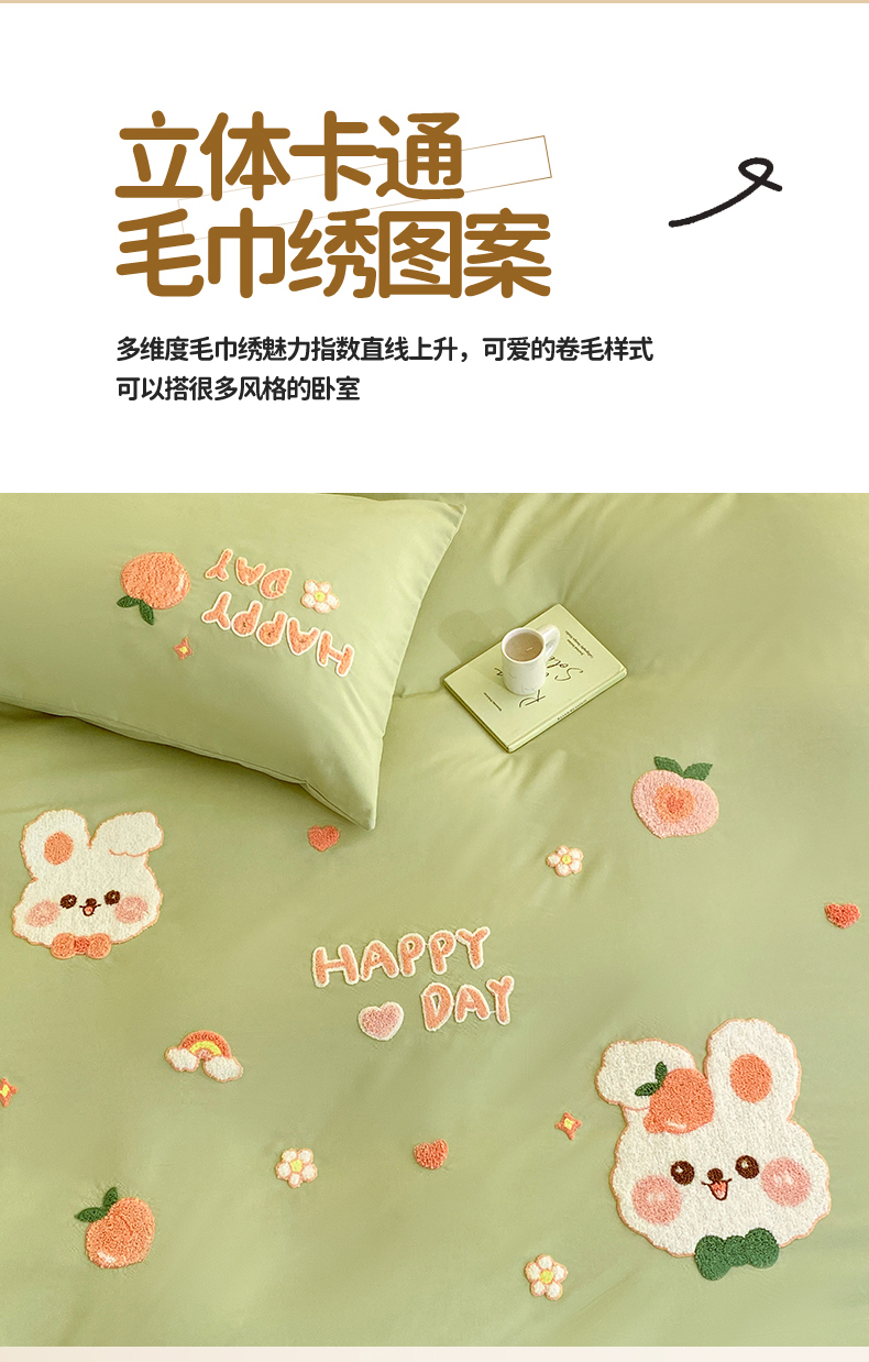 当前位置: 91家纺网 > 商品网购 > 床品套件 > 四件套 > 水洗棉四件套 > 一左一右 2024新款亲肤磨毛水洗棉立体毛巾绣花卡通四件套儿童学生三件套床笠(提供买家秀) 快乐兔兔-浅绿