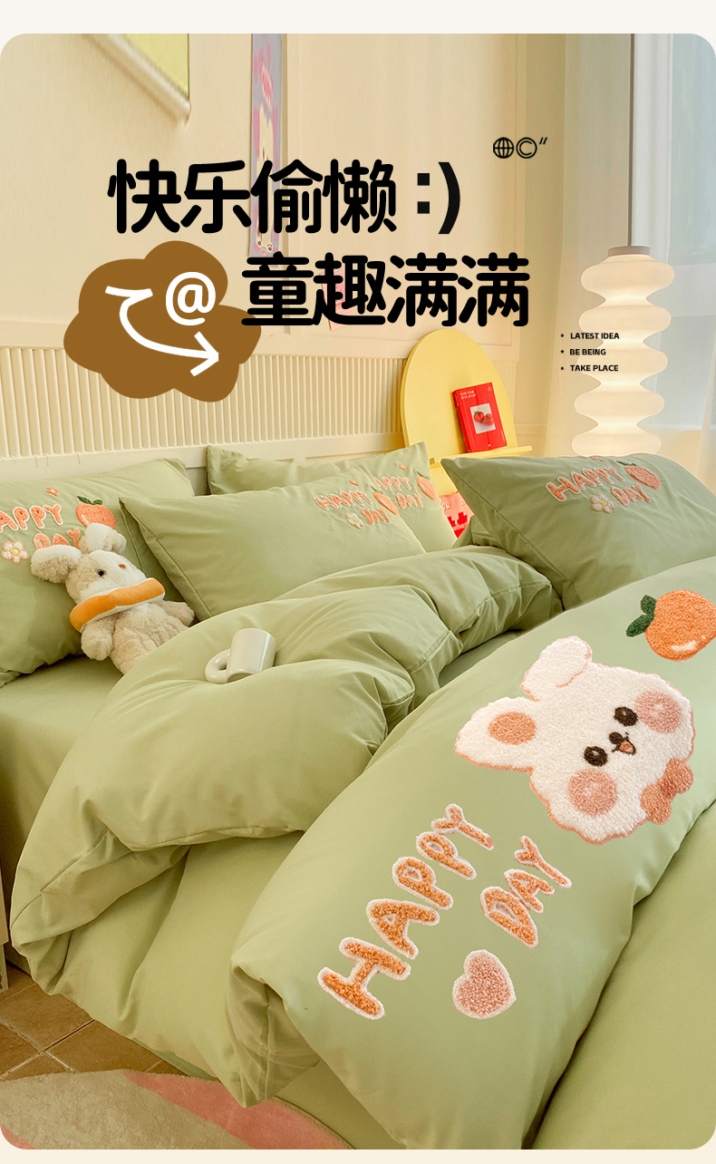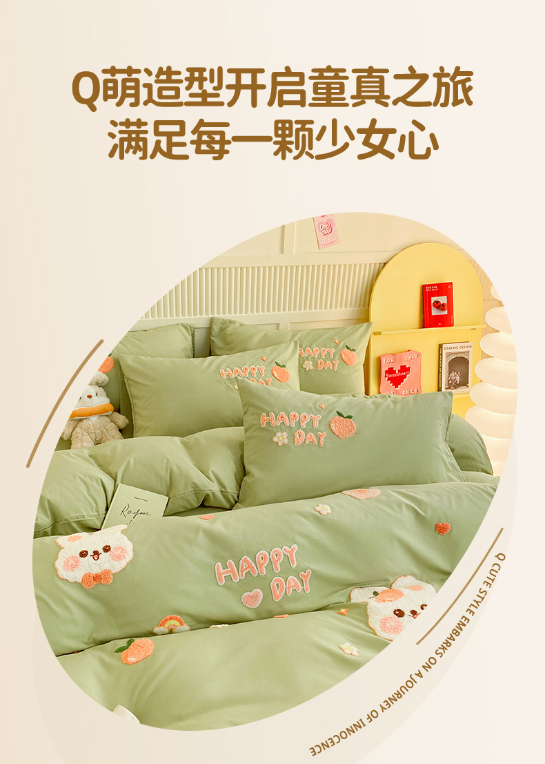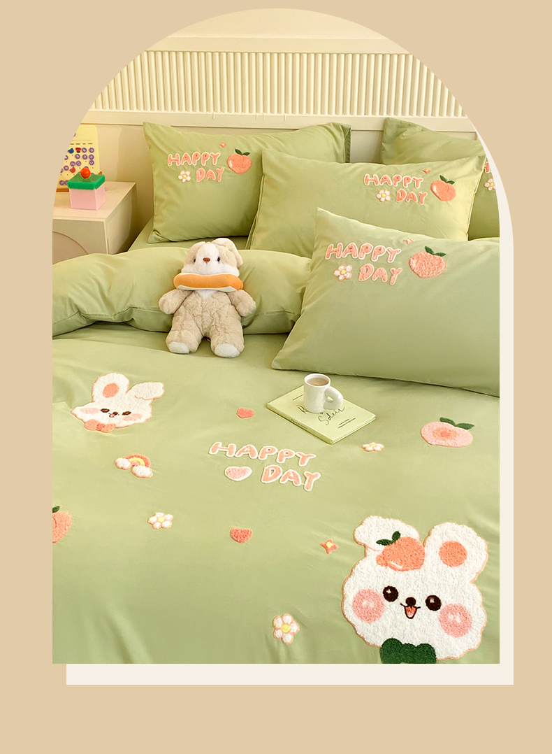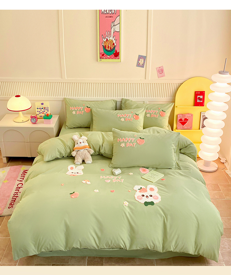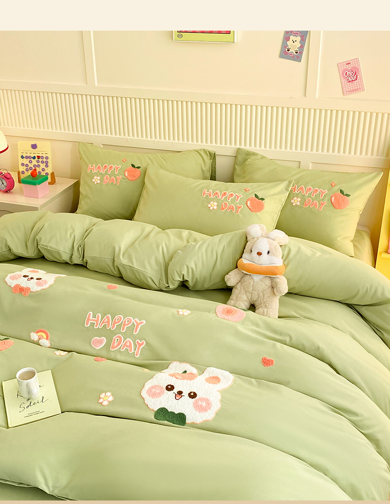 当前位置: 91家纺网 > 商品网购 > 床品套件 > 四件套 > 水洗棉四件套 > 一左一右 2024新款亲肤磨毛水洗棉立体毛巾绣花卡通四件套儿童学生三件套床笠(提供买家秀) 快乐兔兔-浅绿