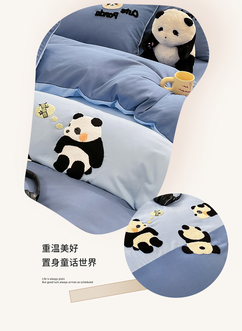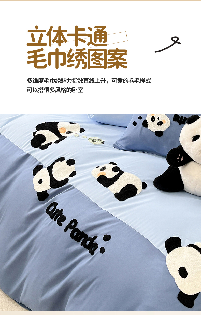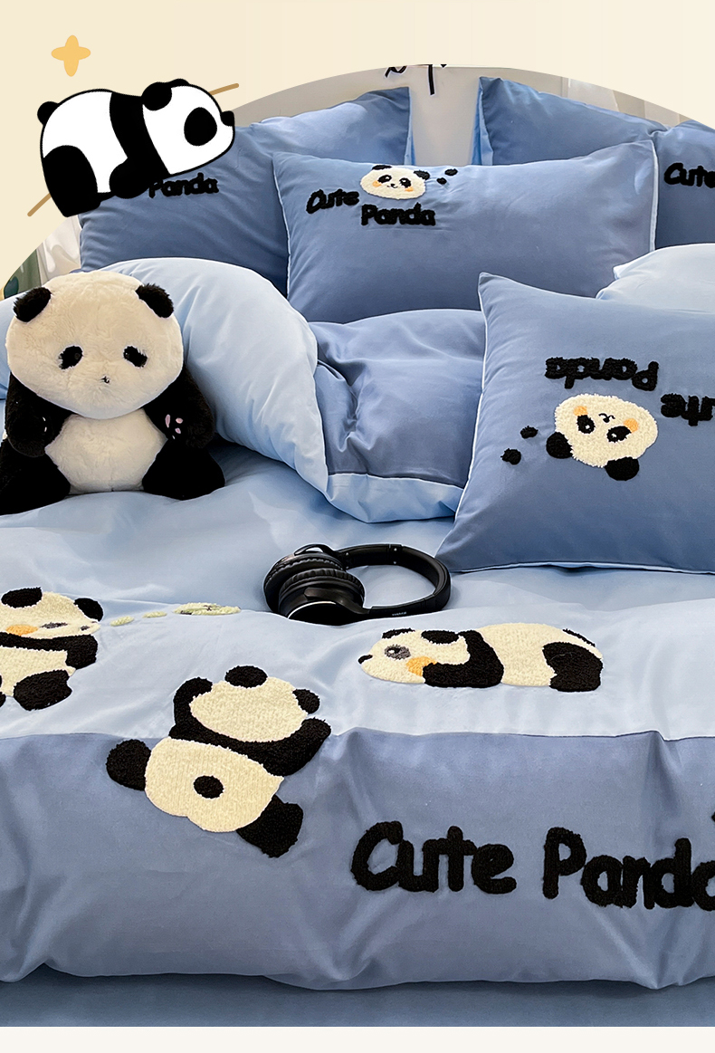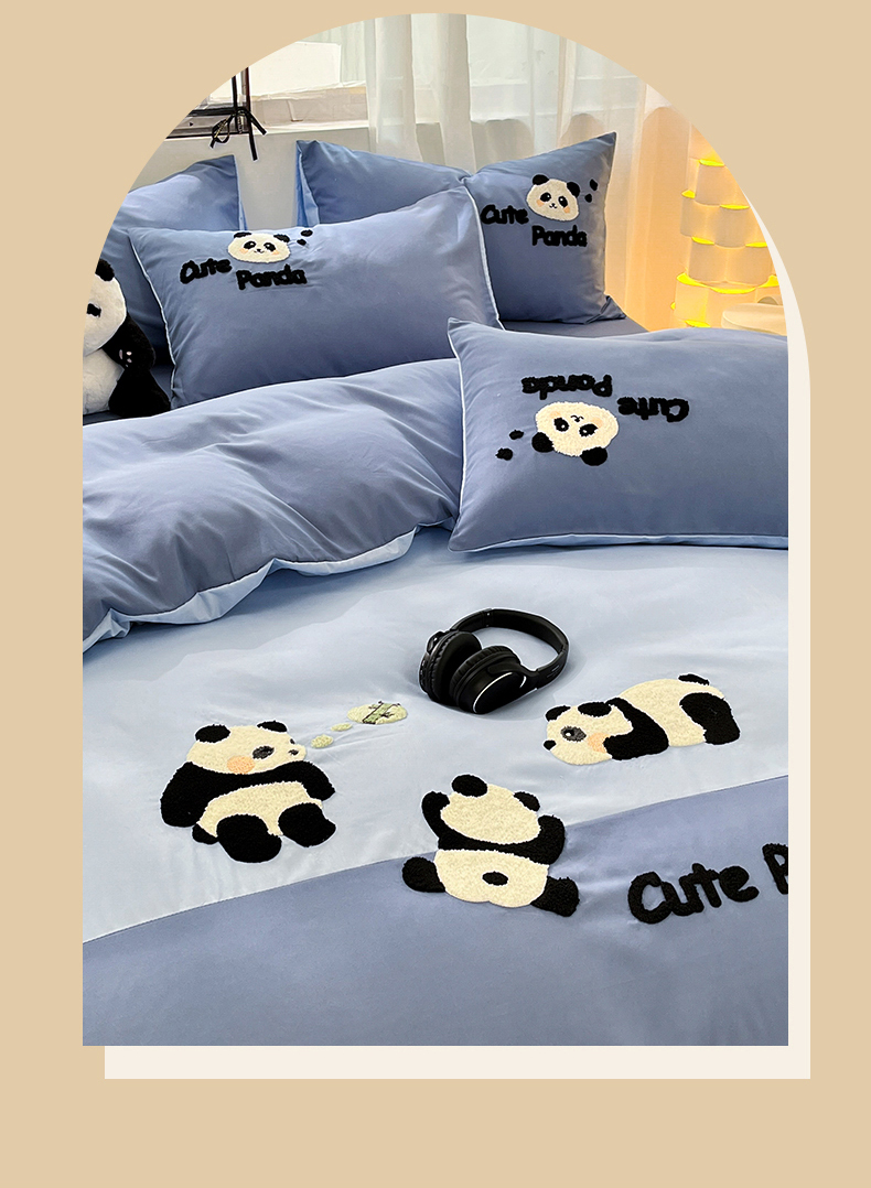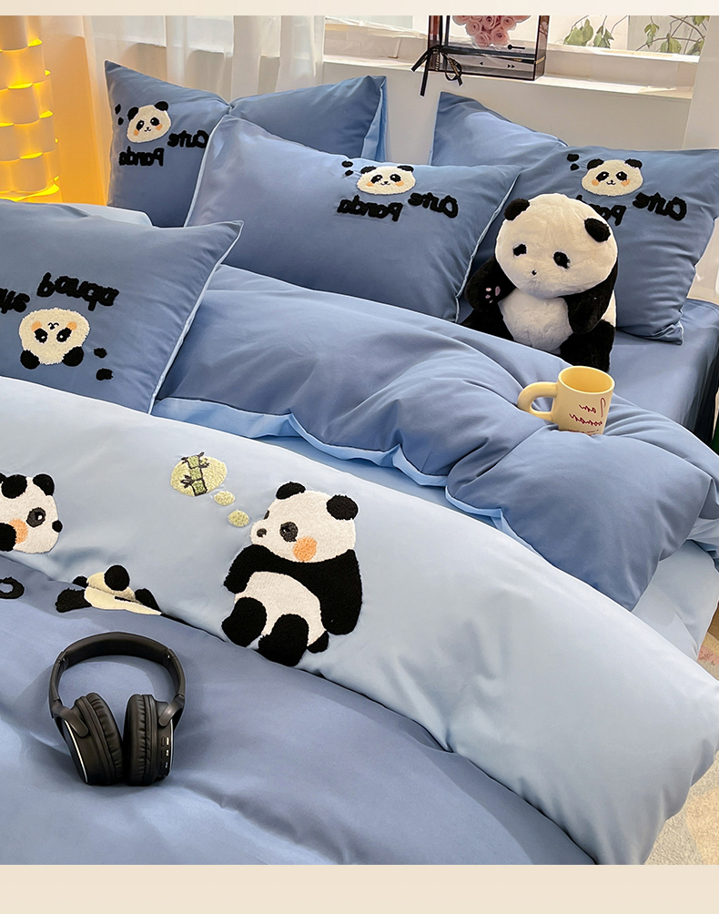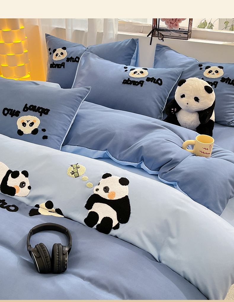 当前位置: 91家纺网 > 商品网购 > 床品套件 > 四件套 > 水洗棉四件套 > 一左一右 2024新款亲肤磨毛水洗棉拼接立体毛巾绣花卡通四件套儿童学生三件套床笠(提供买家秀) 熊猫派对-蓝色