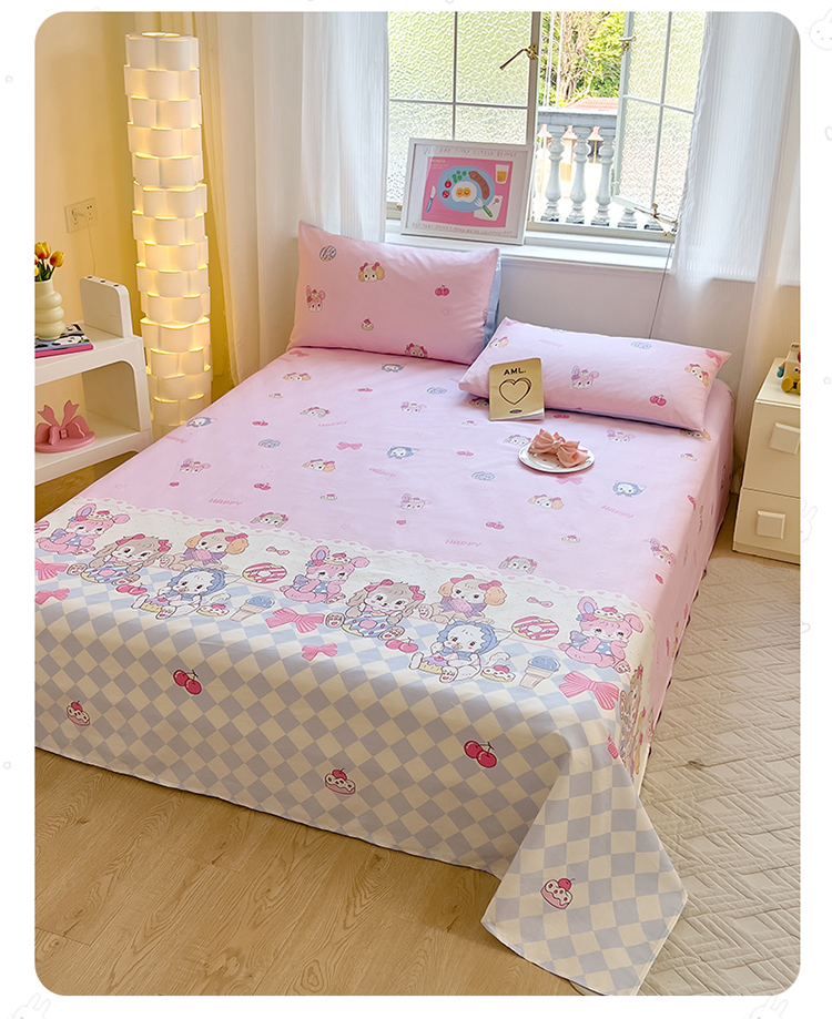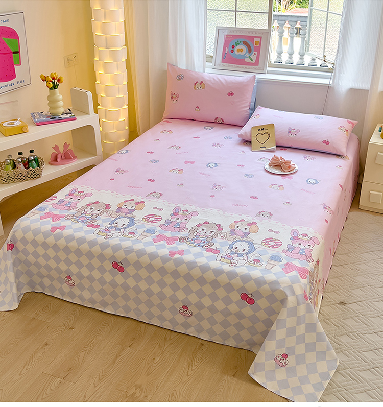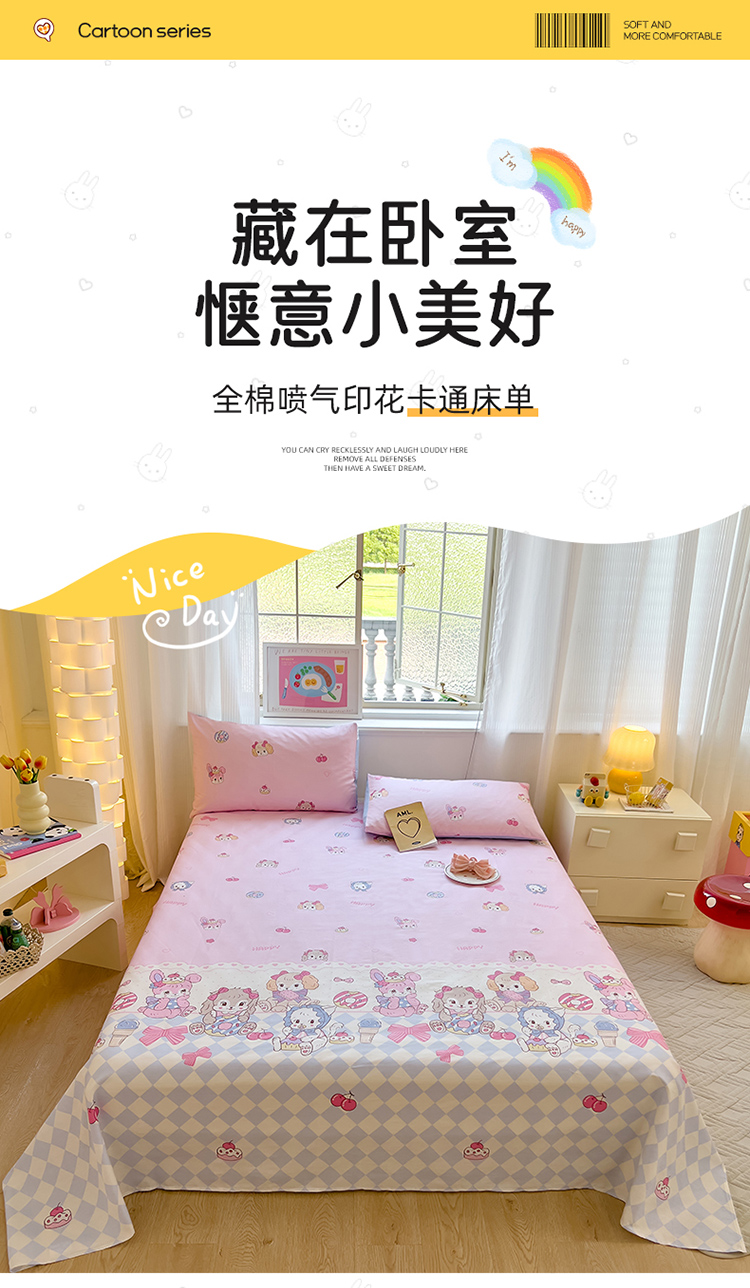 (总)拾物记 2023新款喷气全棉卡通小清新系列单床单,欢乐萌熊,奶油兔-红