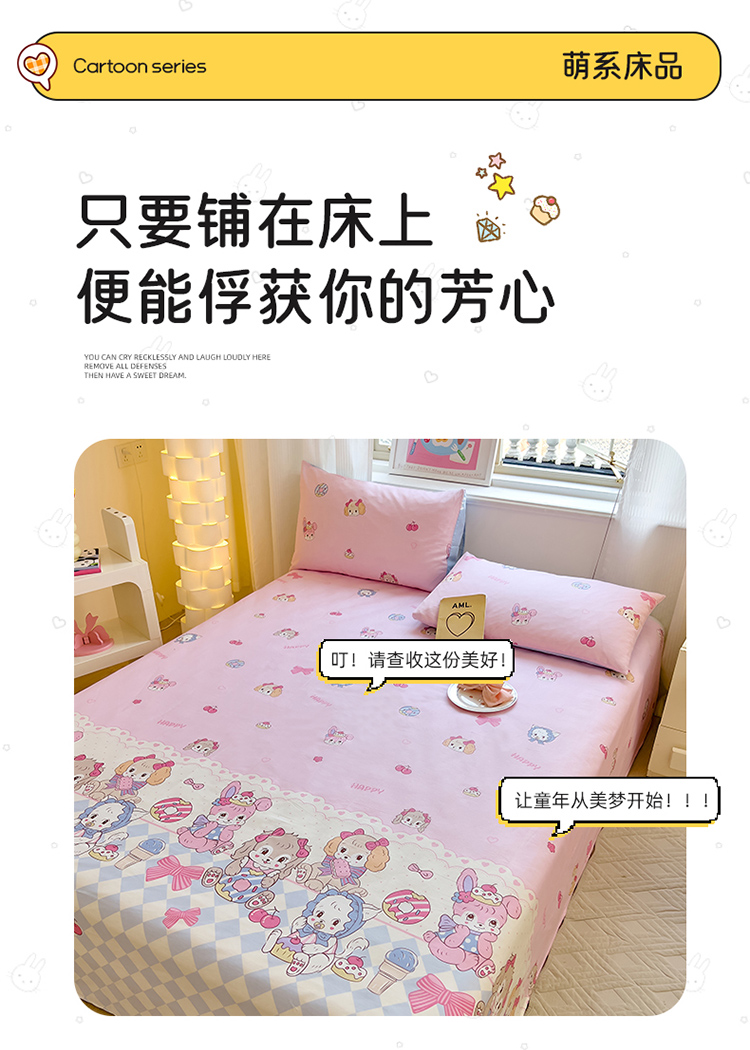 (总)拾物记 2023新款喷气全棉卡通小清新系列单床笠,欢乐萌熊,奶油兔-红