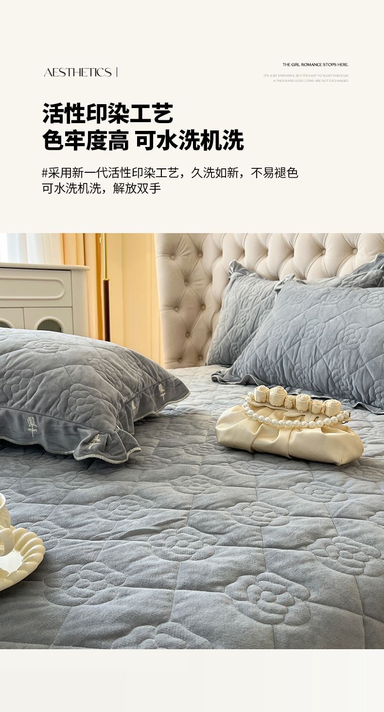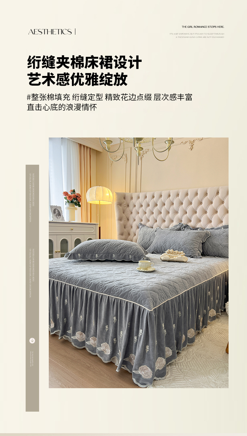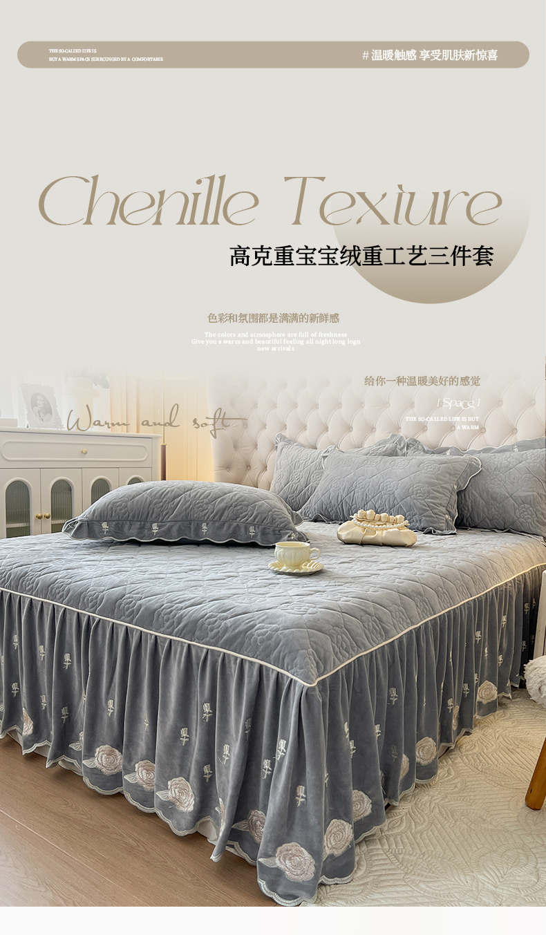 网红馆(ck家纺) 2025新款高克重加厚保暖重工艺宝宝绒晨曦玫瑰系列床裙三件套 神秘灰
