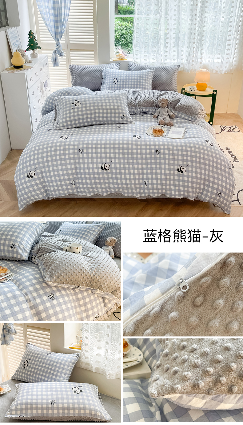 佰亿莱 2024新款豆豆绒四件套 蓝格熊猫-灰