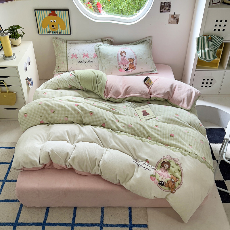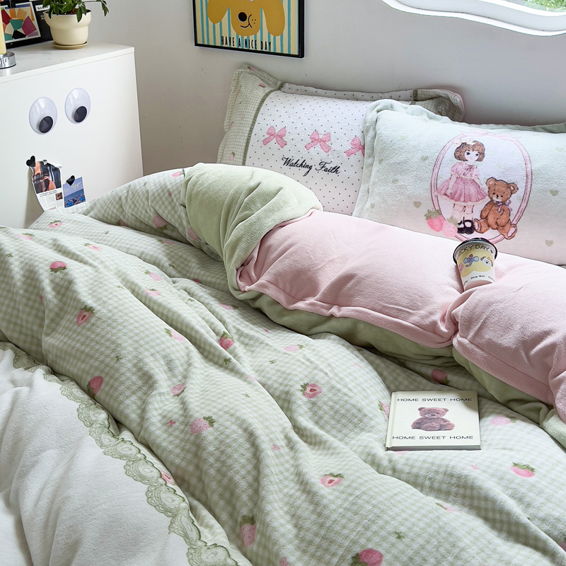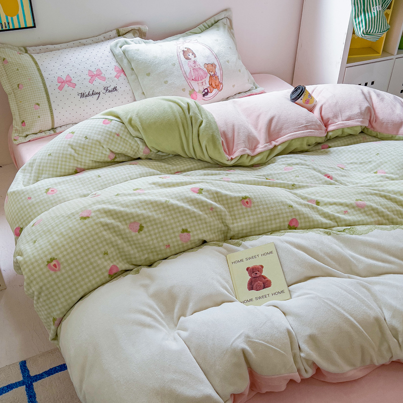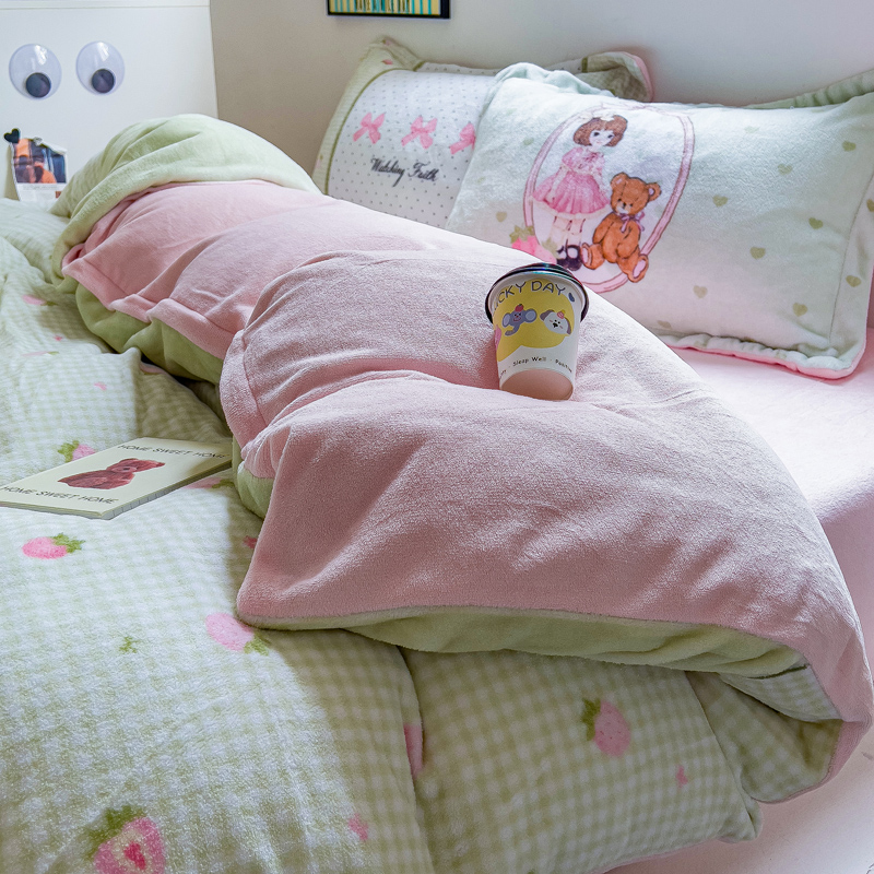 当前位置: 91家纺网 > 商品网购 > 床品套件 > 四件套 > 牛奶绒四件套 > (买家秀 爆款不断货)A类母婴级双面牛奶绒珊瑚绒雪花绒四件套AB版高克重卡通牛奶绒四件套花卉-场景2 草莓女孩