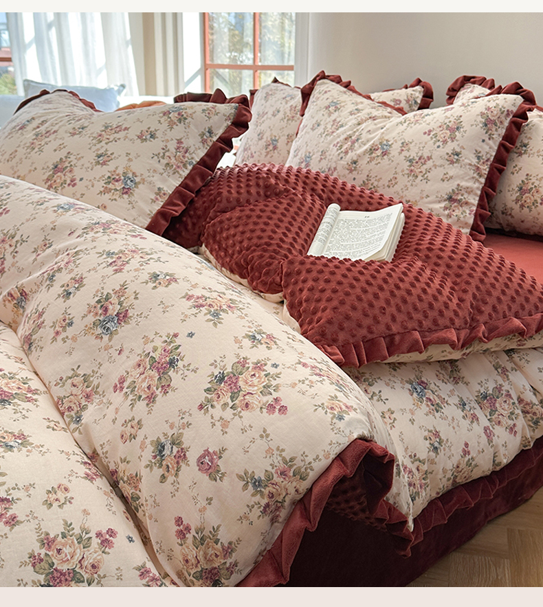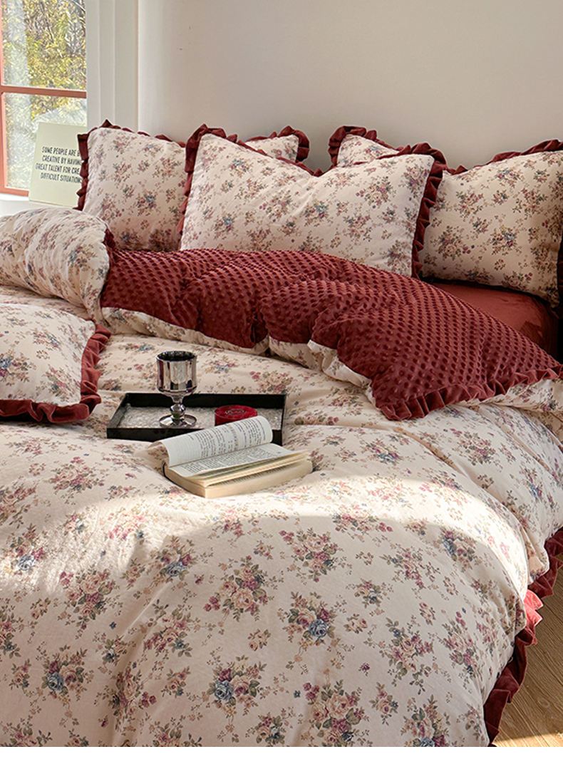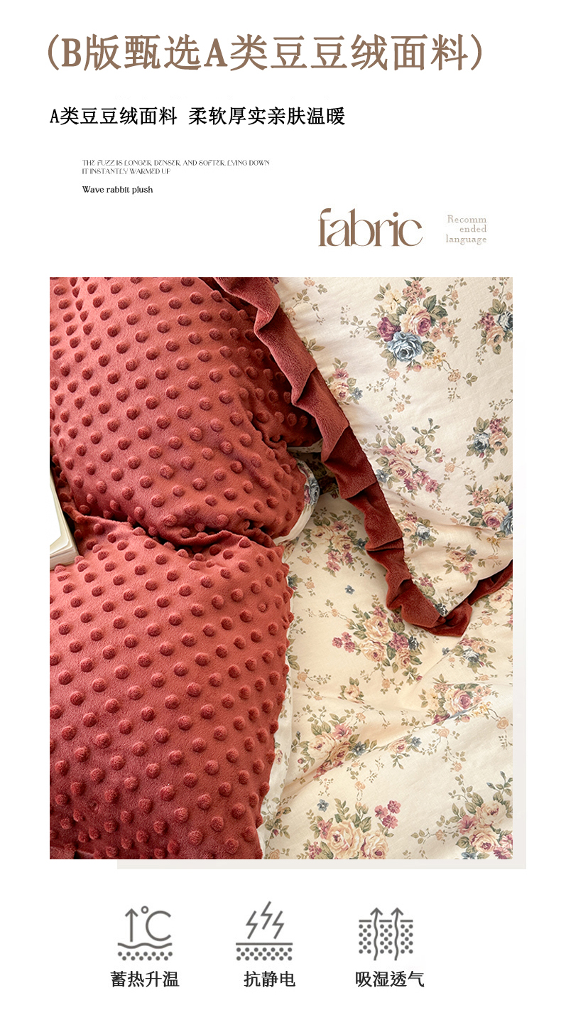 当前位置: 91家纺网 > 商品网购 > 床品套件 > 四件套 > 其它四件套 > 麦伦家居 2025新款多功能床品全棉A类有氧双层纱+豆豆绒四件套荷叶边系列 花棠