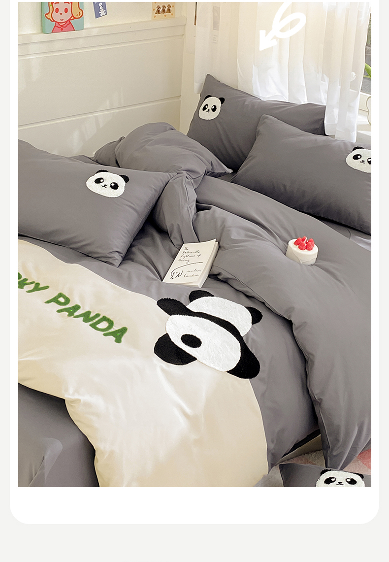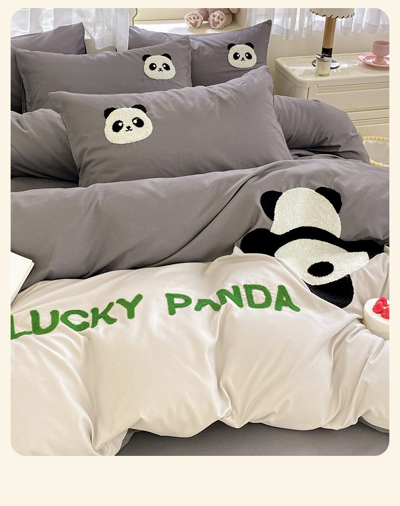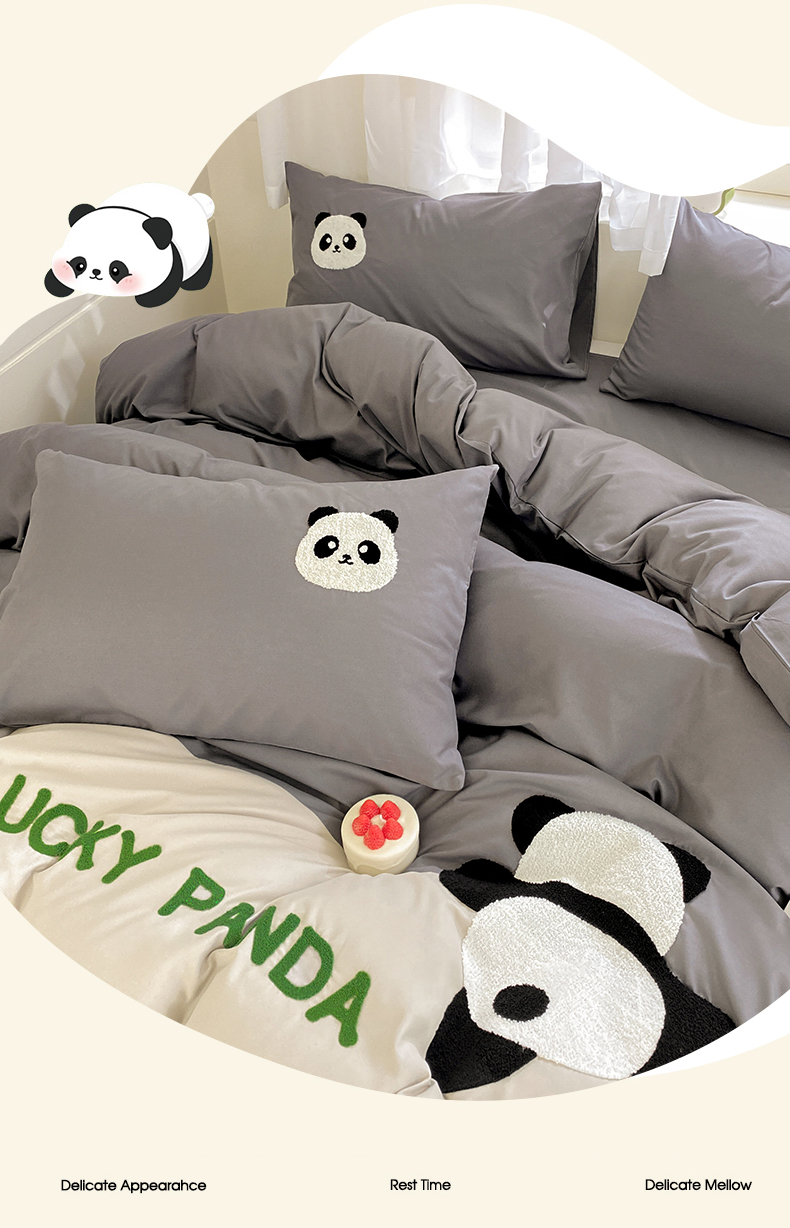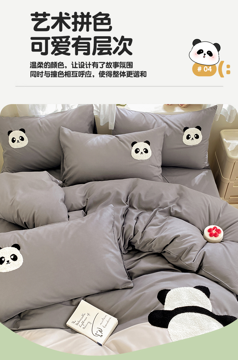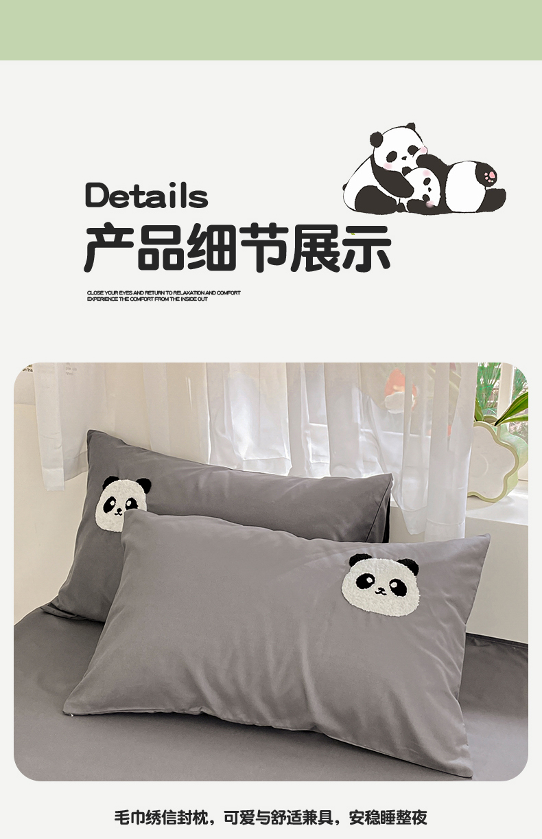商品名称:盛秋家纺 2025新款A类水洗棉毛巾绣四件套-胖达 胖达-中灰