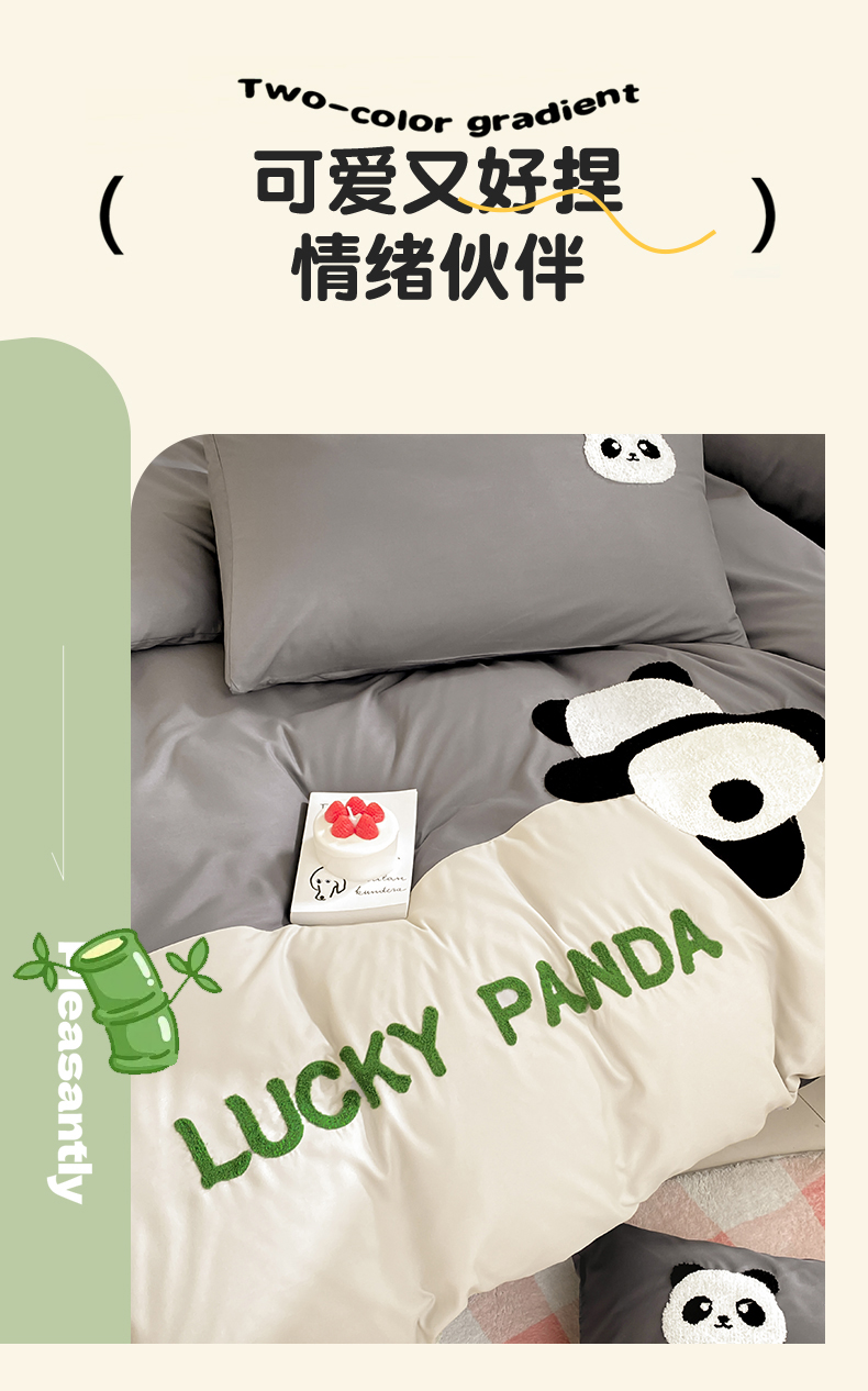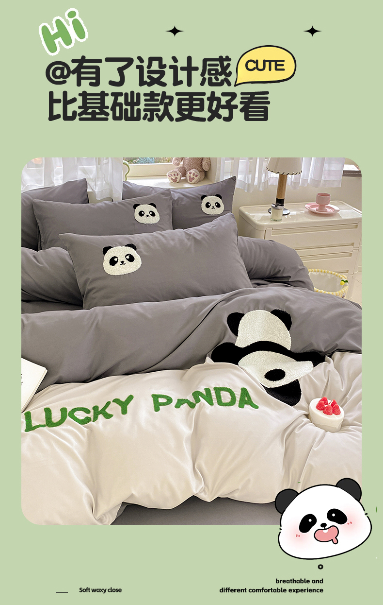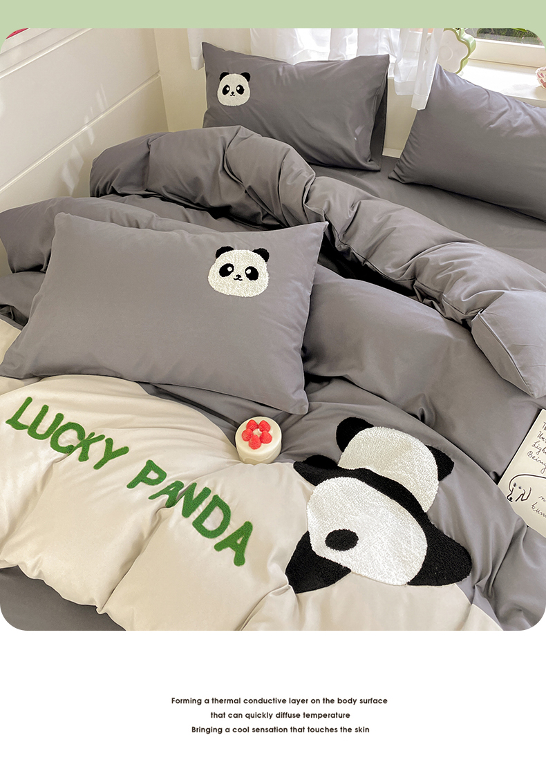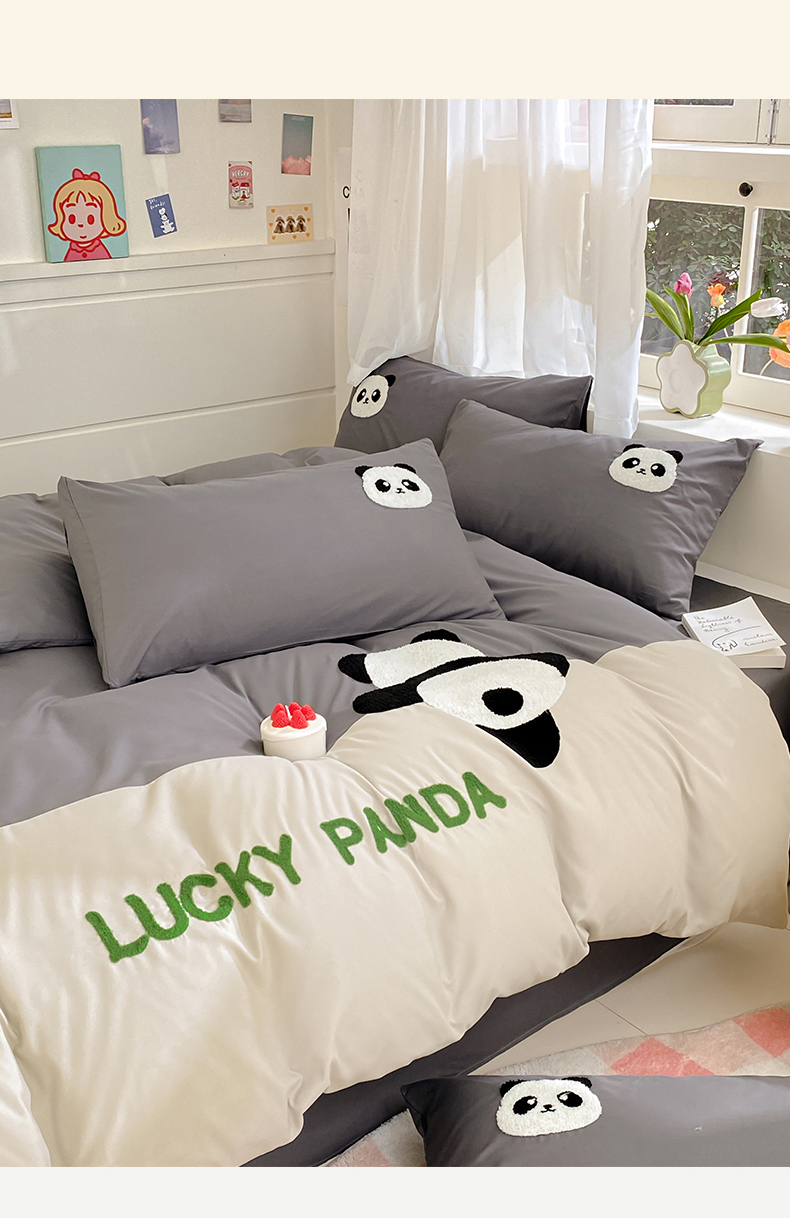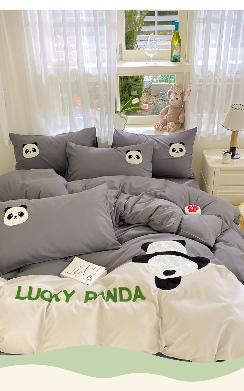 商品名称:盛秋家纺 2025新款A类水洗棉毛巾绣四件套-胖达 胖达-中灰