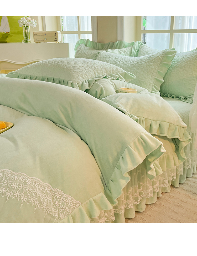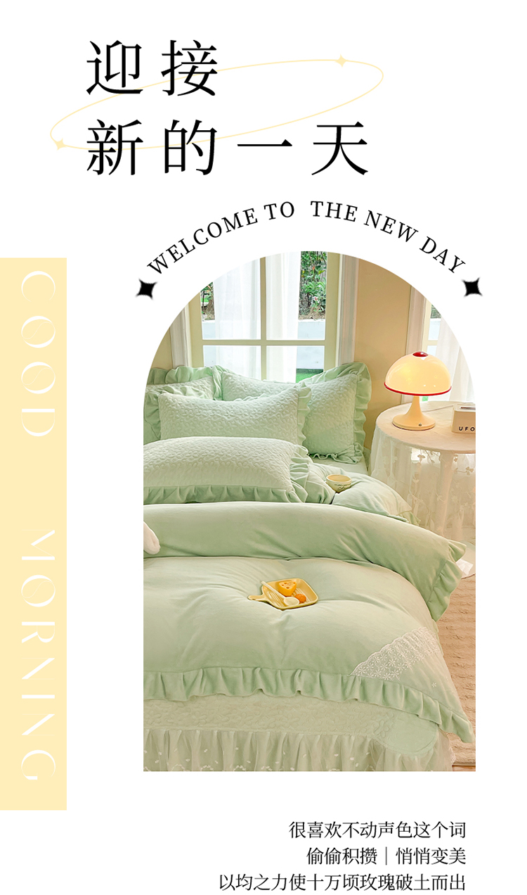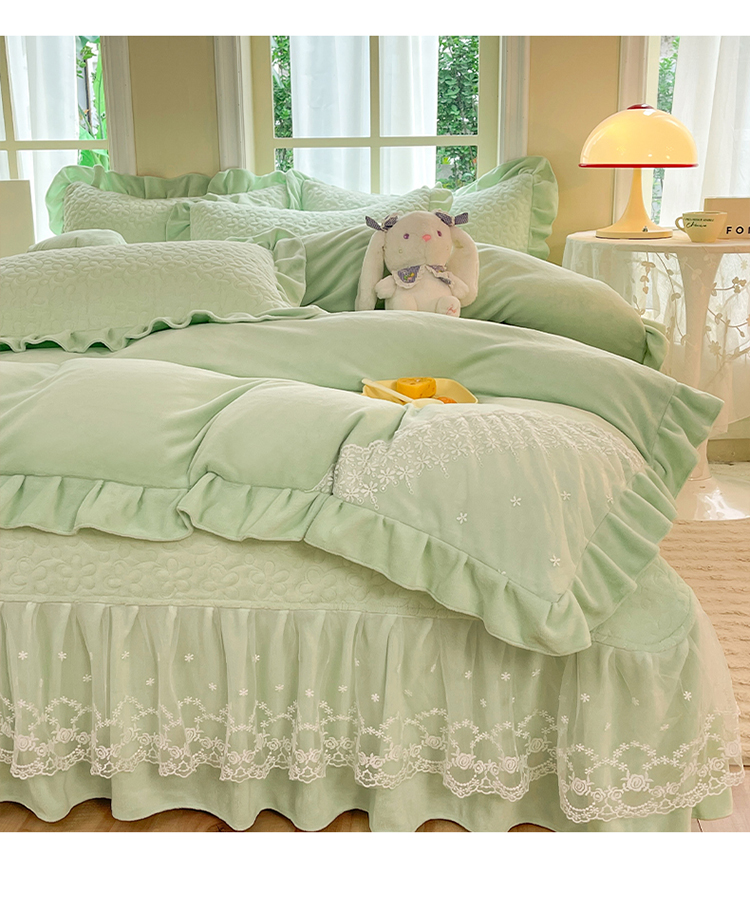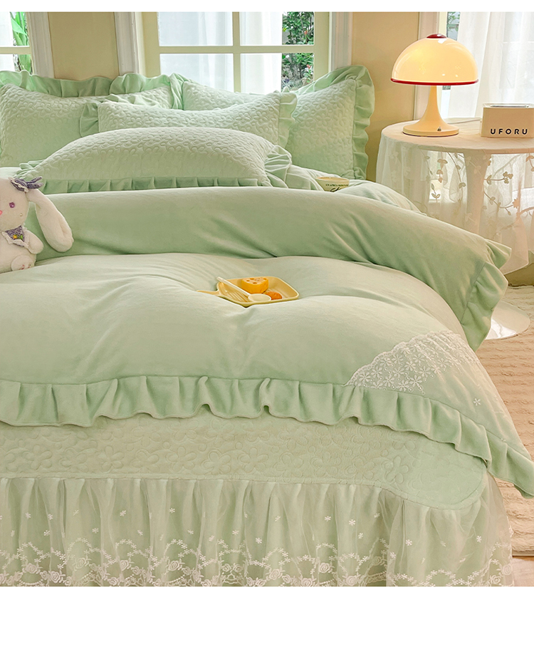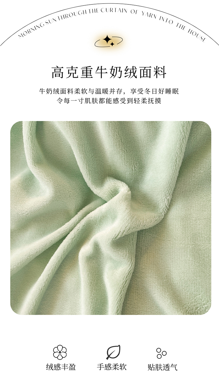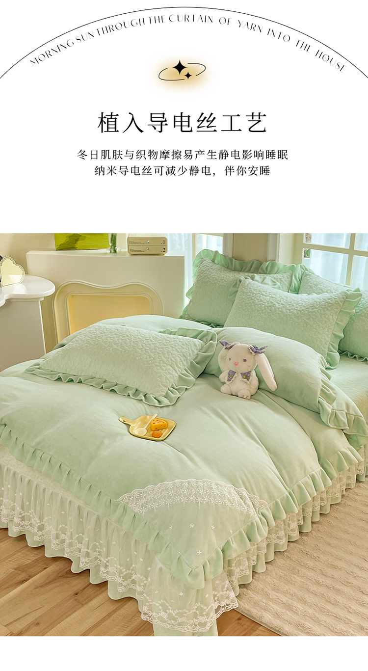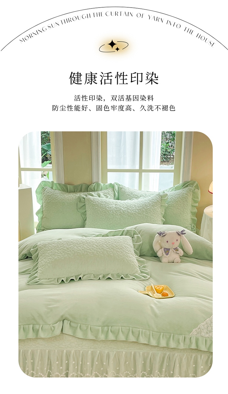 商品名称:2025秋冬新款220g全消光牛奶绒床盖四件套12斤重加厚婴儿绒法莱绒床裙款床盖款四件套 浪漫花语—新芽绿