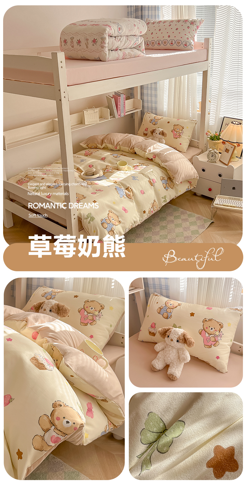 当前位置: 91家纺网 > 商品网购 > 床品套件 > 三件套 > 韩巢家纺 2025新款学生宿舍上下铺印花被套床单三件套 草莓奶熊
