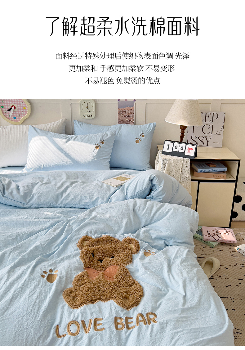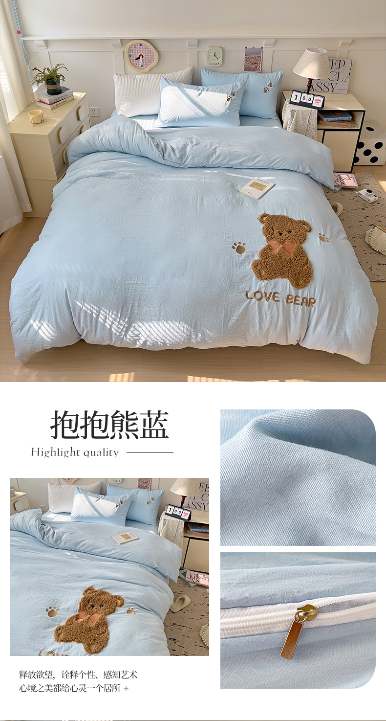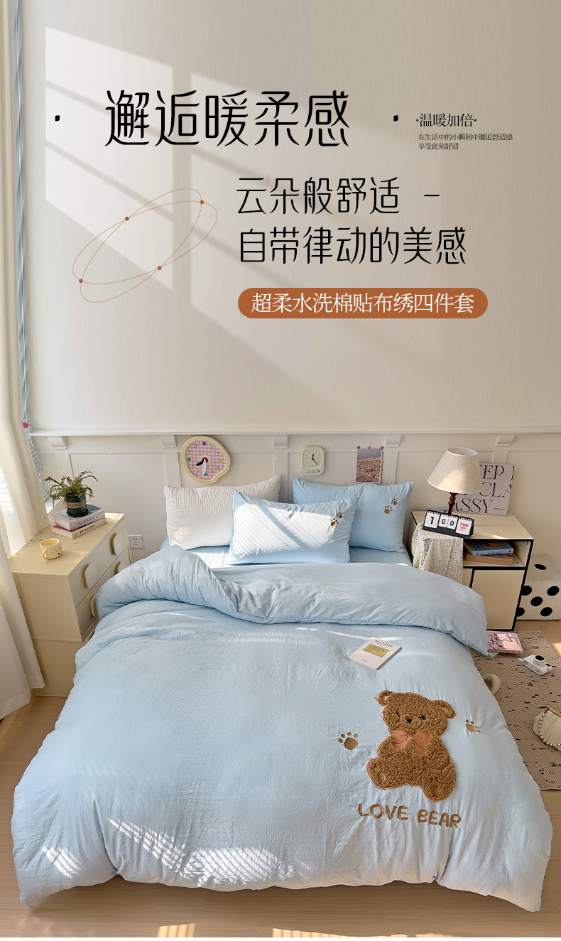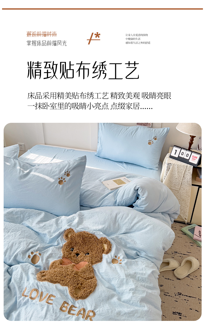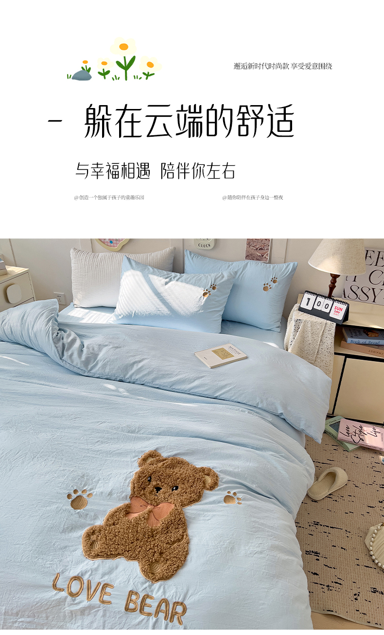 当前位置: 91家纺网 > 商品网购 > 床品套件 > 四件套 > 毛巾绣四件套 > 水墨江南 2025新款超柔水洗棉贴布绣四件套 抱抱熊蓝