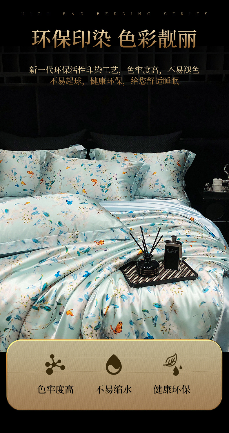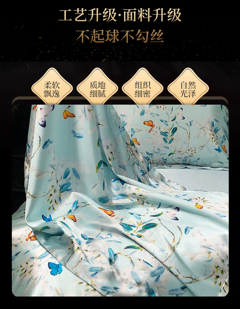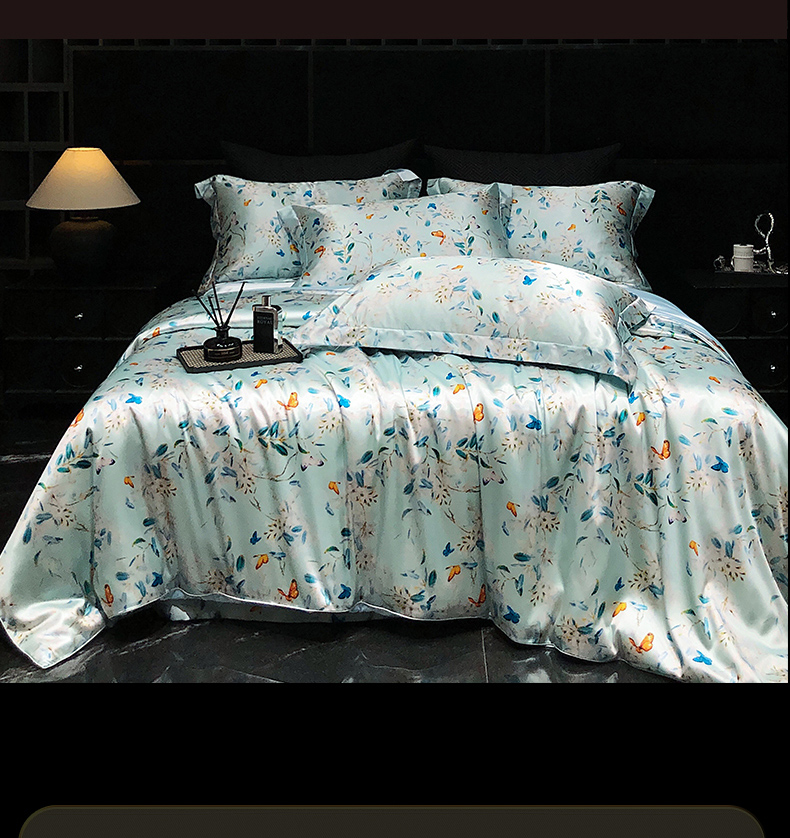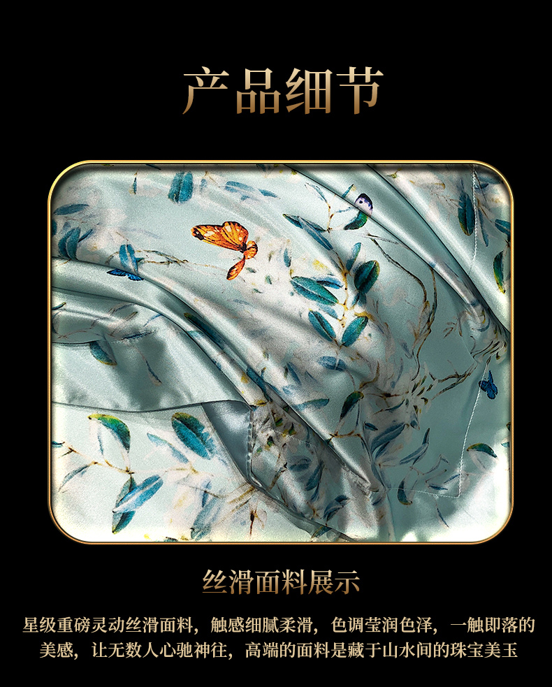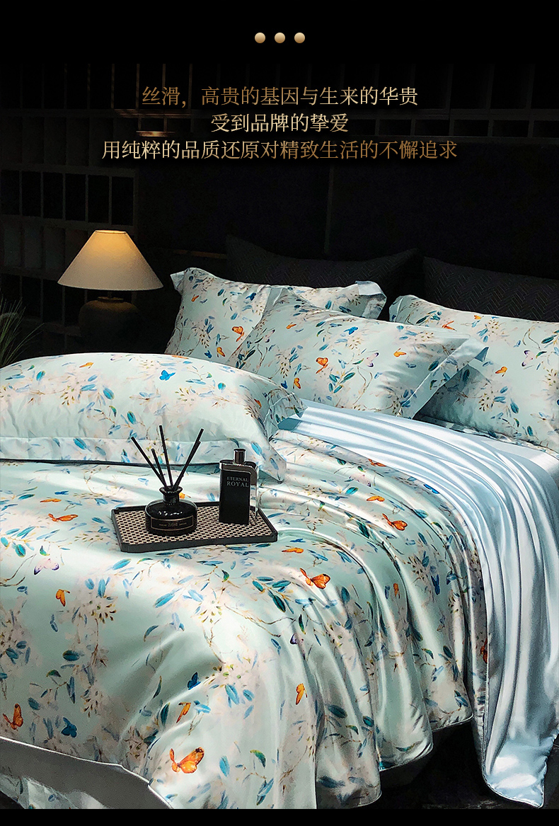 商品名称:黄鹂鸟 2025新款高端轻奢丝滑裸睡丝绸数码印花水洗真丝天丝四件套系列 -风格三 缤纷蝶梦