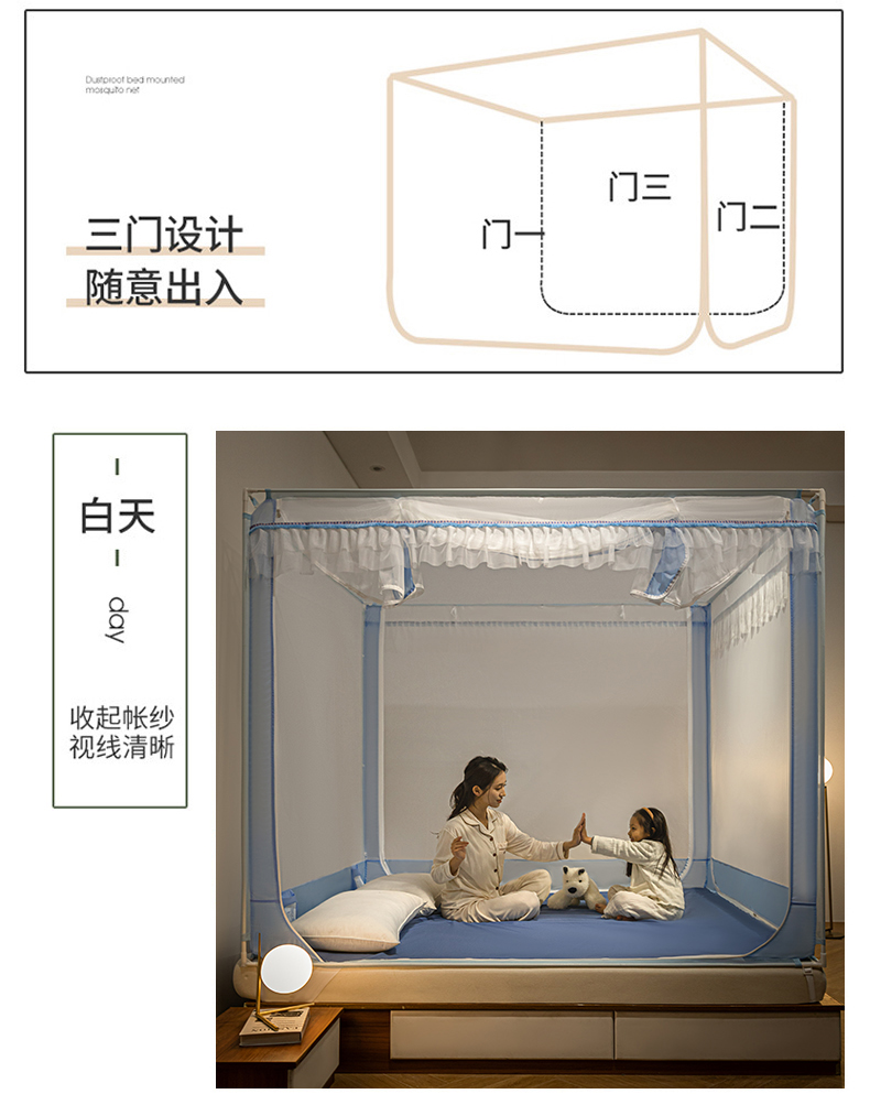 (总)飞轮海蚊帐 2023新款U型三开门遮光坐床蚊帐-Z-75,黛蓝,奶油黄,香槟