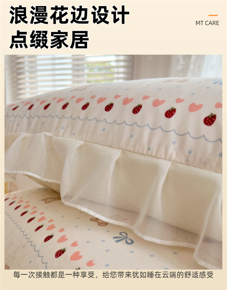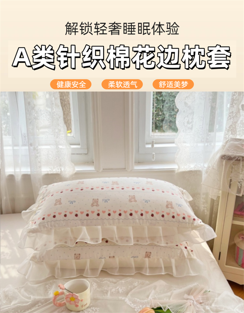 商品名称:圣比熊 2025新款针织棉双层纱花边枕头套双人枕套枕芯套宿舍单人枕头内胆套 花边款-草莓熊宝