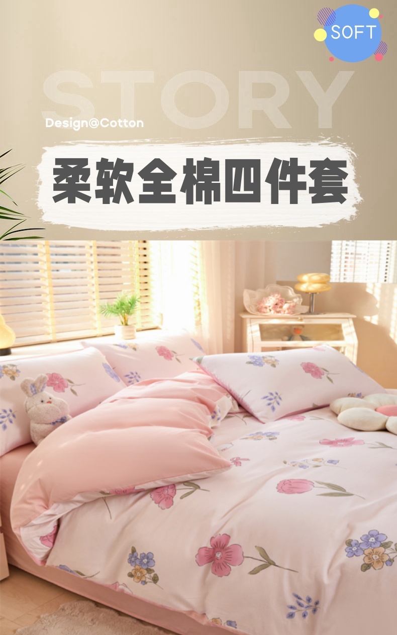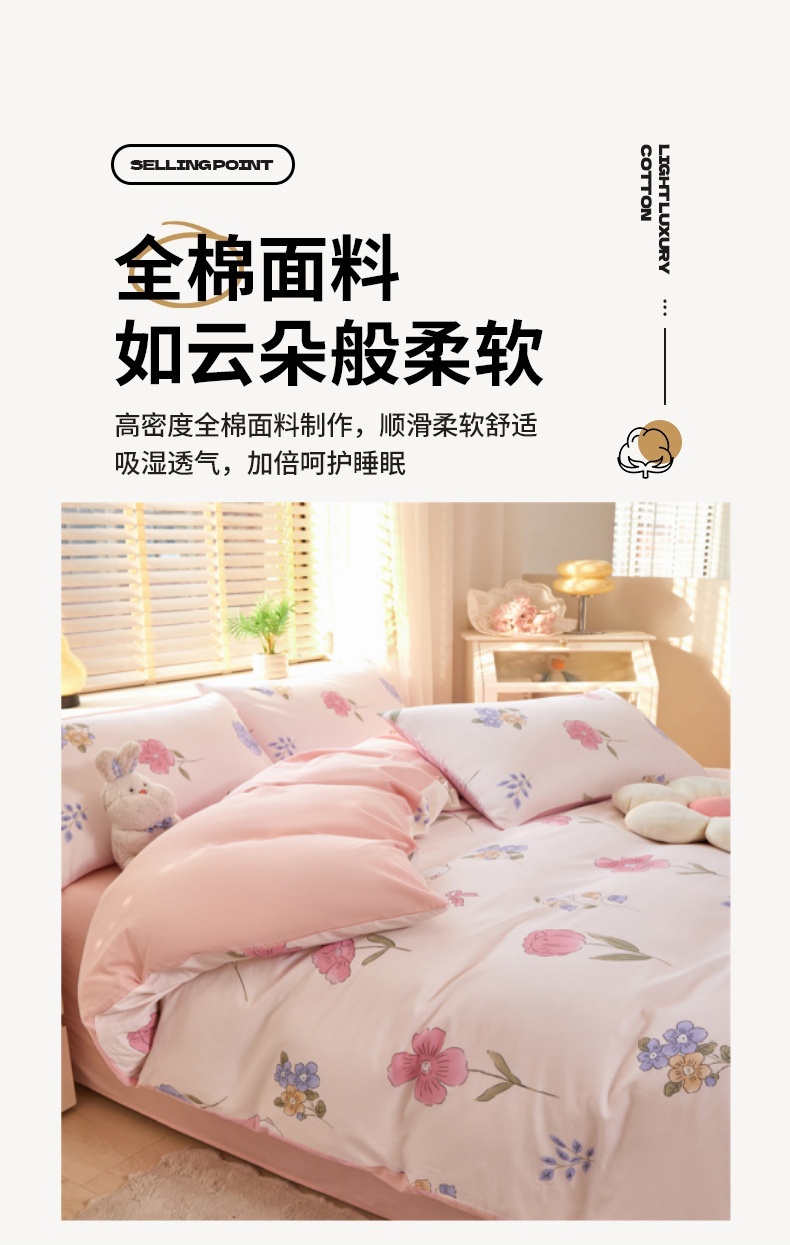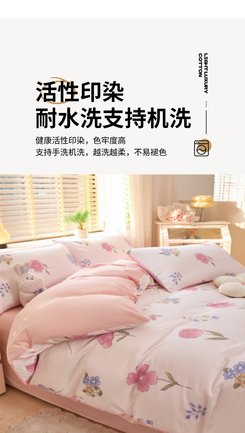 商品名称:梦舒羽2025新款全棉小清新印花加厚宿舍床单床裙款四件套 花丛小兔-全棉