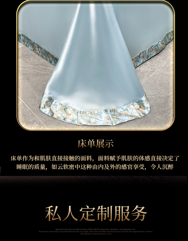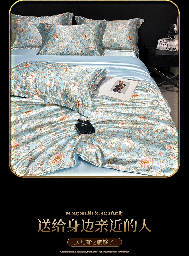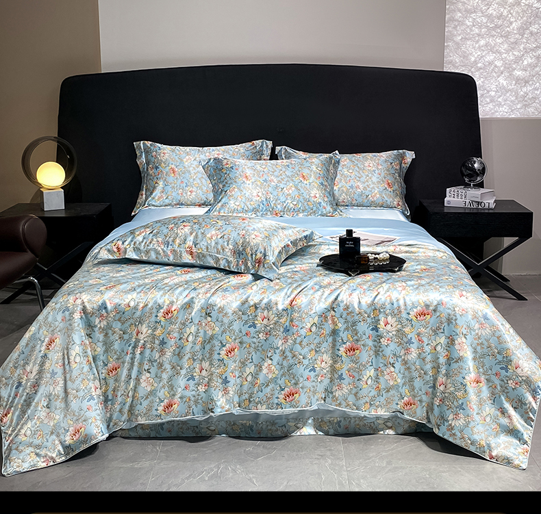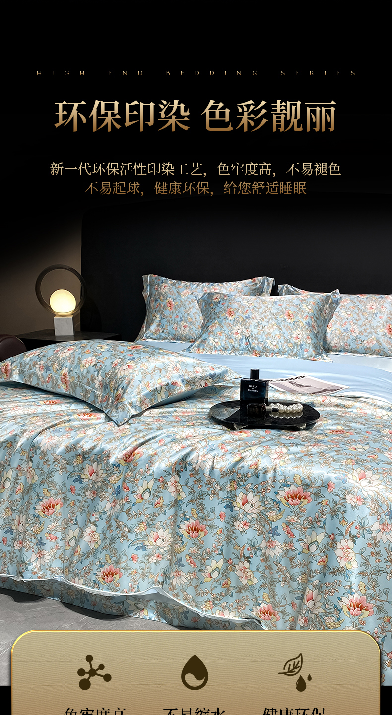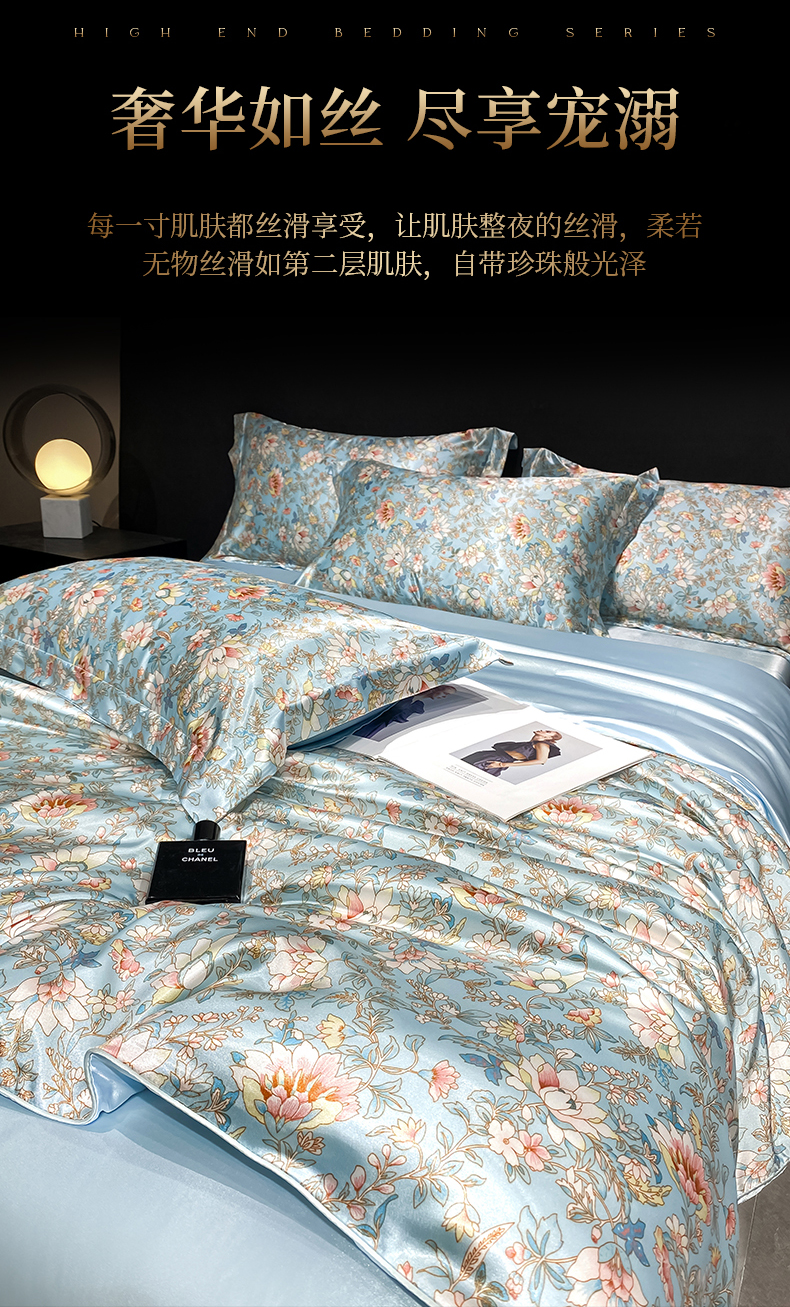 黄鹂鸟 2025新款高端轻奢丝滑裸睡丝绸数码印花水洗真丝天丝四件套系列 -风格四 小碎花-蓝