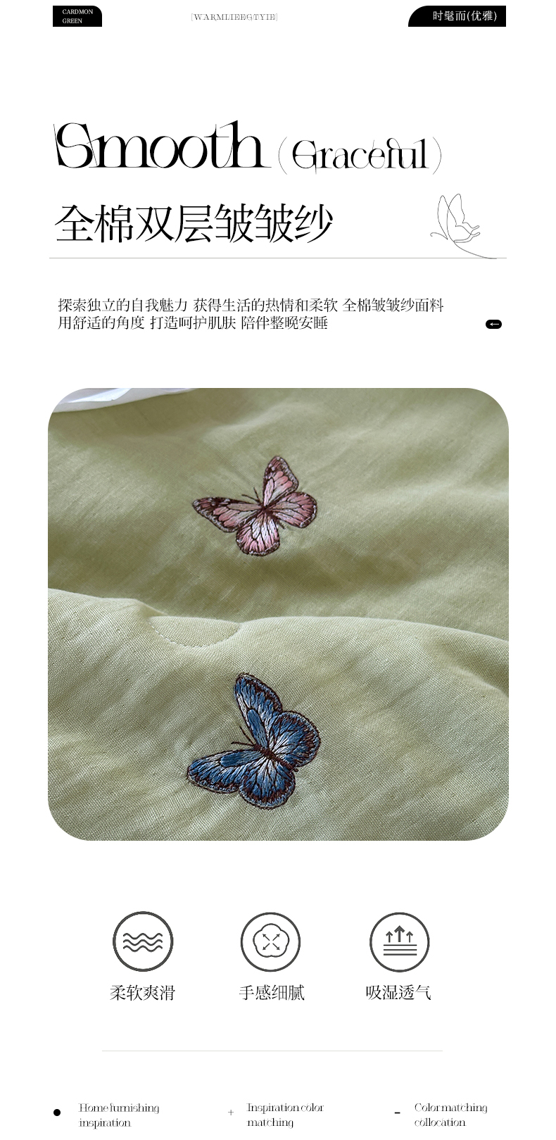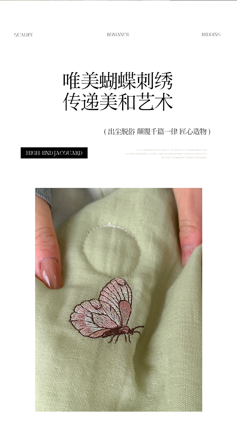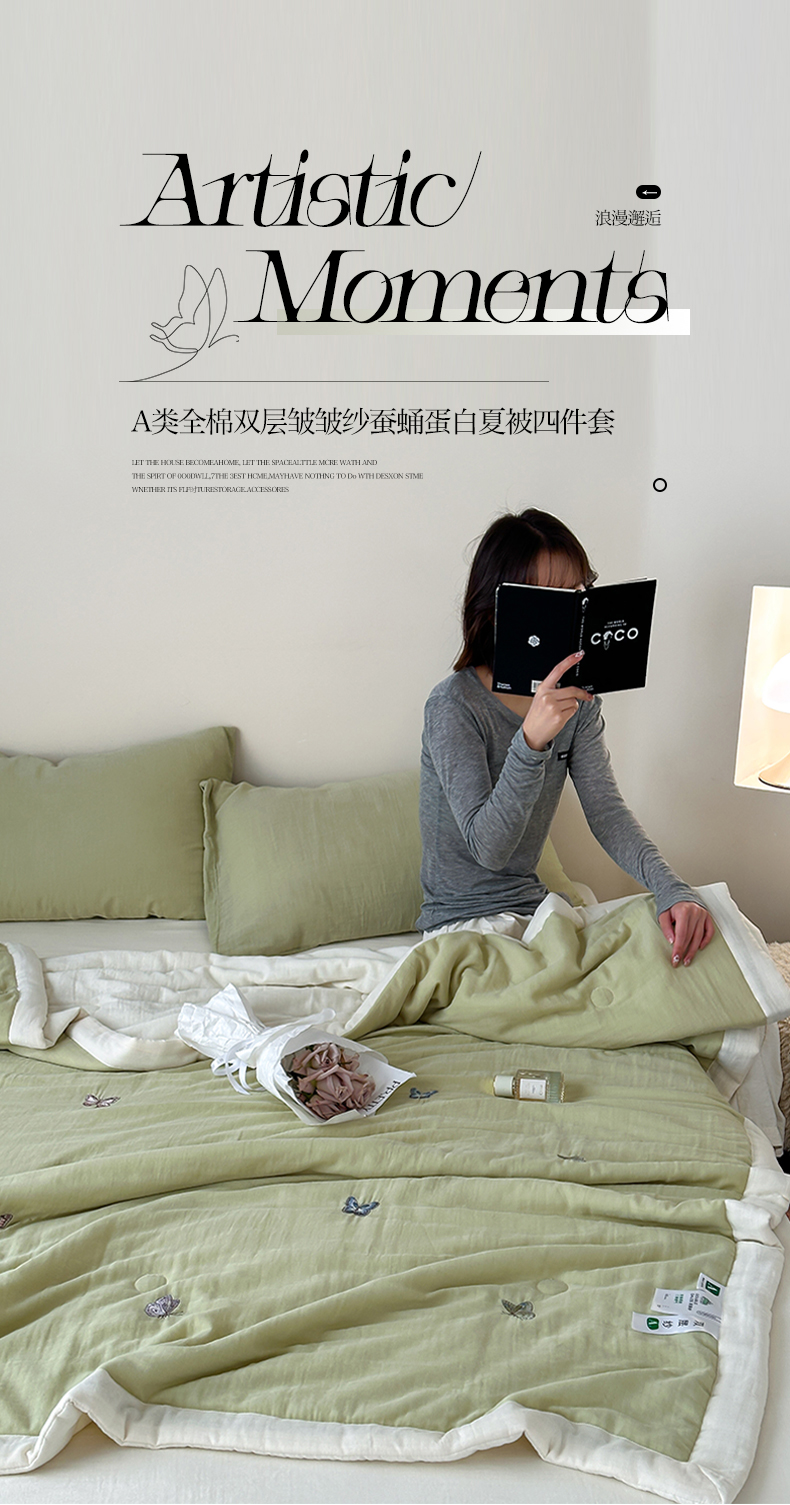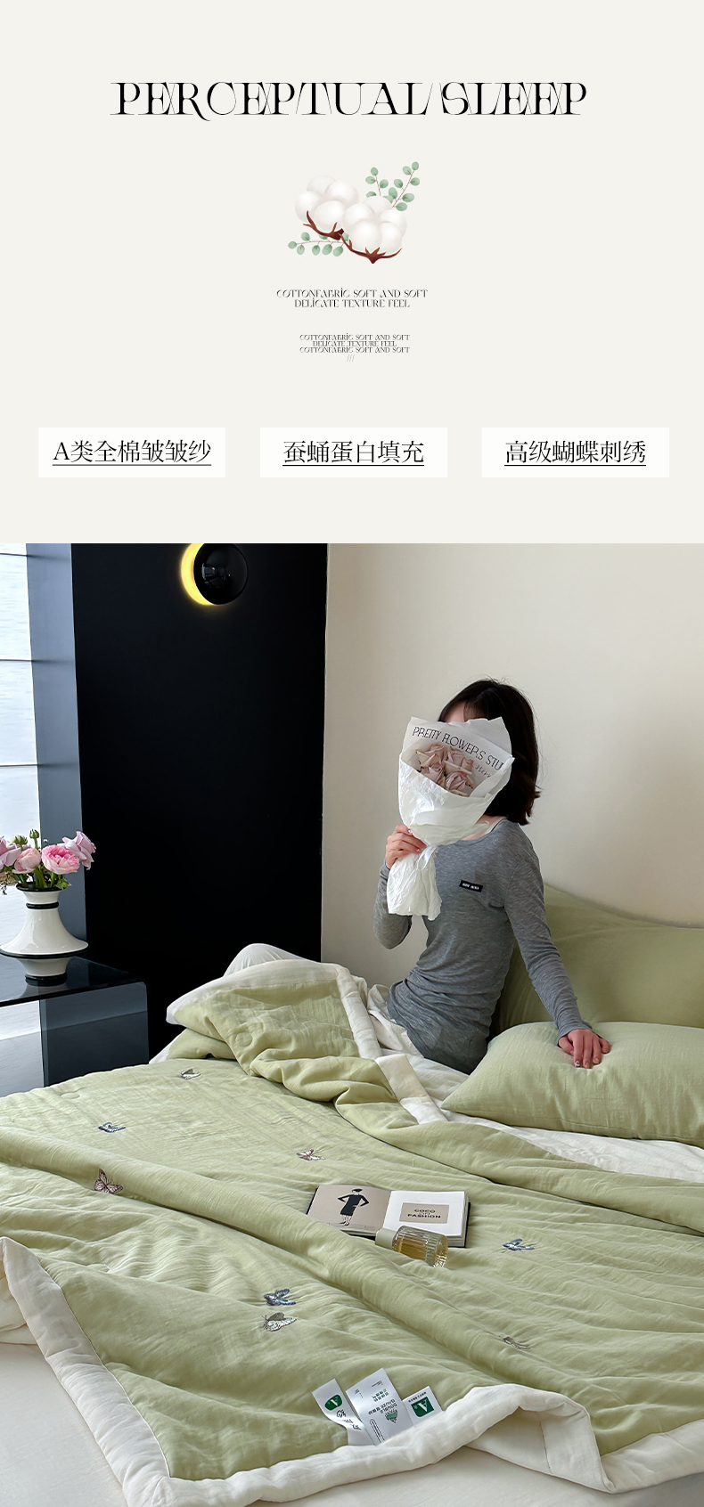 当前位置: 91家纺网 > 商品网购 > 床品套件 > 四件套 > 夏被四件套 > 一加一 2025新款A类全棉双层皱皱纱蚕蛹蛋白夏被四件套(蝶梦系列) 蝶梦-奶绿白