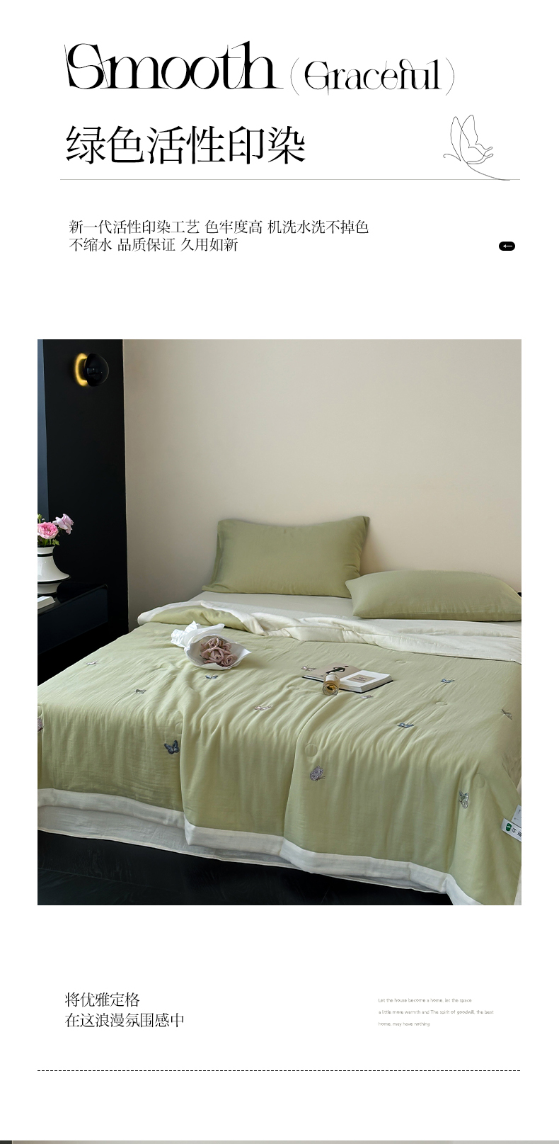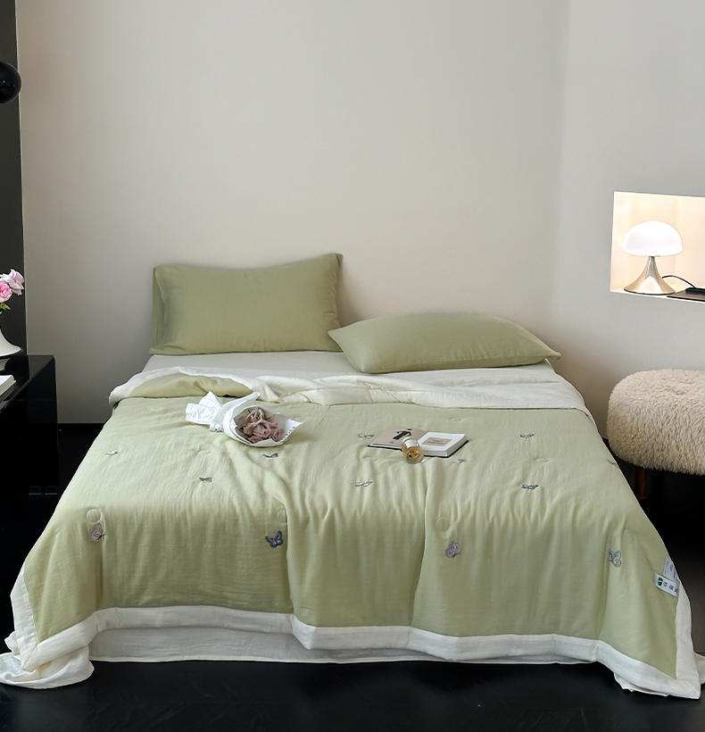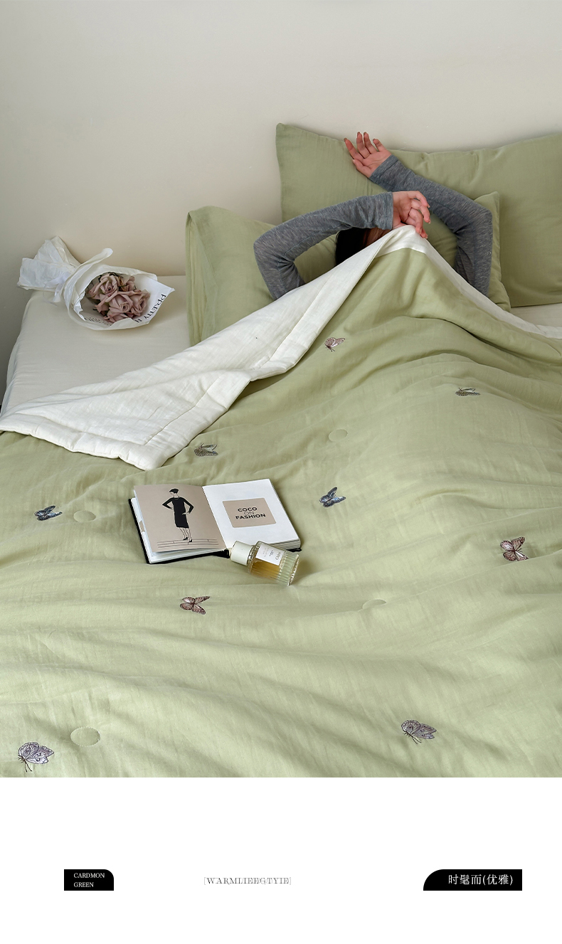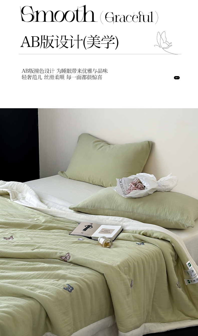 当前位置: 91家纺网 > 商品网购 > 床品套件 > 四件套 > 夏被四件套 > 一加一 2025新款A类全棉双层皱皱纱蚕蛹蛋白夏被四件套(蝶梦系列) 蝶梦-奶绿白