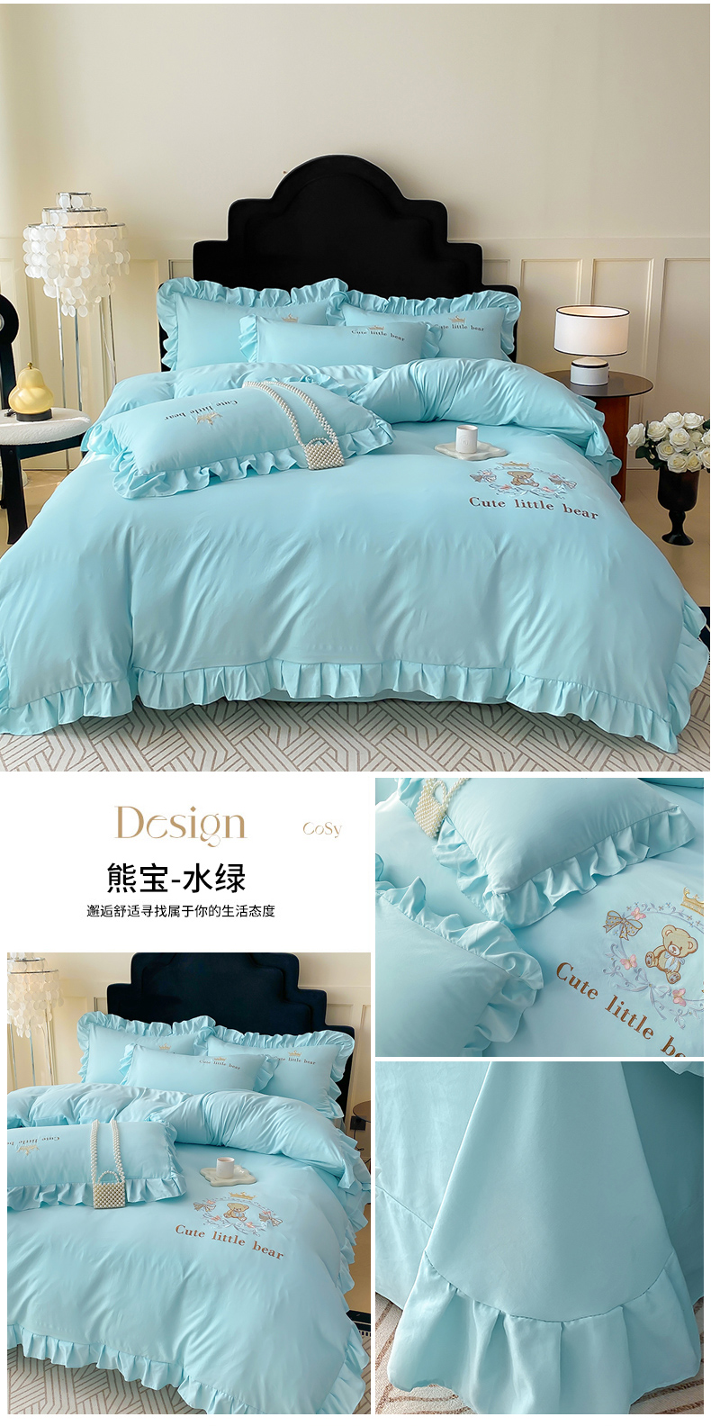 帝菲妮 2025新款法式韩版高克重超柔水洗棉针织棉糯小棉刺绣四件套 熊宝-水绿