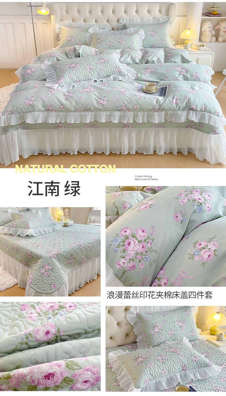 • 91家纺网 家纺一手货源 找家纺 宜凡家纺2025新款雪纺花边印花夹棉床盖三件套四件套 江南 绿