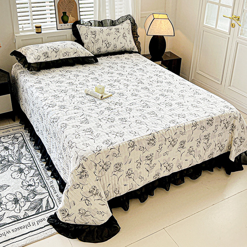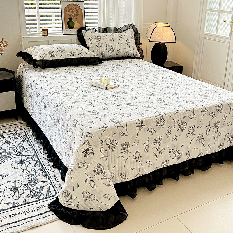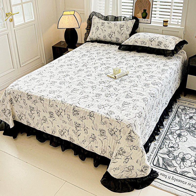 艾橙家纺2025新款法式赫本风水洗棉印花雪纺花边单床盖 水墨玫瑰