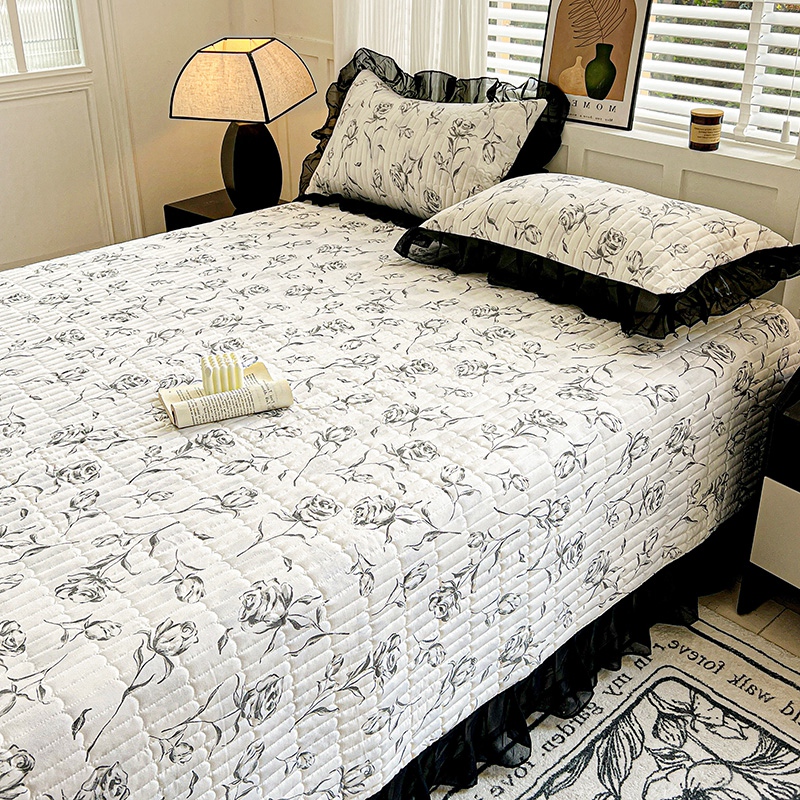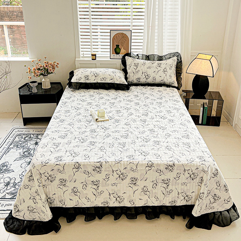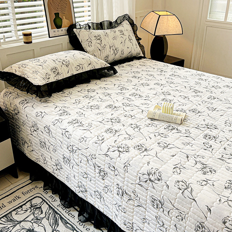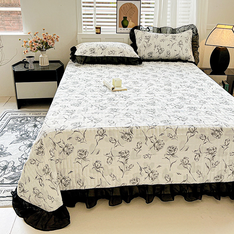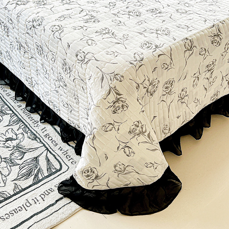 商品名称:艾橙家纺2025新款法式赫本风水洗棉印花雪纺花边单床盖 水墨玫瑰
