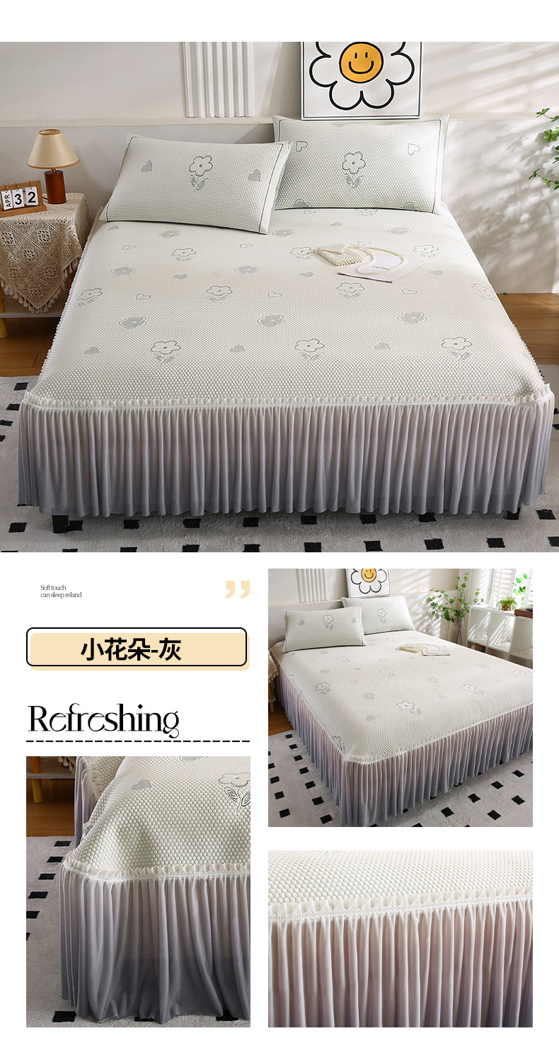 商品名称:法莱妮2025夏季新款A类真凉感丝提花三明治冰豆豆凉席床裙三件套 小花朵-灰