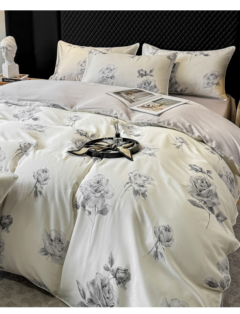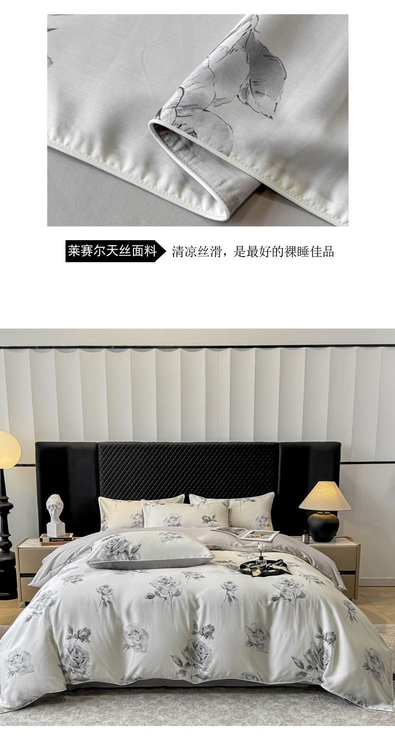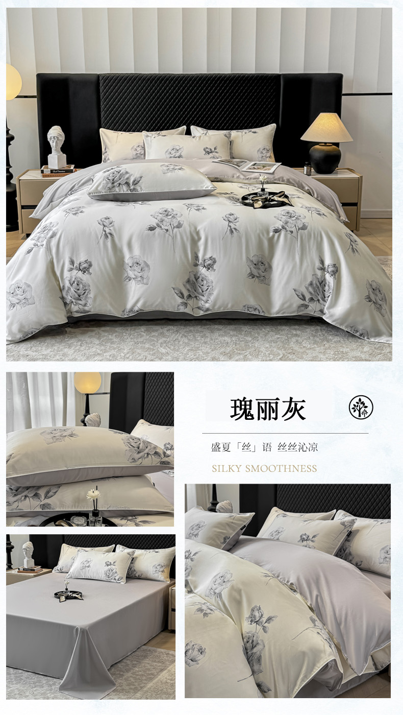 商品名称:芊寻家居 2025春夏新款50支莱赛尔天丝贡缎数码印花麻绳款四件套高端礼盒 瑰丽灰