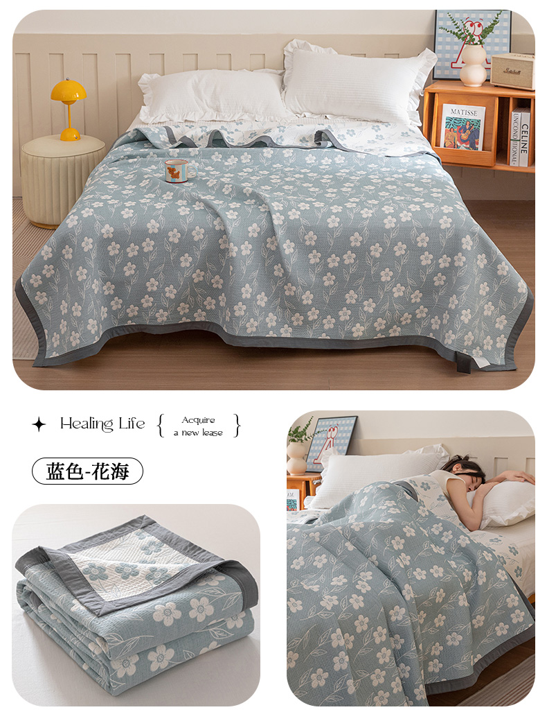 商品名称:2025新款A类纯棉针织三层纱提花多功能毯 蓝色-花海