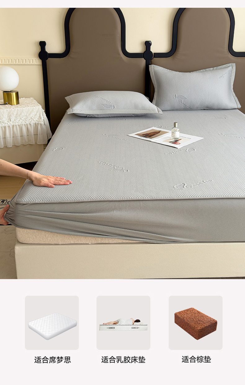 商品名称:瑞兴纺 2025新款高分子PE软凉席绣花款床笠款 床笠款-沐夕-灰