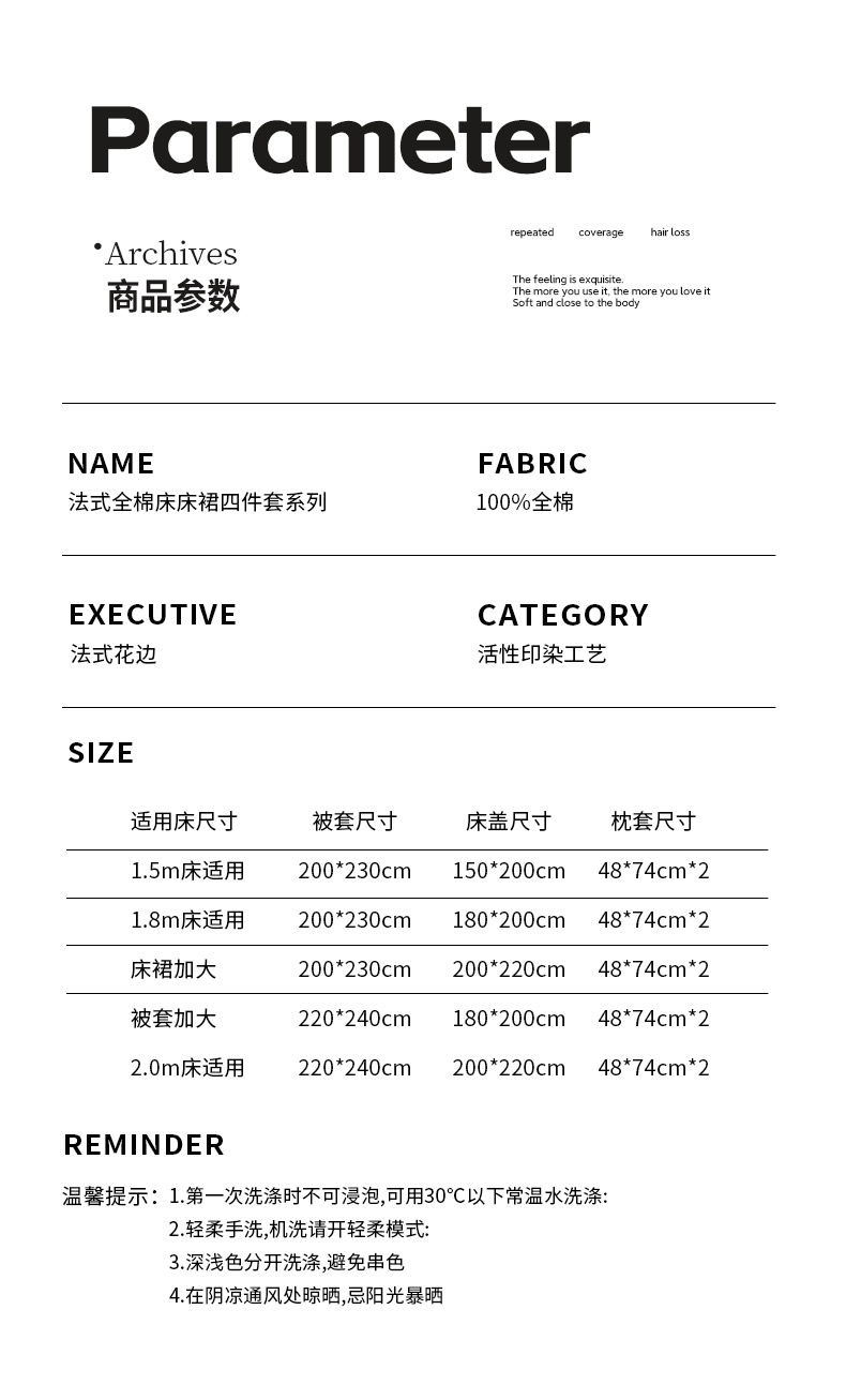 被套220*240CM*1 床裙180*200CM*1 枕套48*74CM*2四件套 | ¥250.00 |
