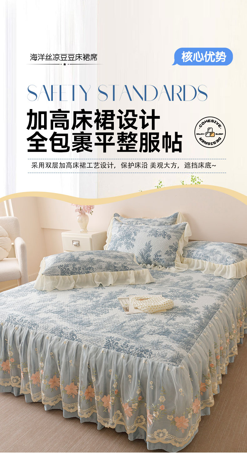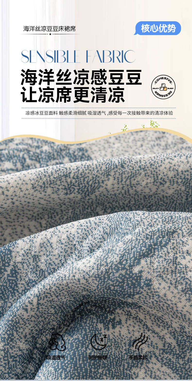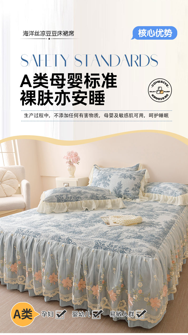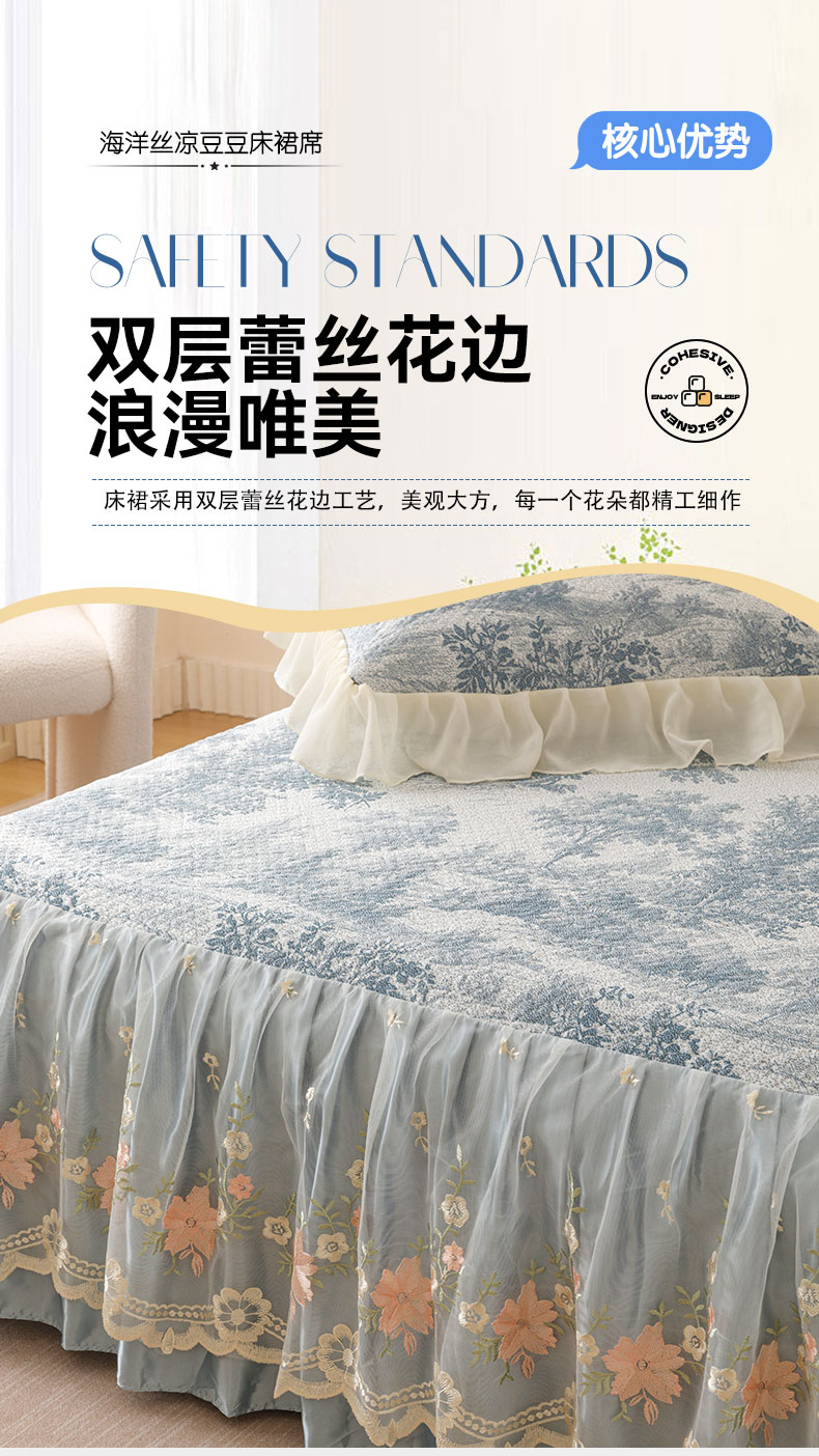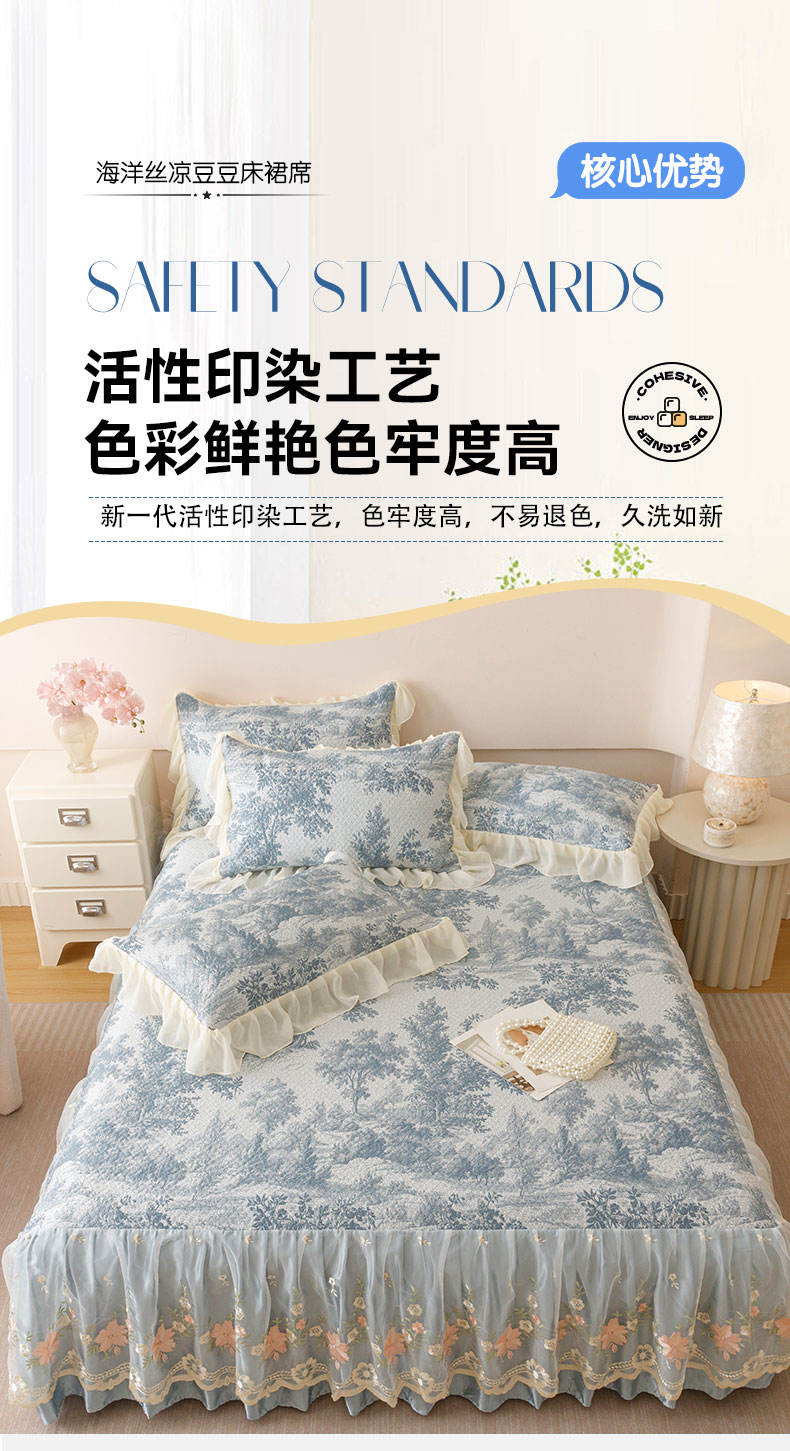 • 91家纺网 家纺一手货源 找家纺 好儿喜家纺 2025新款海洋丝凉感豆豆床裙凉席-巴黎玫瑰 挪威森林蓝