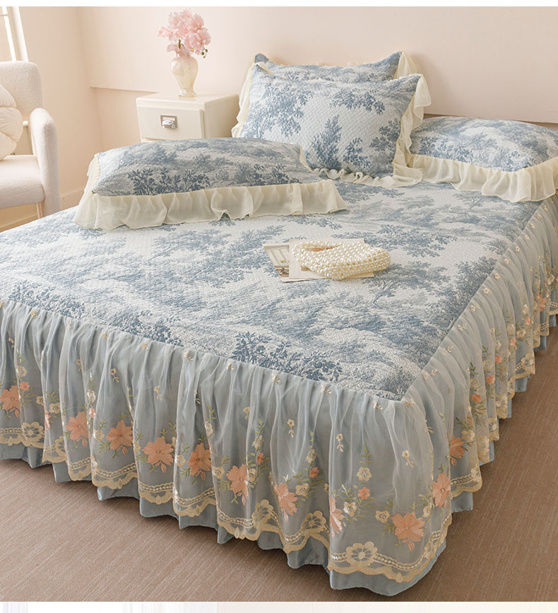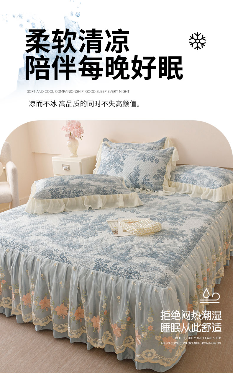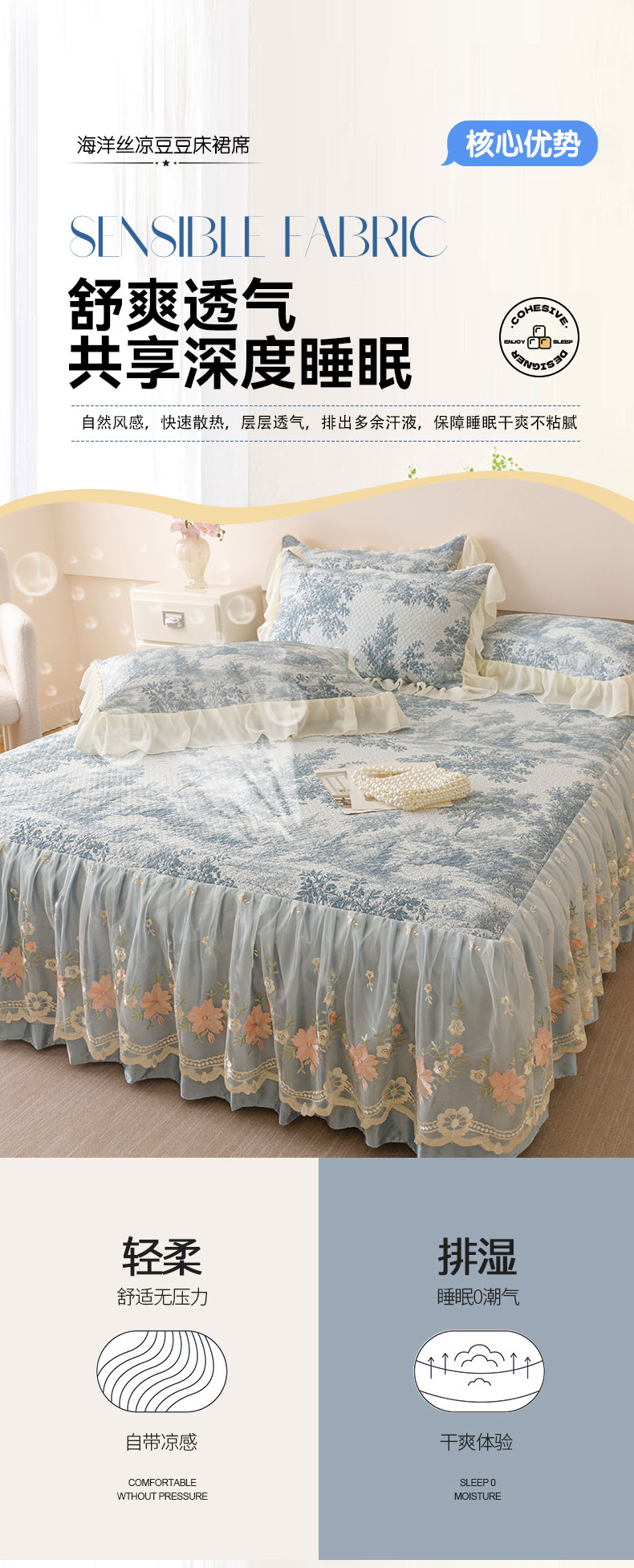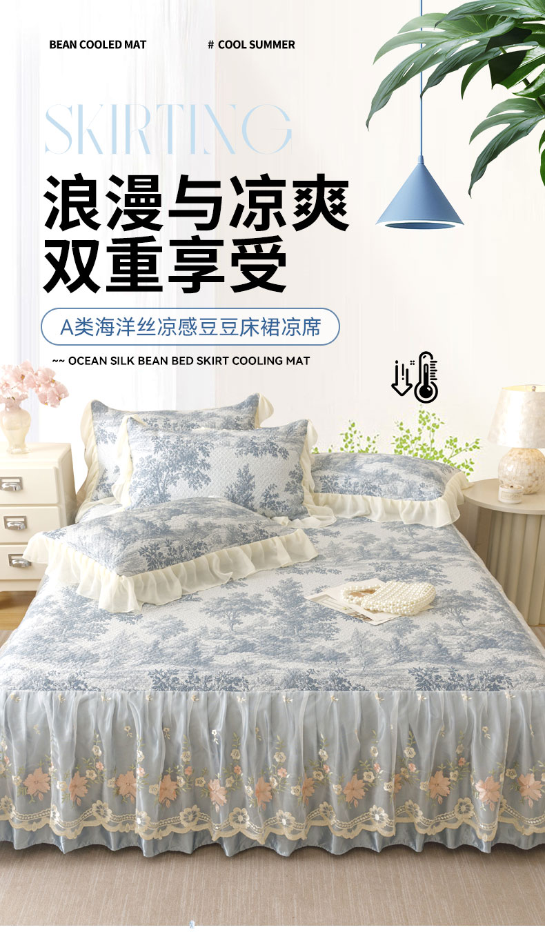 好儿喜家纺 2025新款海洋丝凉感豆豆床裙凉席-巴黎玫瑰 挪威森林蓝